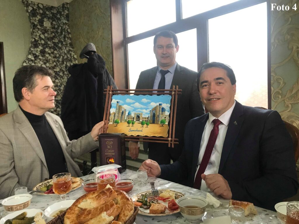В конце посиделки, кандидаты в депутаты, вручили Dr. Nowak ценные подарки в виде картины, дорогого коньяка, а так же оплатили счет рыбного ресторана на 11 персон (Фото 4). За этим процессом наблюдали прикреплённые узбекскими властями сопровождающие, которые ни на минуту не оставляли Dr. Nowak без своего пристального внимания.