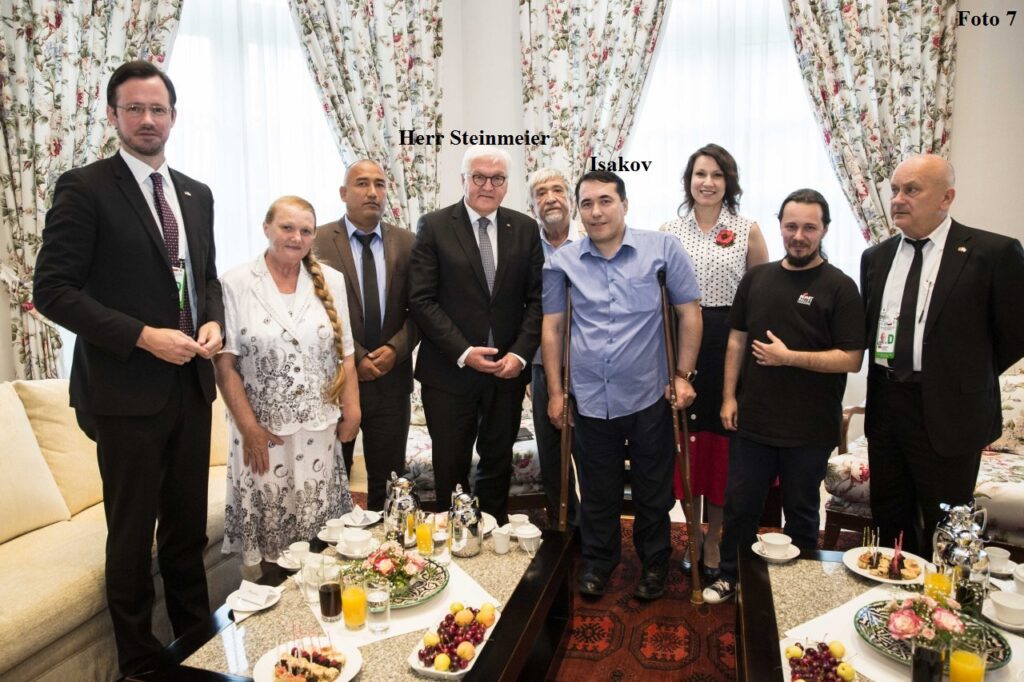 В мае 2019 года, Федеральный президент ФРГ Франк-Вальтер Штайнмайер находился с официальным визитом в Узбекистане. Во время встречи с представителями гражданского общества, узбекские спецслужбы представили отпетого мошенника Исакова неким «борцом за права инвалидов» (Фото 7). Исаков был осужден уголовным судом города Ташкента за вымогательство взятки у инвалида, хищение имущества общественной организации, фальсификация документов, мошенничество.