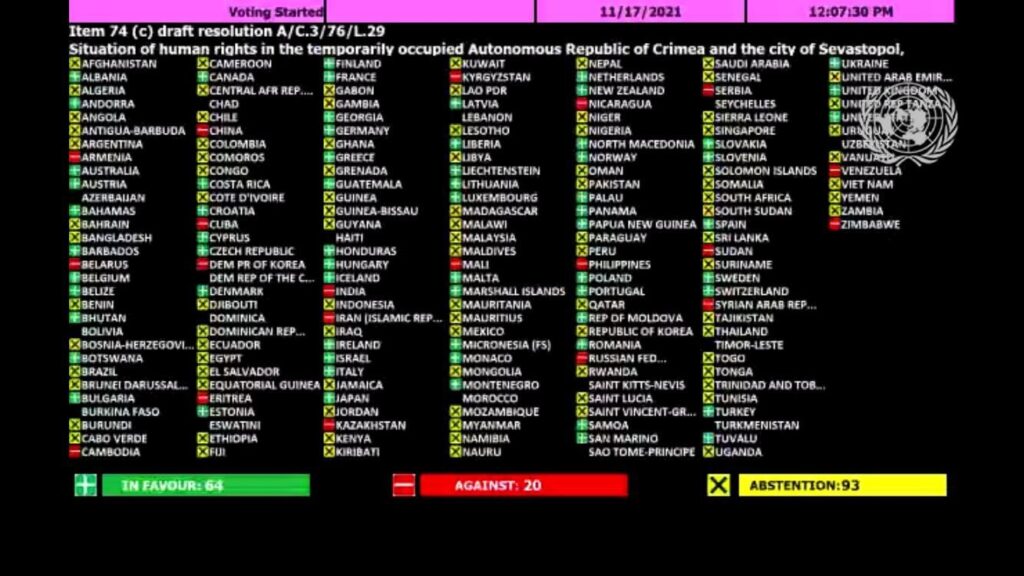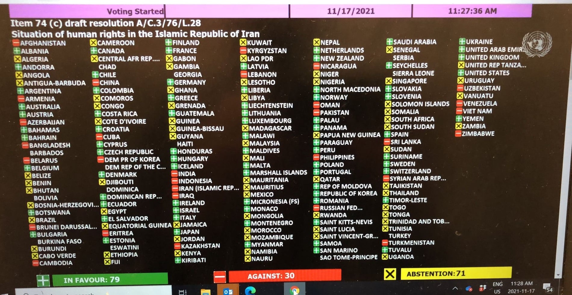 17 ноября 2021 года на 76-й сессии Генеральной ассамблеи ООН, Узбекистан в числе 30 стран (Китай, Россия, Беларусь, КНДР, Пакистан, Венесуэла, Казахстан, Кыргызстан, Туркменистан, и т.д.) проголосовал ПРОТИВ осуждения нарушений прав человека в Иране (Фото-1).