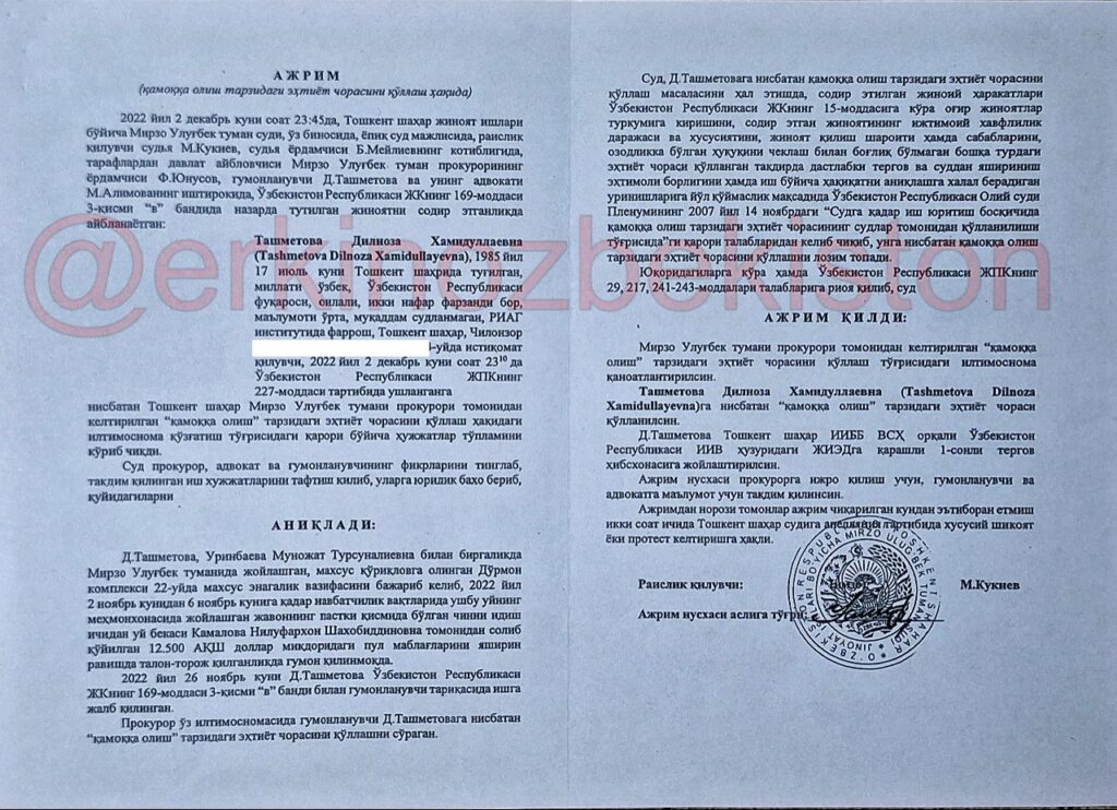 По версии следствия, находясь в 22-ом доме особо охраняемого комплекса “Дурмень” в качестве домработниц, в период с 2 по 6 ноября 2022 года, Дильноза Тошматова вместе с Муноджат Уринбаевой похитили у домохозяйки (!) Нилуфархон Камаловой (старшая дочь председателя Сената Олий Мажлиса Республики Узбекистан Танзилы Нарбаевой) 12500 долларов США, которая хранила их на нижней полке серванта в фарфоровом сосуде.
