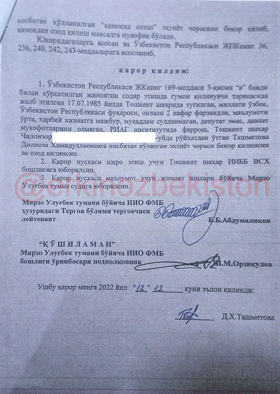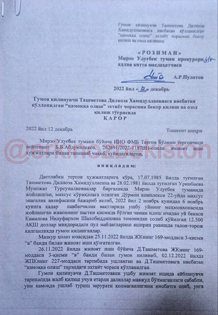 12.12.2022 года, следователь следственного отдела УКД ОВД Мирзо-Улугбекского района лейтенант Б.Абдумаликов вынес решение об освобождении подозреваемой Дильнозы Тошматовой из-под стражи. Домохозяйка Нилуфархон Камалова написала новое заявление, в котором указывала, что украденные деньги в размере 12500 долларов США “нашлись сами собой”, и отзывала свое предыдущее заявление. Дело закрыто!