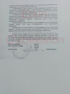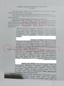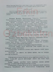 Несмотря на наличие многочисленных нестыковок и противоречий в деле подполковника Рахманова, 9 января 2025 года судебная коллегия Военного суда Республики Узбекистан, заседавшая в закрытом режиме, приговорила его к 16 годам лишения свободы в колонии общего режима по части первой статьи 157 «Измена государству» Уголовного кодекса Узбекистана (смотри ниже первую и две последние страницы текста приговора. Документ представлен на узбекском языке).