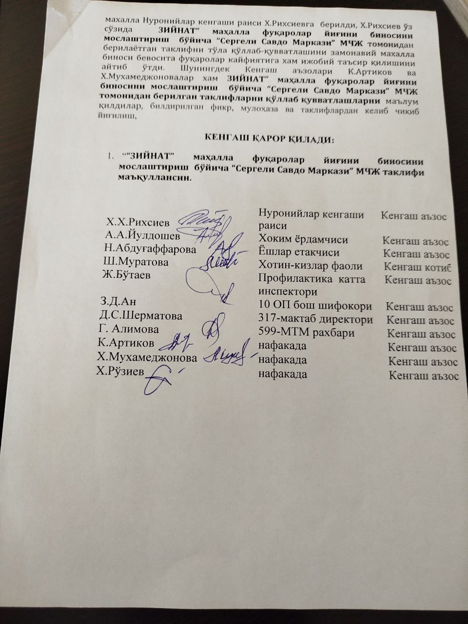 Используя институт махалли (городской квартал или сообщество) в качестве юридического прикрытия, в 2024 году хоким Ташкента Шавкат Умурзаков вынес решение о передачи территории автостоянки махалли “Зийнат” Сергелийского района. 10 февраля 2024 года председатель схода граждан махалли “Зийнат” Бекмирза Абдурахимов провёл собрание, которое приняло решение передать часть территории автостоянки новому собственнику ООО “Сергели Савдо Маркази” для строительства 4-х этажного здания.
