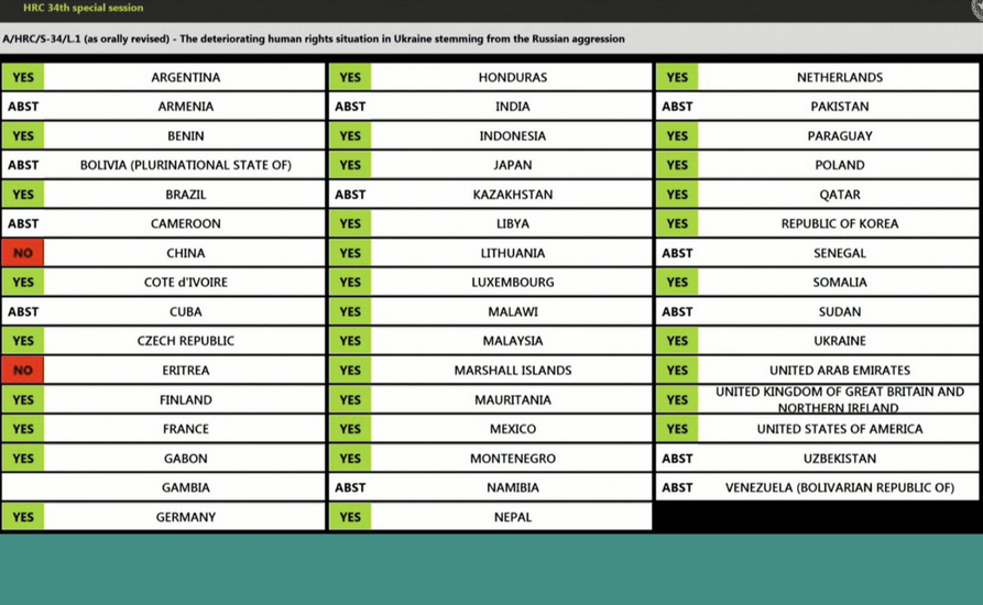 12.05.2022 года Совет ООН по правам человека принял резолюцию о начале расследования военных преступлений российских войск в Украине. "За" резолюцию проголосовали представители 33 стран, Китай и Эритрия проголосовали - "Против", Представители 12 государств