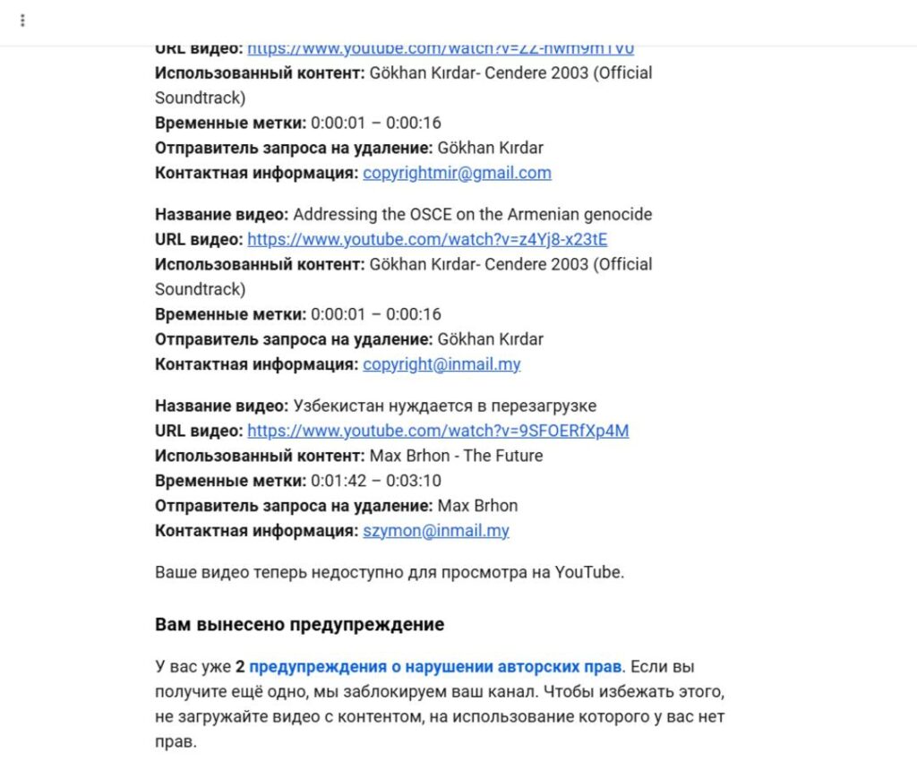 According to YouTube’s notifications, the takedown requests were submitted by users “Gökhan Kırdar” and “Max Brhon”, with the following contact details: copyrightmir@gmail.com, copyright@inmail.my, szymon@inmail.my.