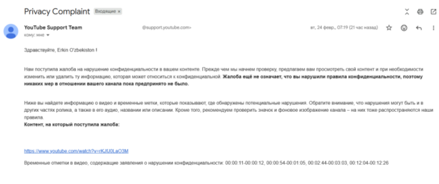 On 24 February at 07:19 Central European Time, YouTube’s legal department sent us two notifications alleging violations of privacy in content on the “Erkin O’zbekiston” channel. The complaints concern videos published in the spring of 2025: “16 лет тюрьмы за правду” (16 Years in Prison for the Truth) and “Haqiqat uchun 16 yillik qamoq” (16 Years in Prison for the Truth).