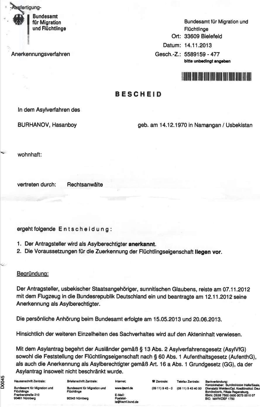 В 2013 году власти Германии предоставили Бурханову политическое убежище по §16а Основного Закона Федеративной Республики Германия.