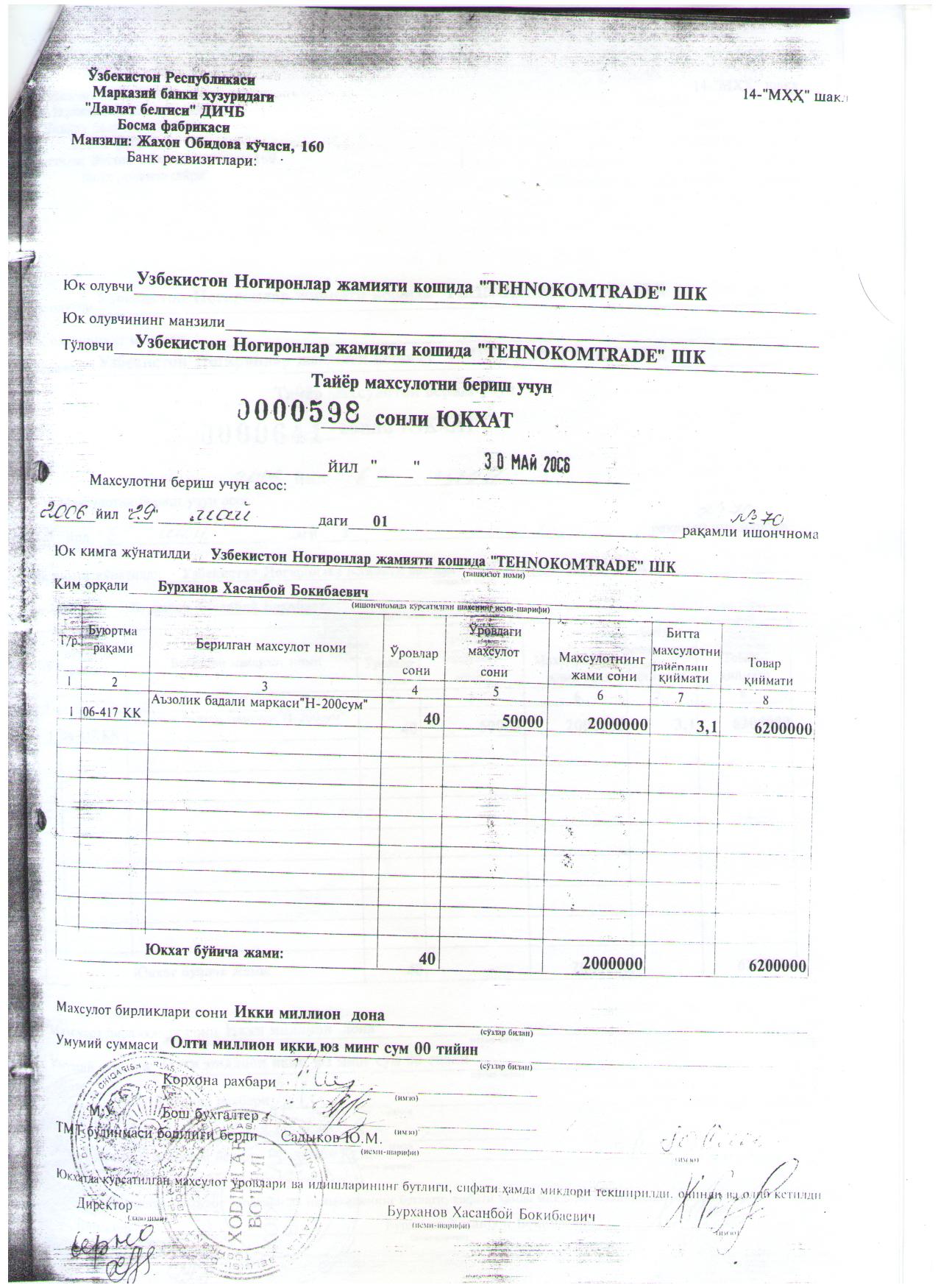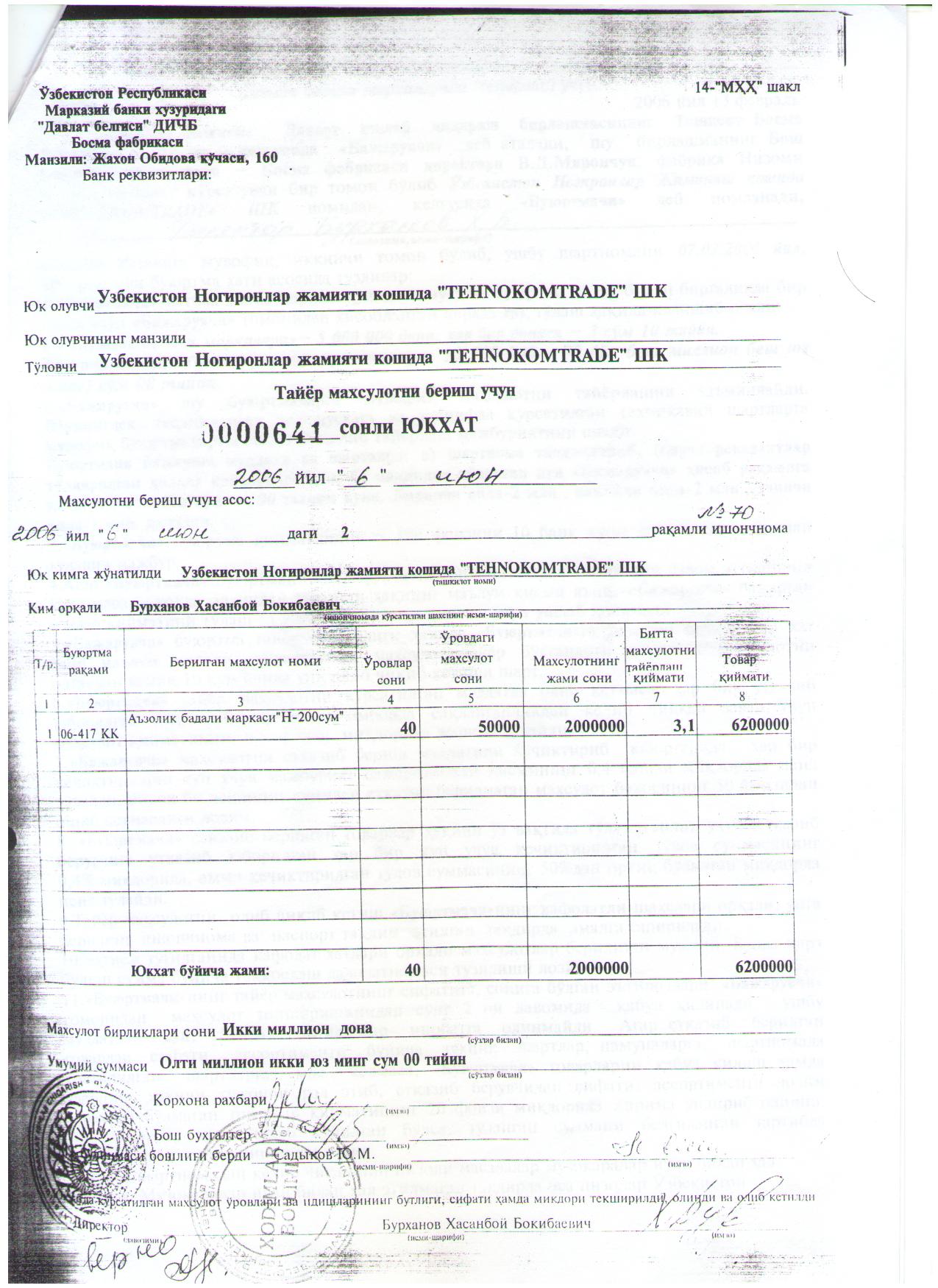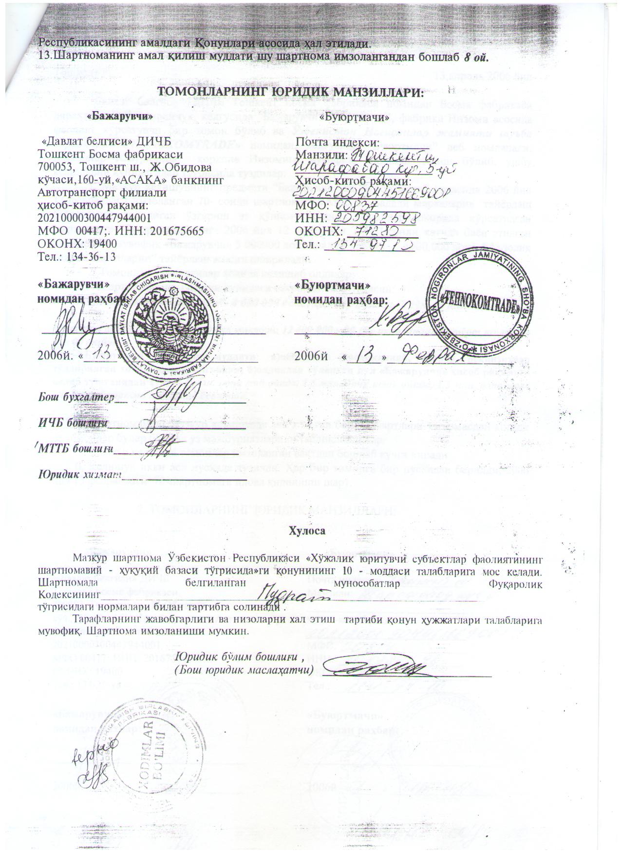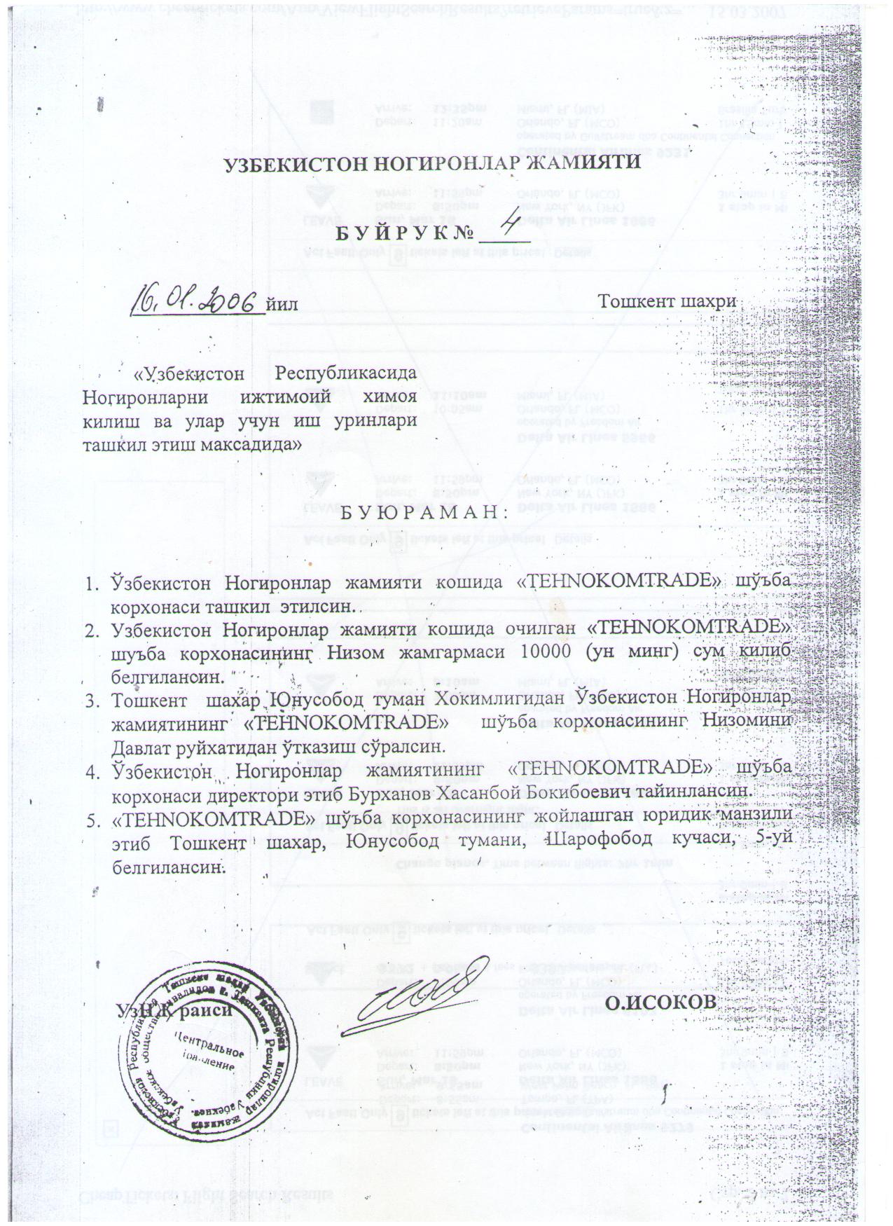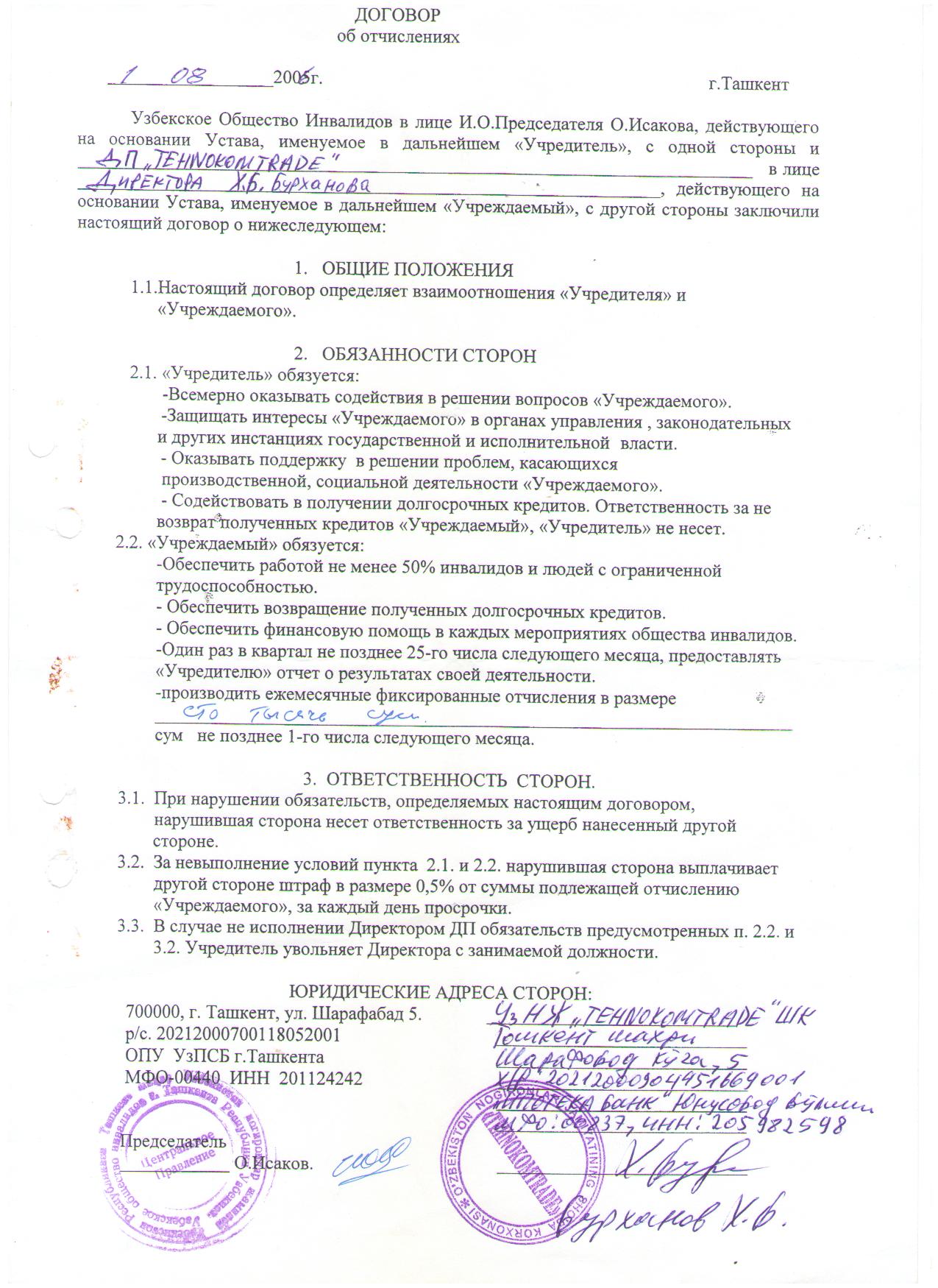 По приглашению руководства Узбекского общества инвалидов, 16 января 2006 года Бурханов был назначен директором дочернего предприятия “Tehnokomtrade” (далее – предприятие)