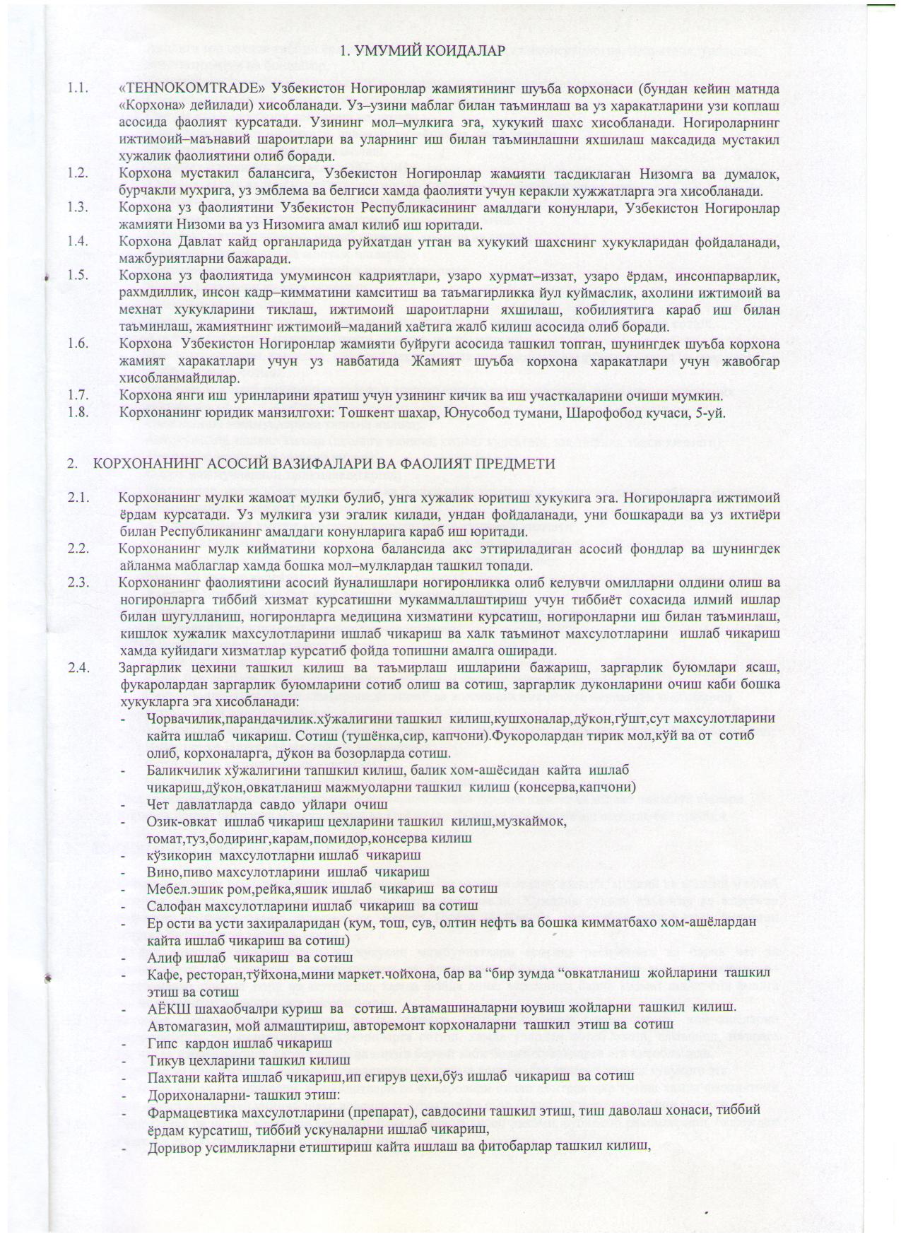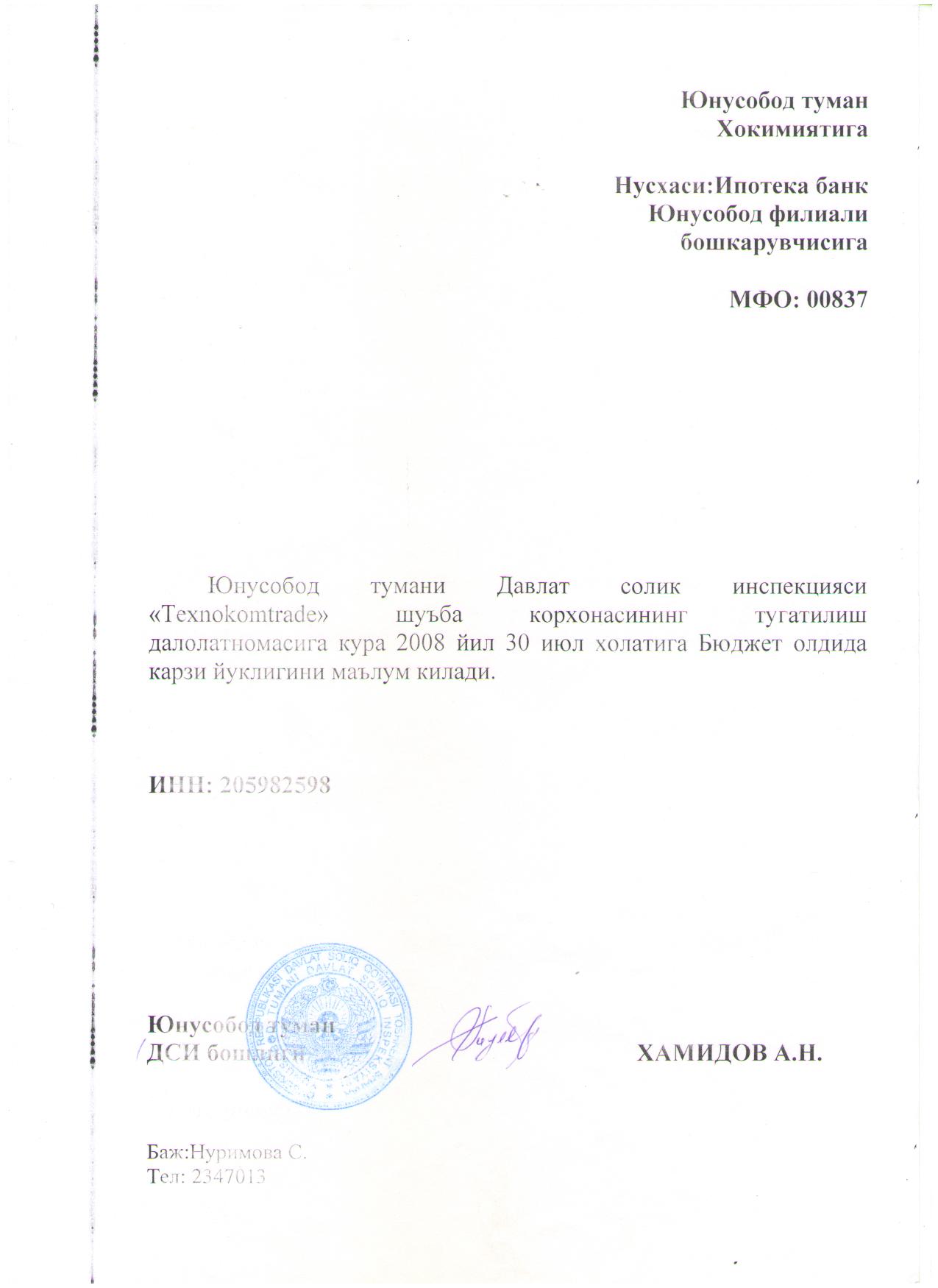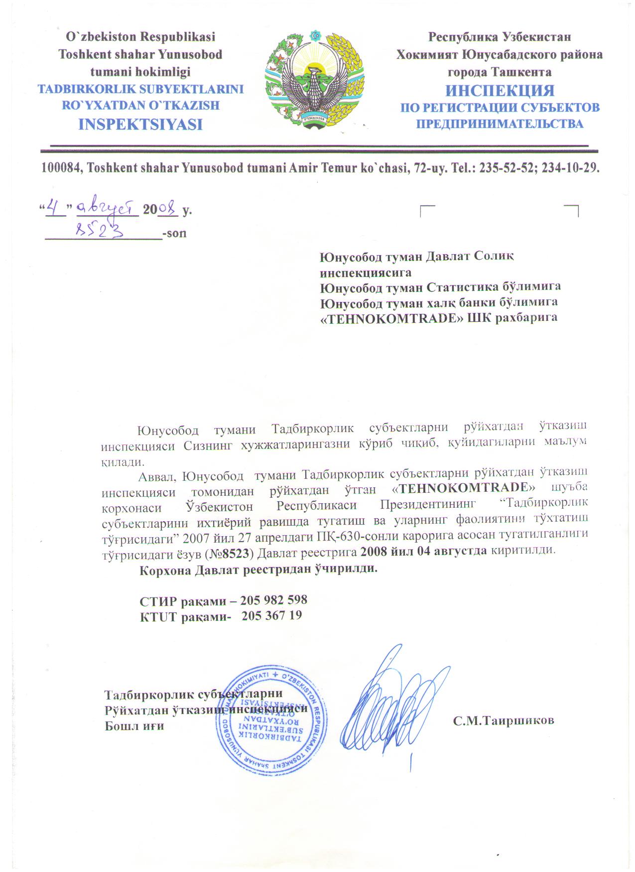 Письмом № 8523 от 04.08.2008 г. Инспекция по регистрации субъектов предпринимательства Хокимията Юнусабадского района г. Ташкента уведомила соответствующие государственные органы об исключении ДП “Tehnokomtrade” из государственного реестра.