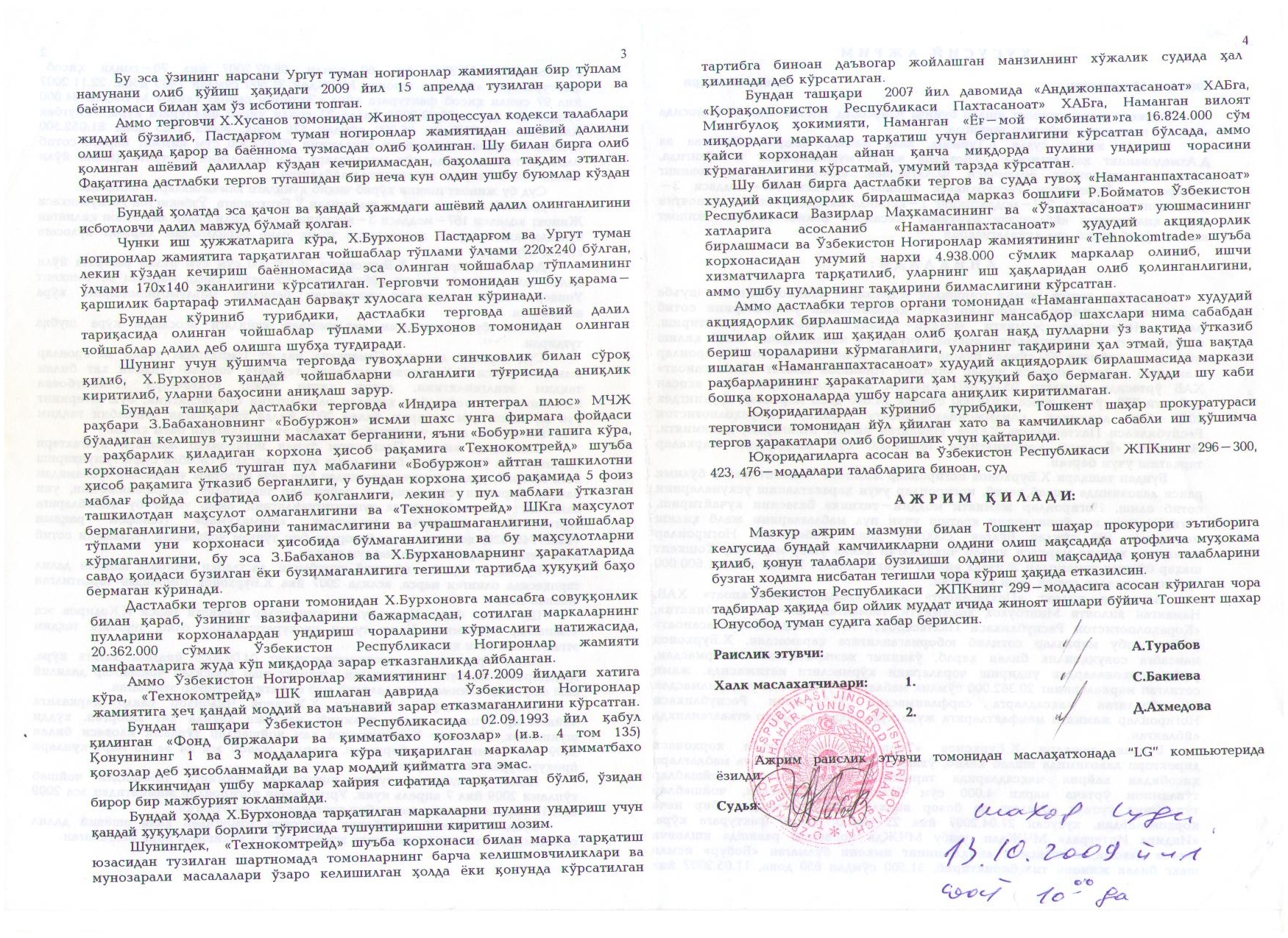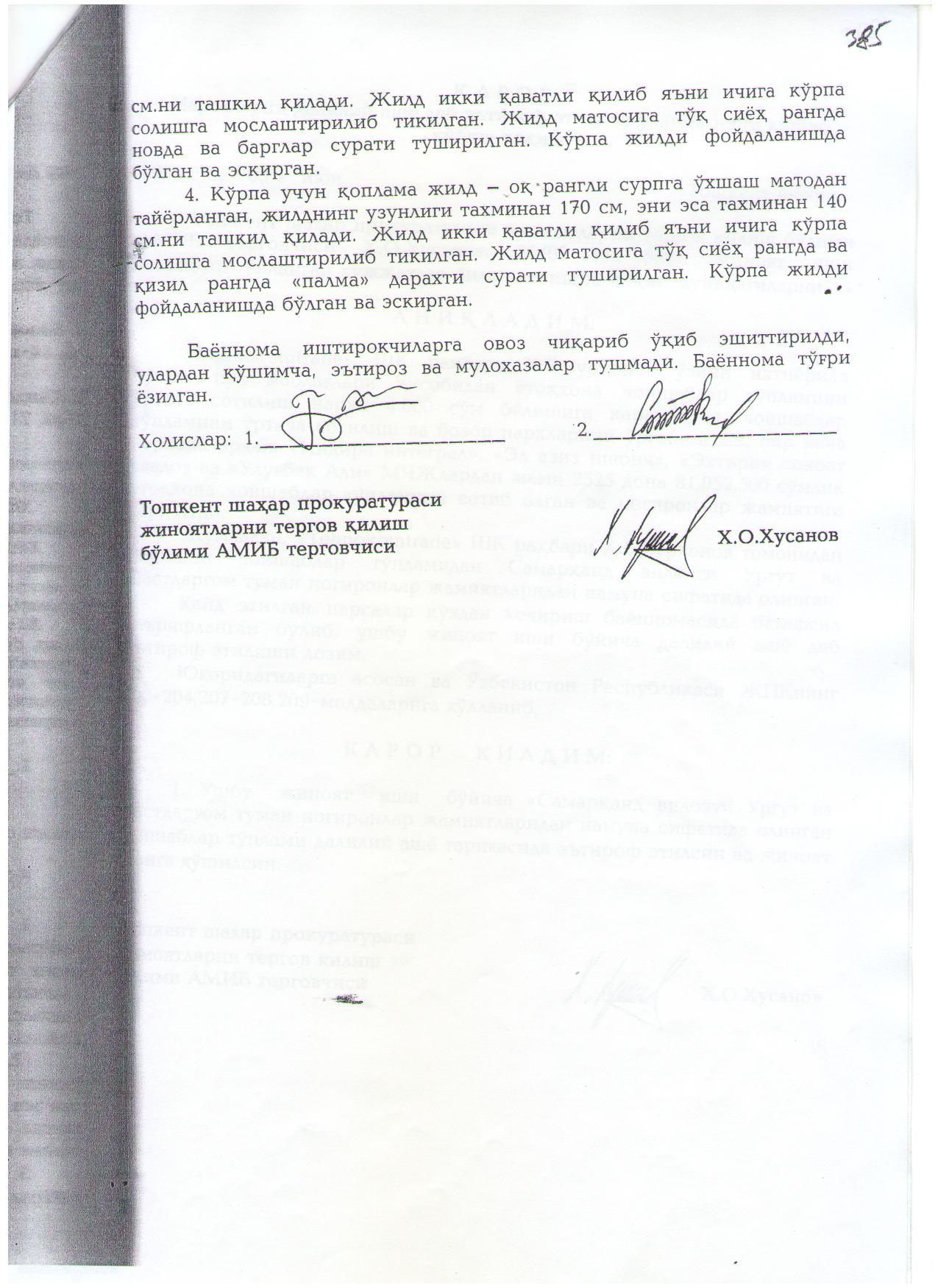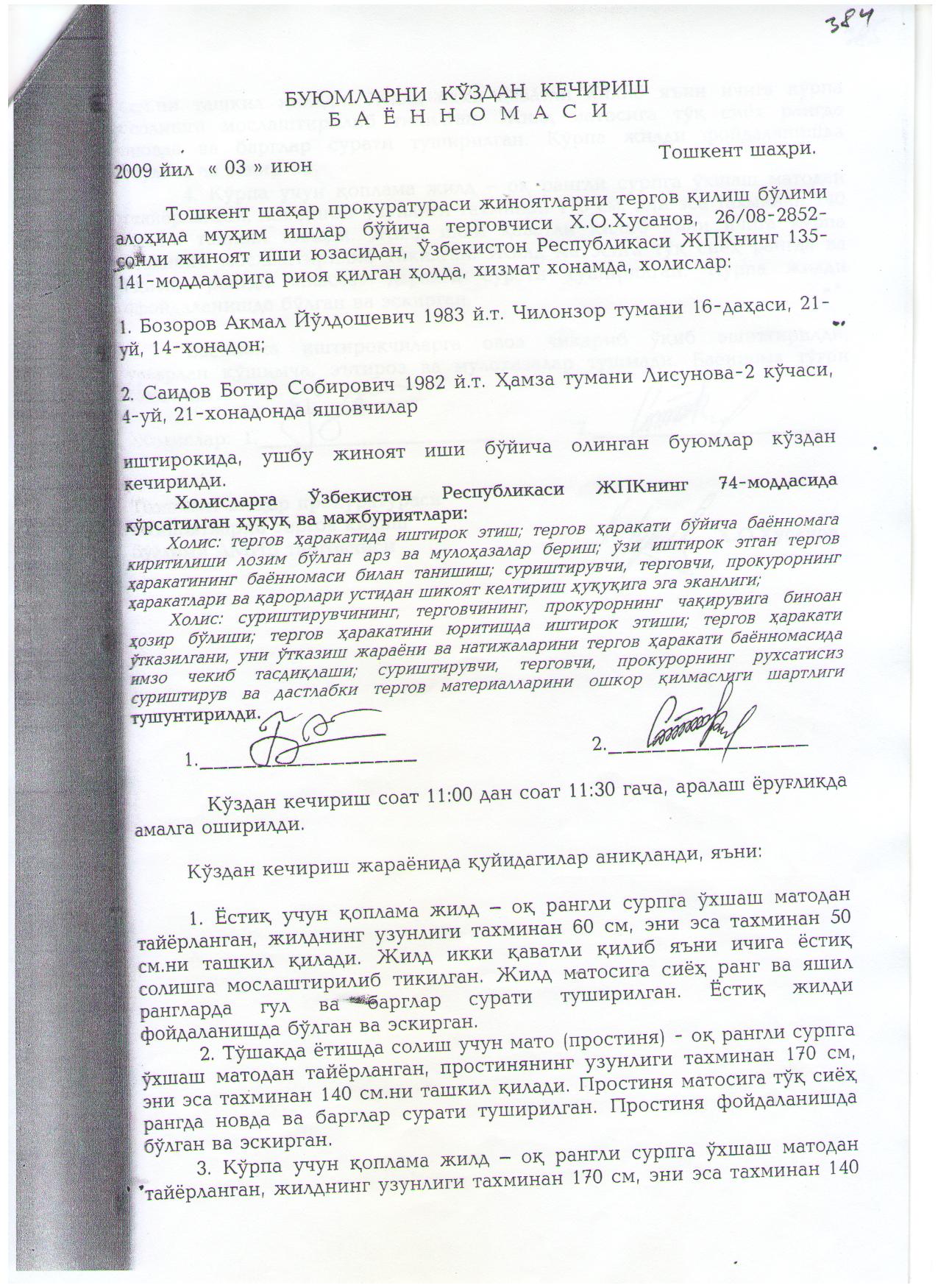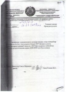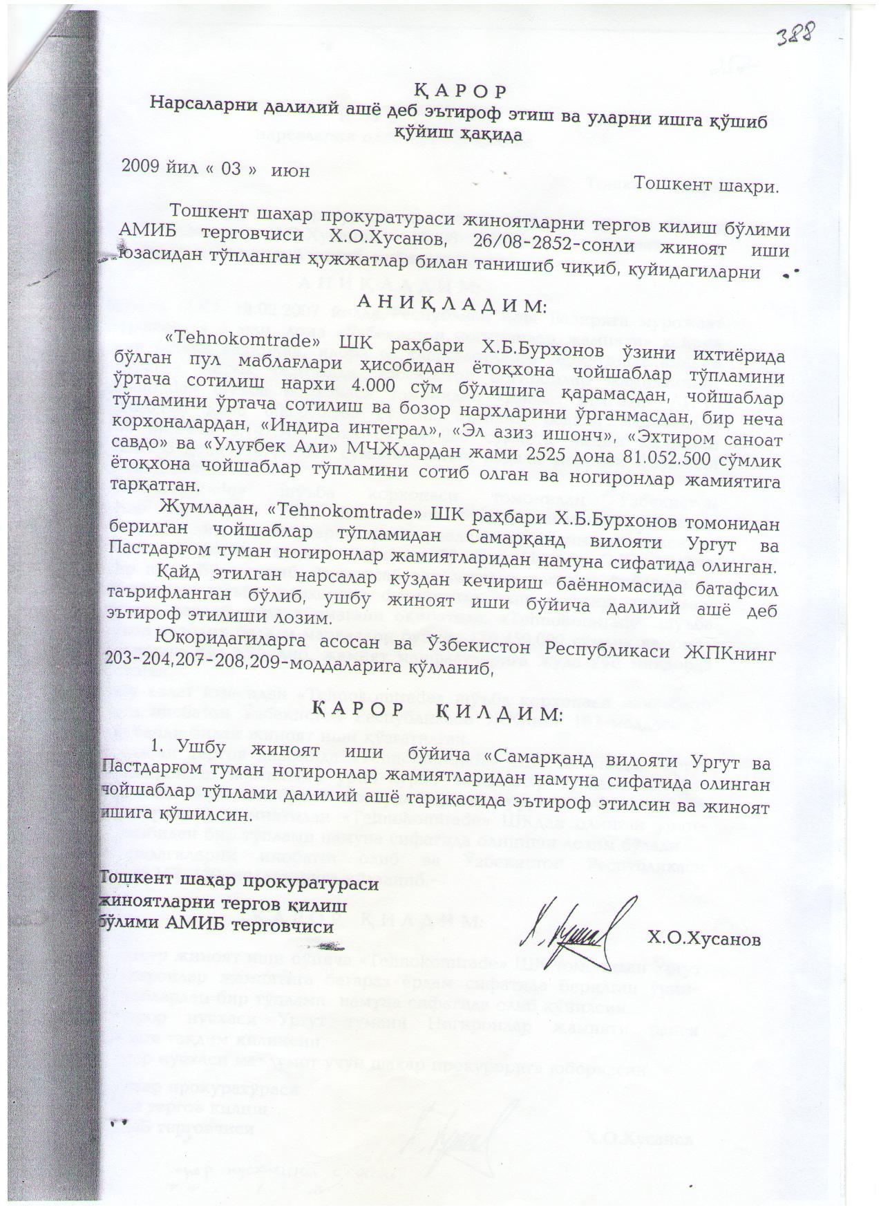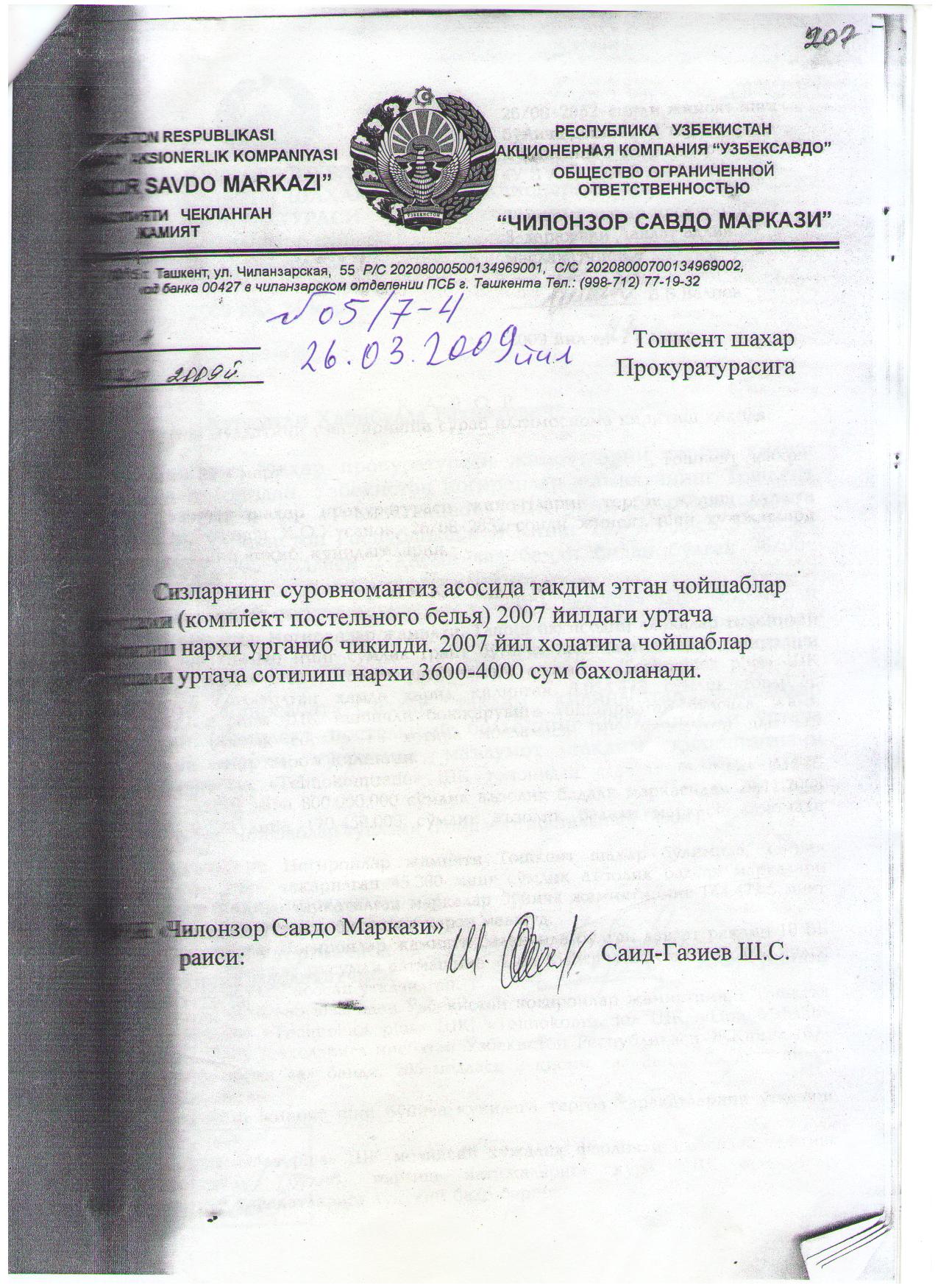 25.03.2009 года, директор ООО “Чилонзор Савдо Маркази” Ш. Саид-Газиев направил в Ташкентскую городскую прокуратуру ответ № 05/7-4, в котором отмечалось, что “на ваш запрос об оценке приложенного постельного комплекта, сообщаем, что в 2007 году стоимость данной продукции составляла 3600-4000 сум”.
