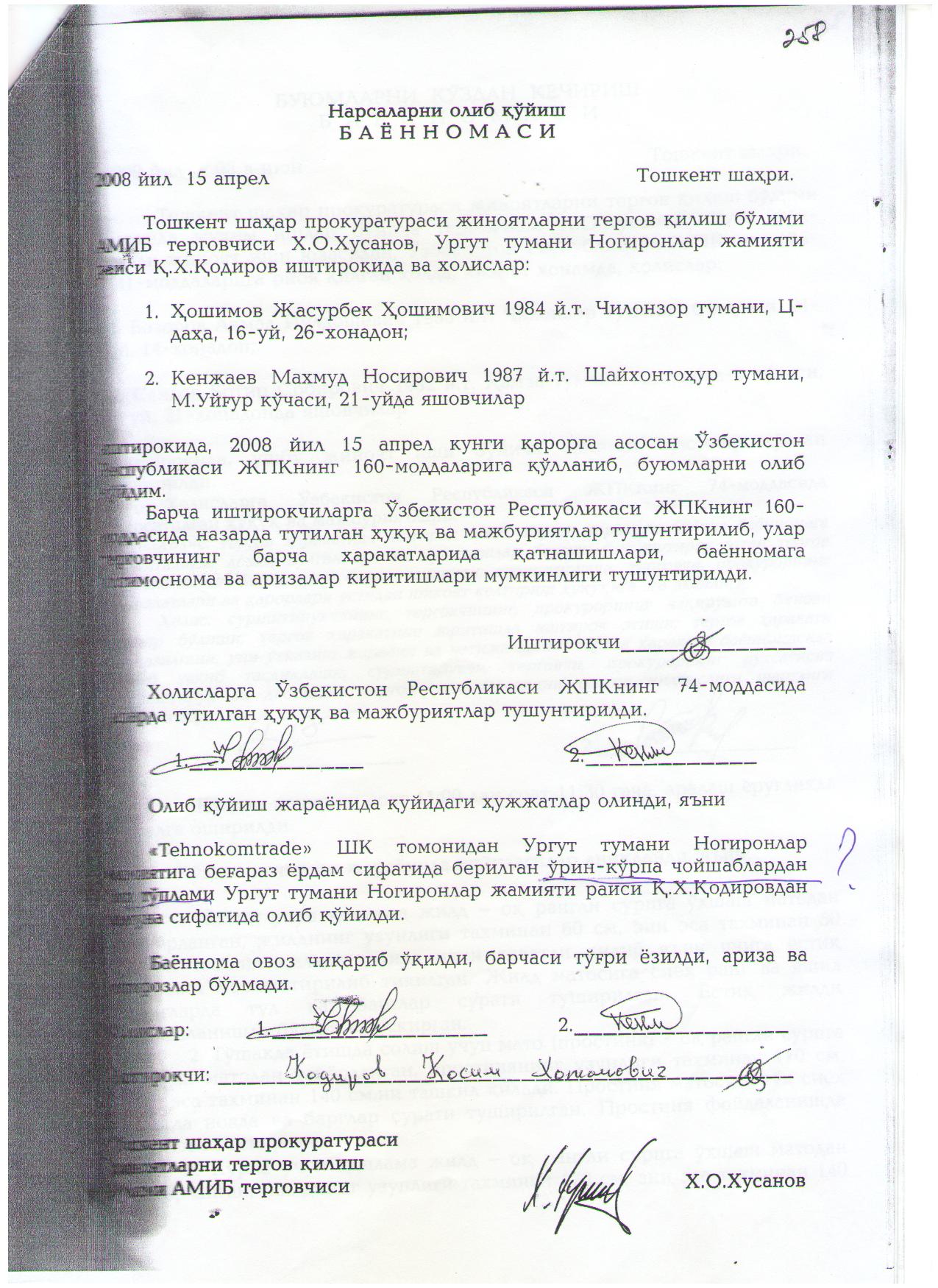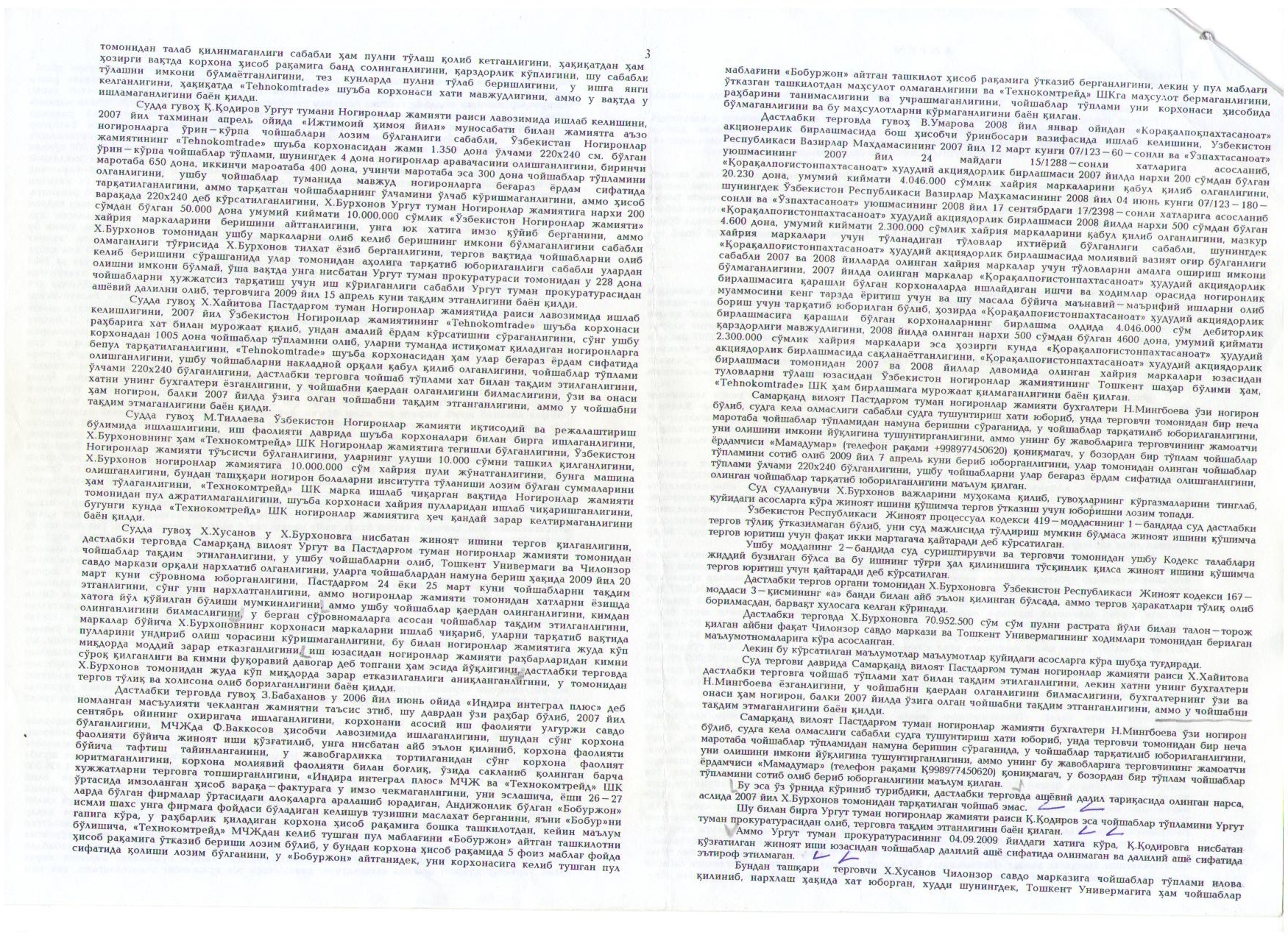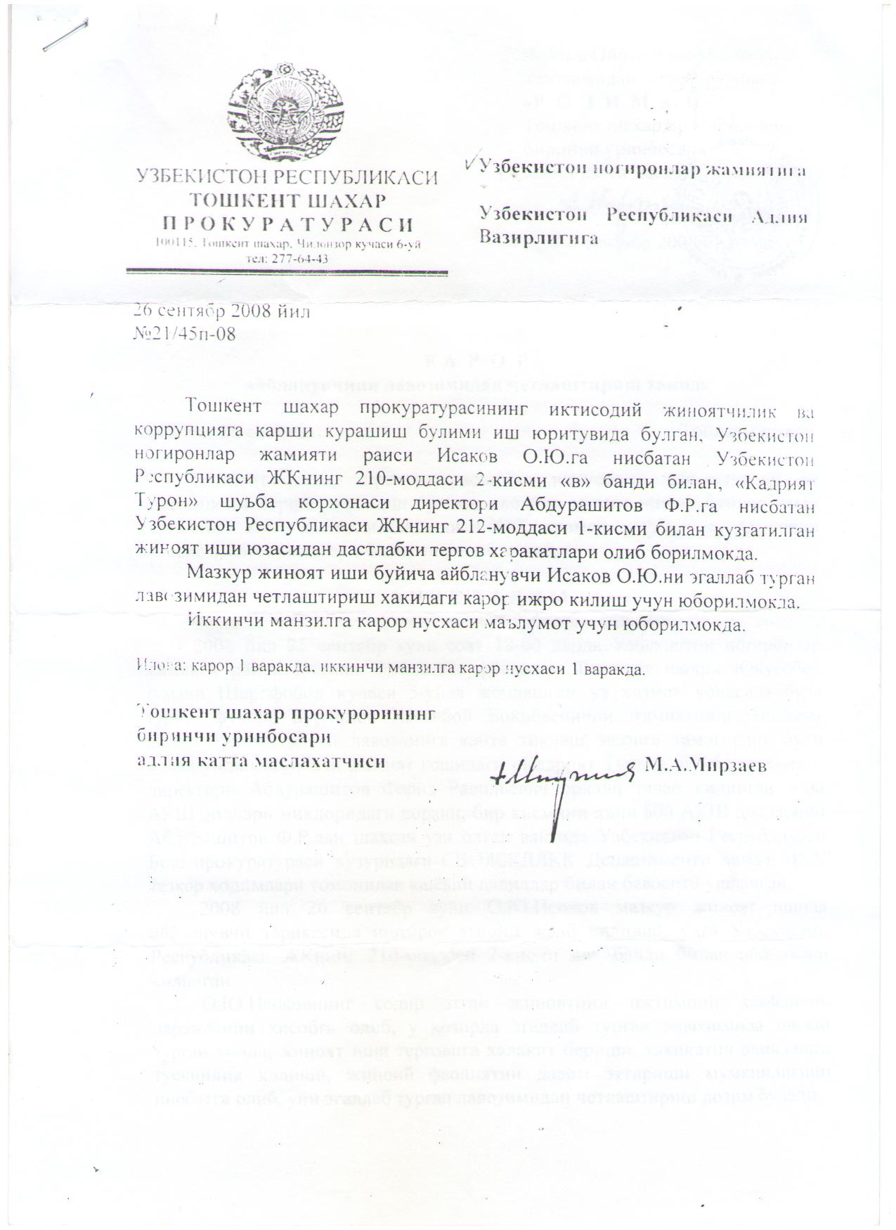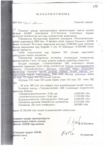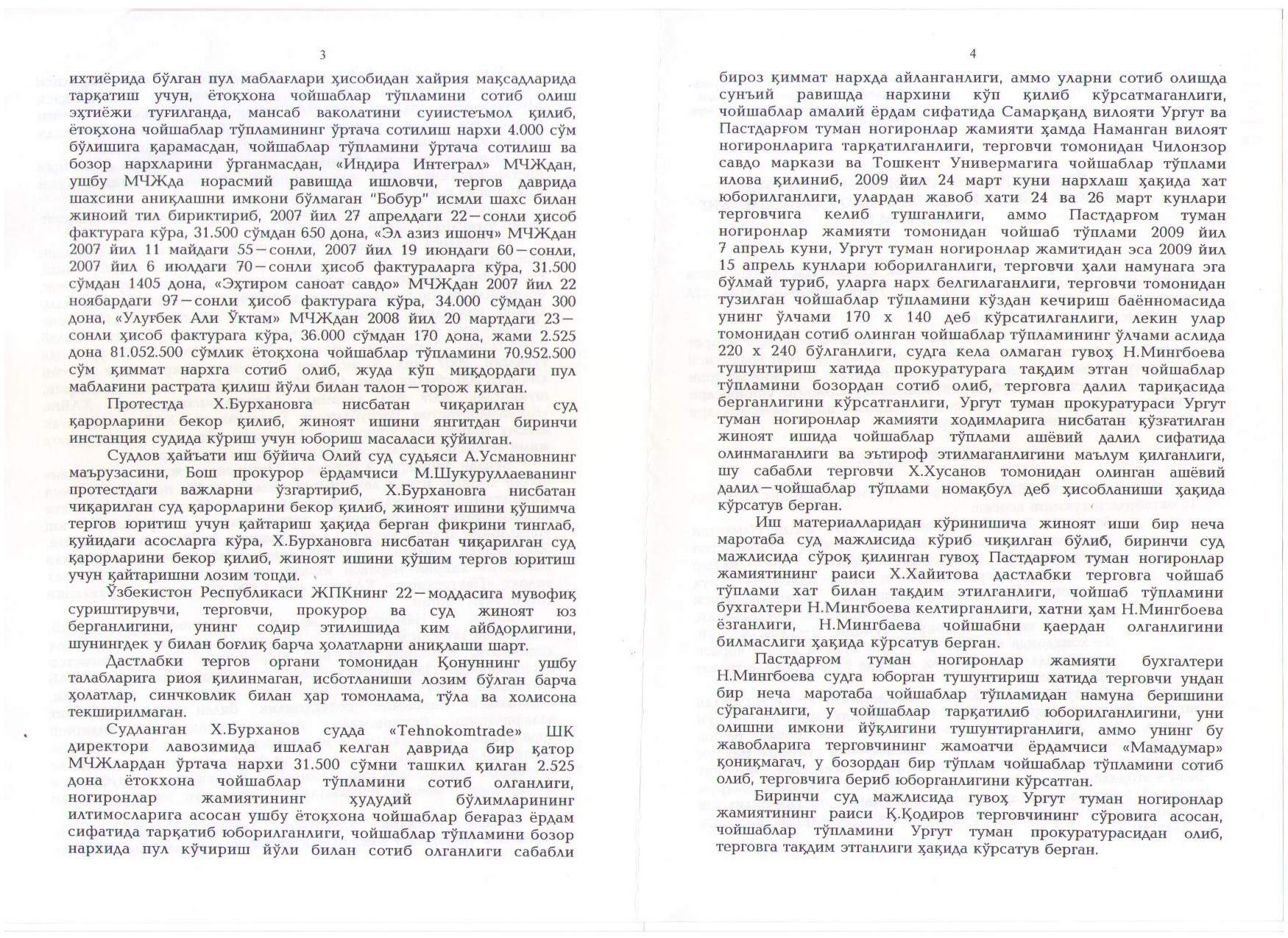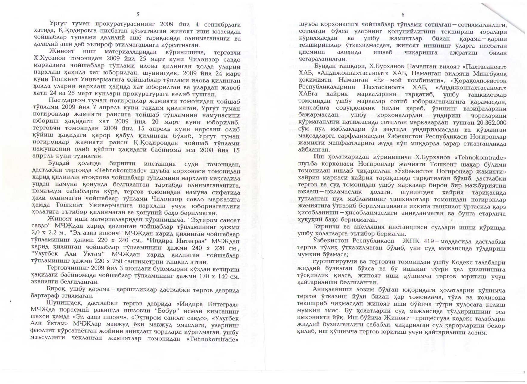 25.03.2009 года, директор ООО “Чилонзор Савдо Маркази” Ш. Саид-Газиев направил в Ташкентскую городскую прокуратуру ответ № 05/7-4, в котором отмечалось, что “на ваш запрос об оценке приложенного постельного комплекта, сообщаем, что в 2007 году стоимость данной продукции составляла 3600-4000 сум”.
