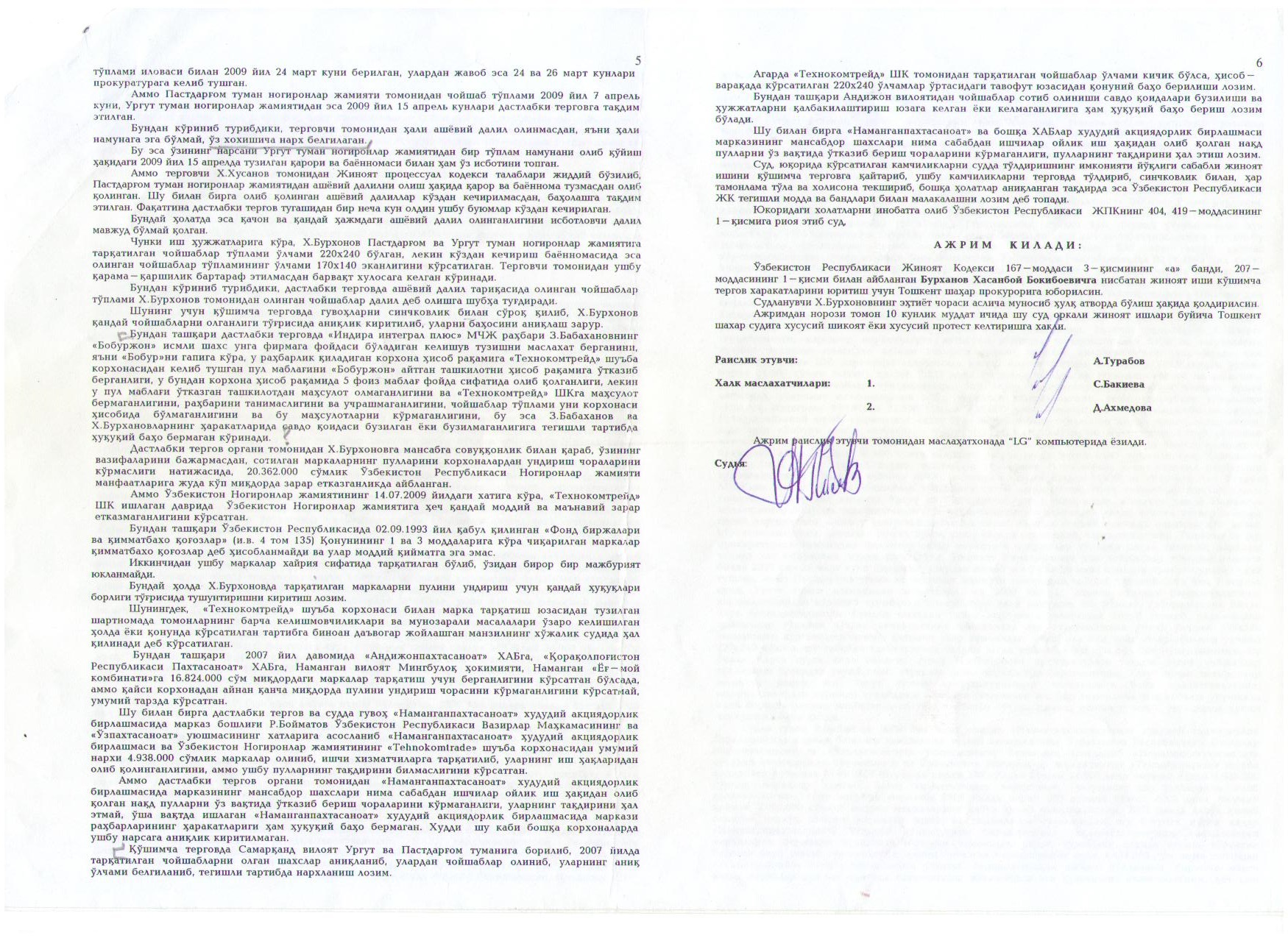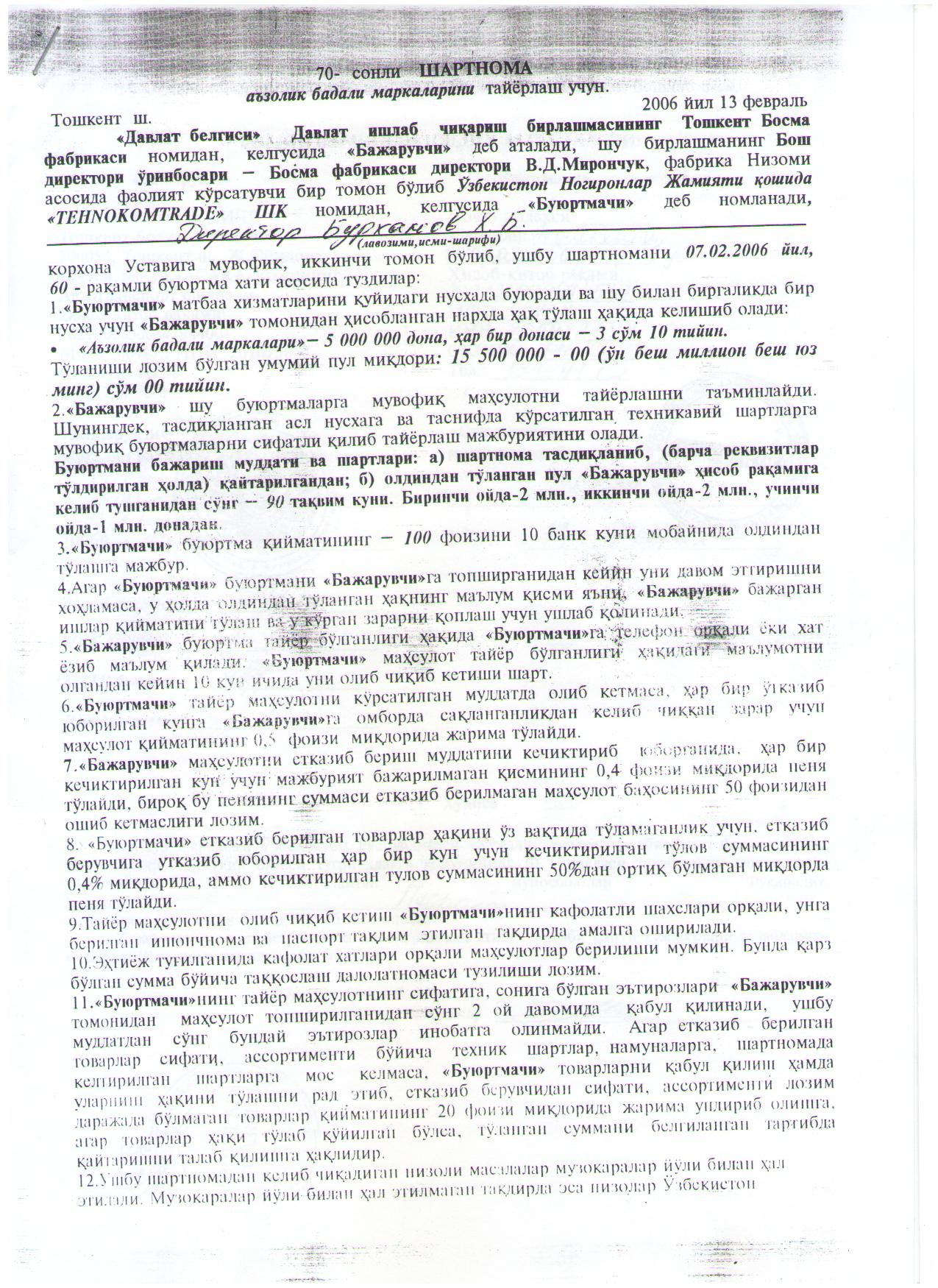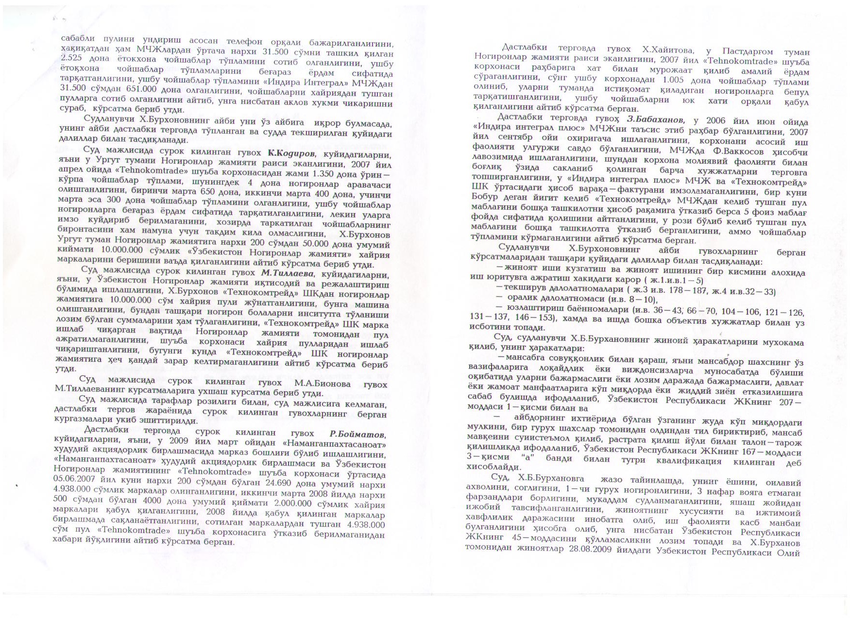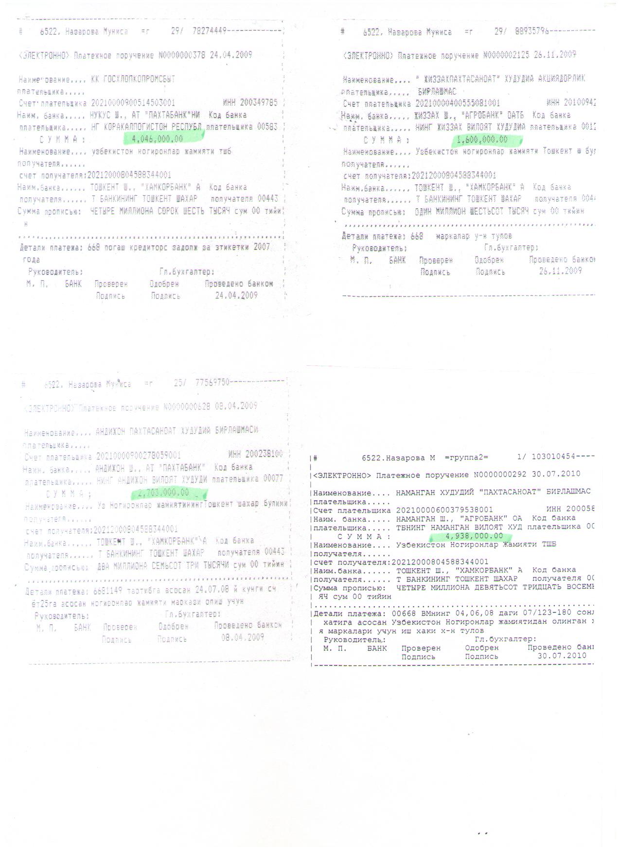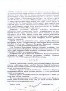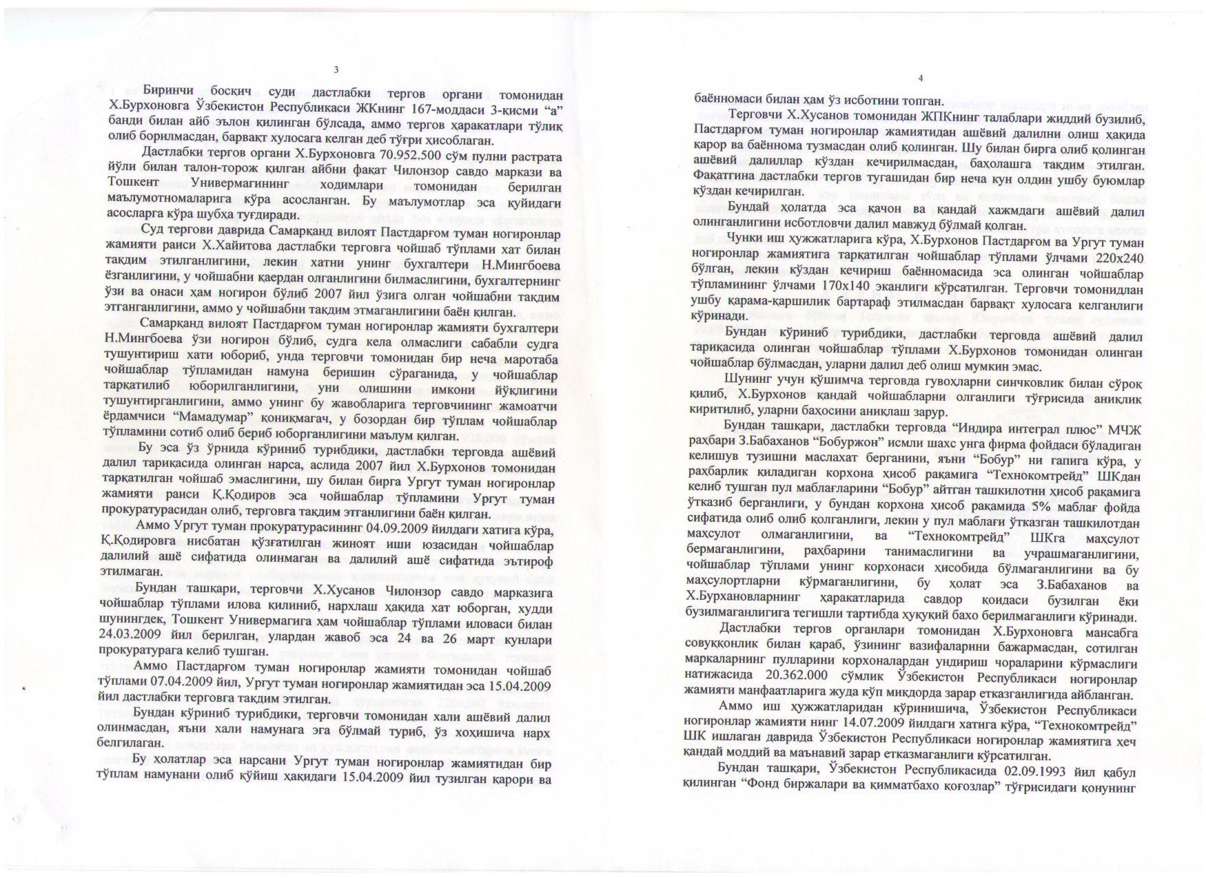 25.03.2009 года, директор ООО “Чилонзор Савдо Маркази” Ш. Саид-Газиев направил в Ташкентскую городскую прокуратуру ответ № 05/7-4, в котором отмечалось, что “на ваш запрос об оценке приложенного постельного комплекта, сообщаем, что в 2007 году стоимость данной продукции составляла 3600-4000 сум”.