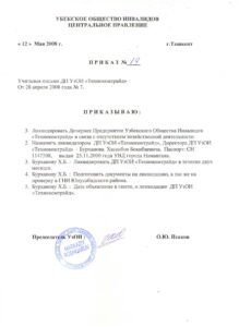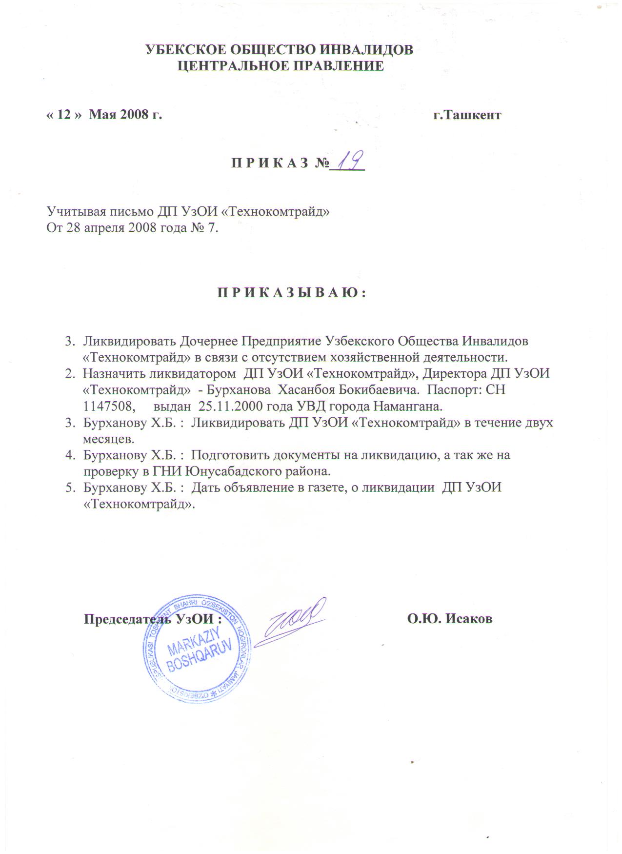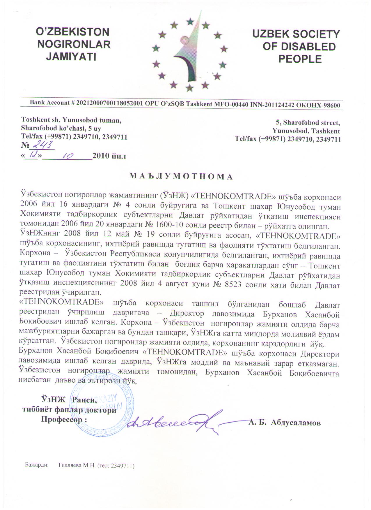После того, как члены общественной организации предложили Бурханову создать и возглавить Ташкентское общество инвалидов, которое к началу 2008 года уже имело структурные подразделения в семи районах столицы, учредитель посчитал целесообразным закрыть предприятие и издал приказ о добровольной ликвидации ДП “Tehnokomtrade”.