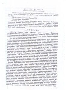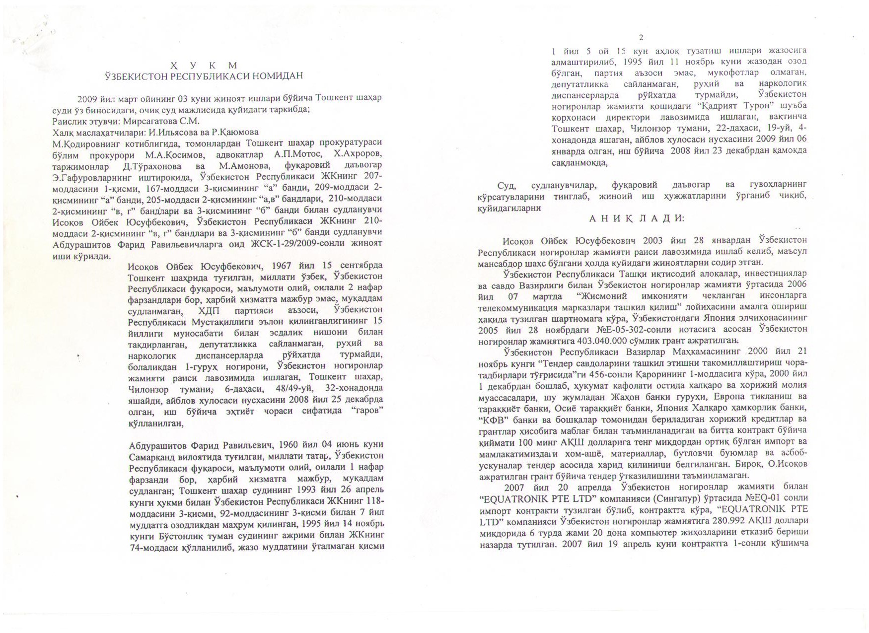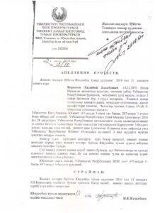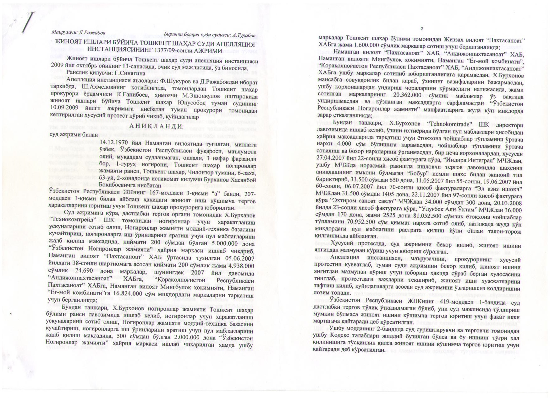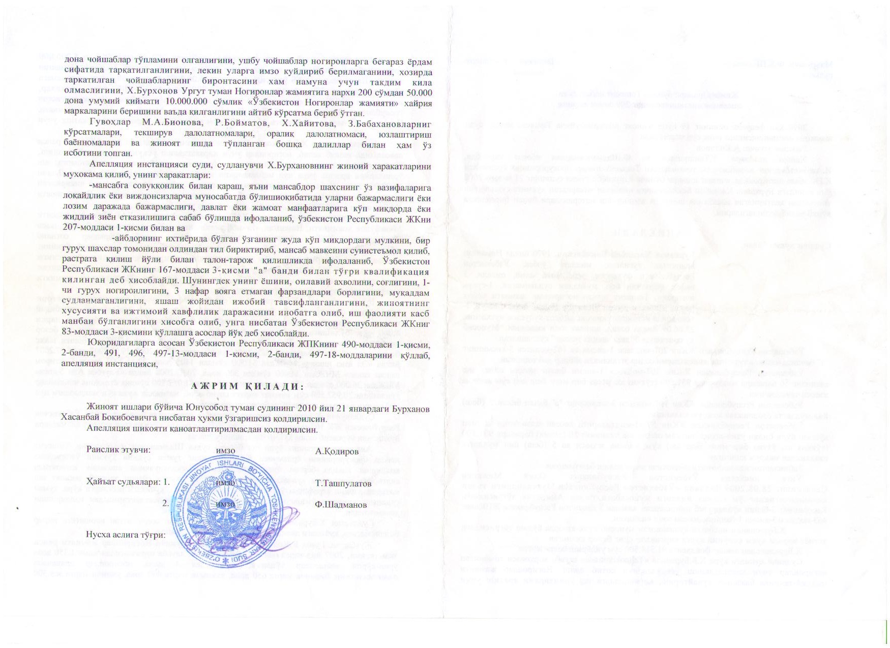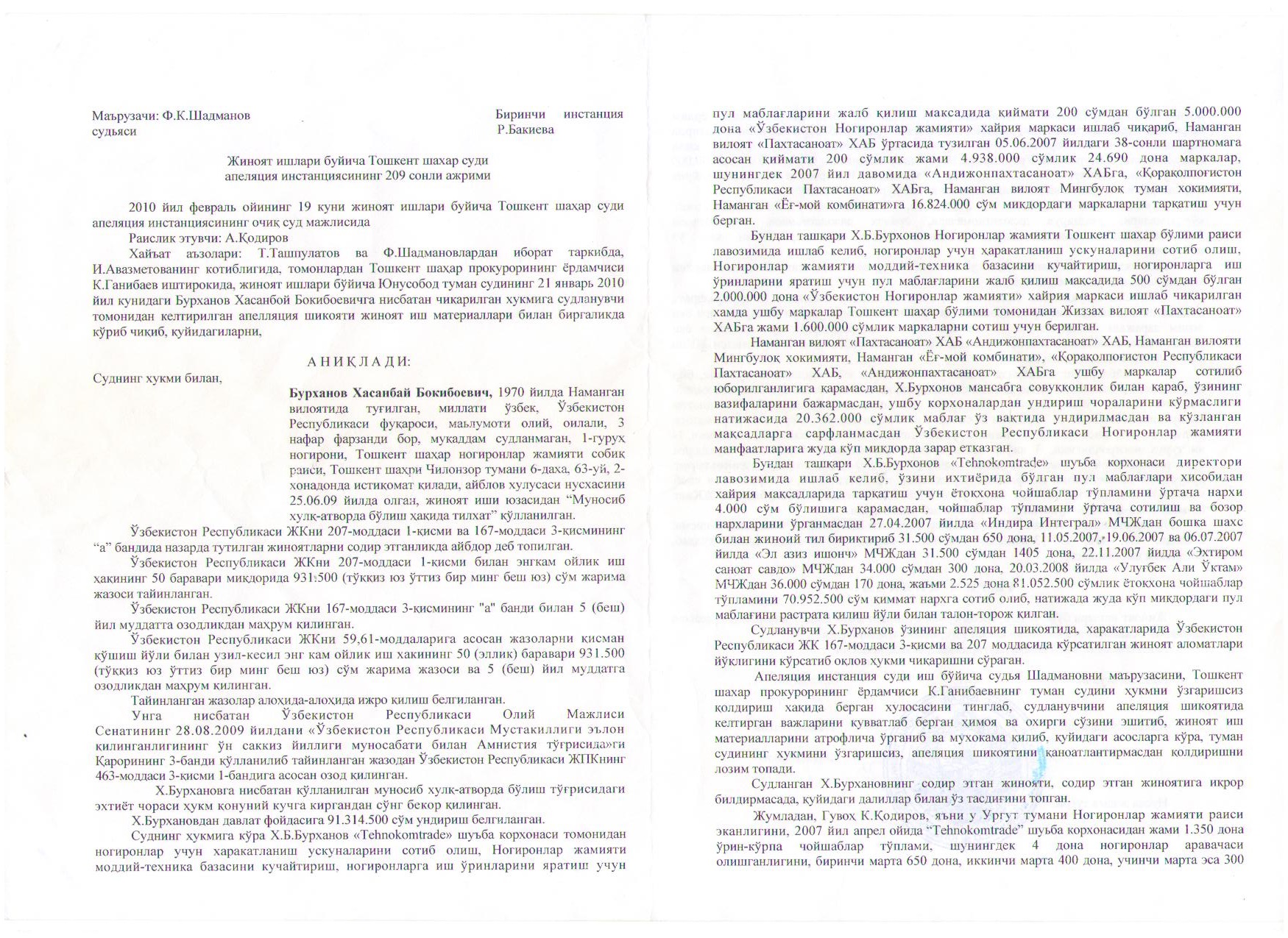 19.02.2010 года апелляционная инстанция Ташкентского городского суда по уголовным делам вынесла Определение № 209 об оставлении без изменения вынесенного Приговора Судьи Р. Бакиевой.