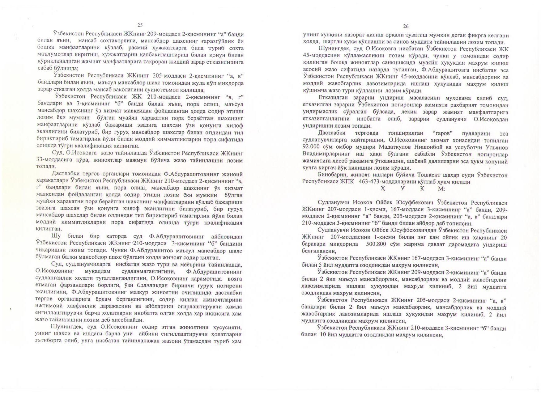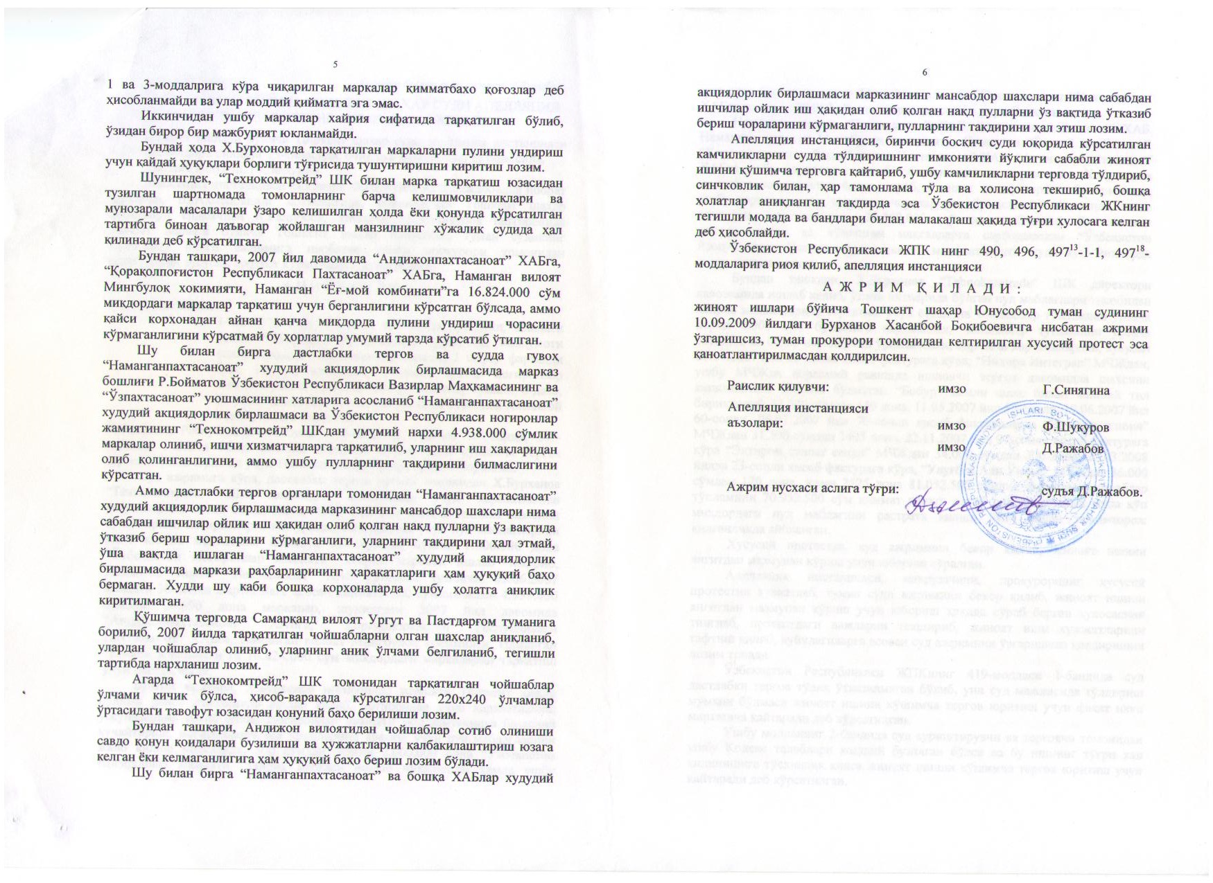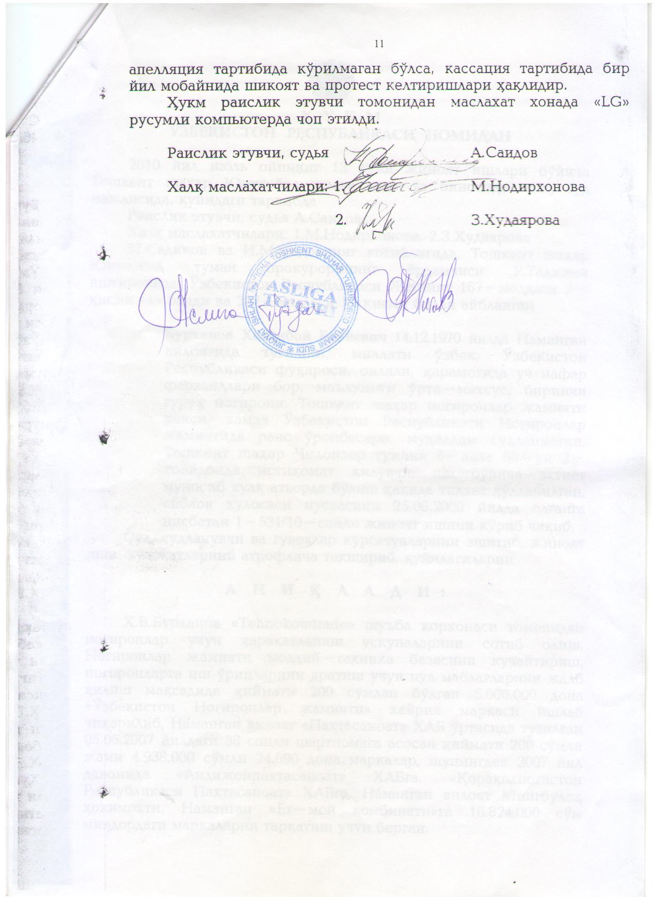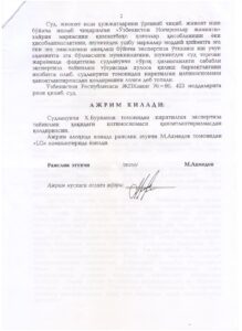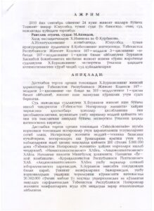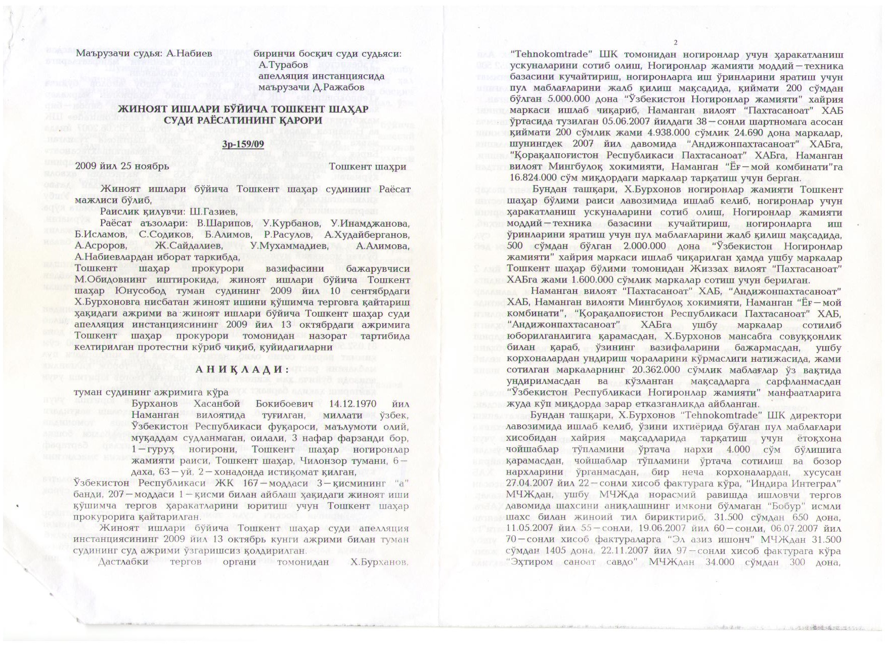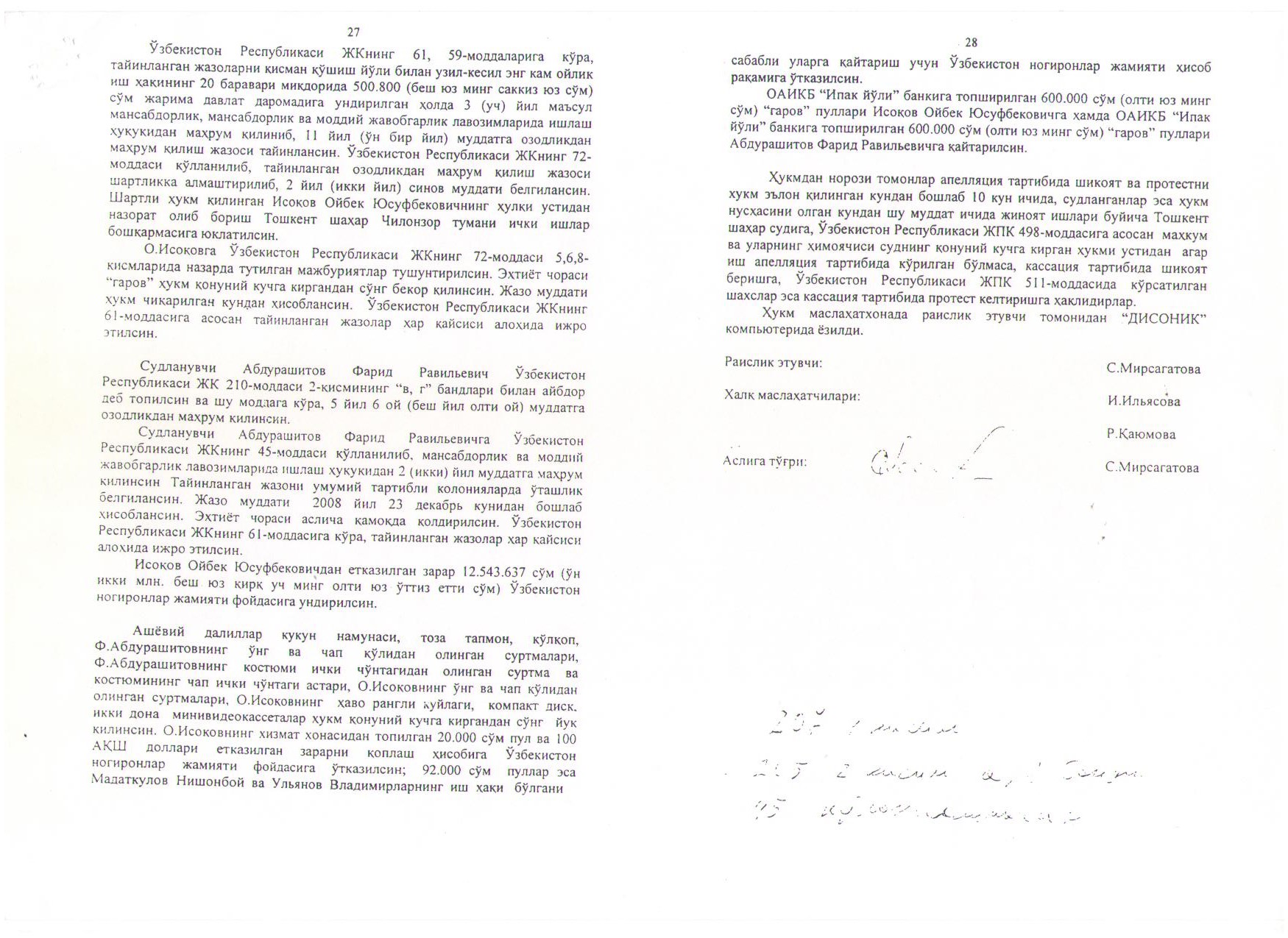 19.02.2010 года апелляционная инстанция Ташкентского городского суда по уголовным делам вынесла Определение № 209 об оставлении без изменения вынесенного Приговора Судьи Р. Бакиевой.