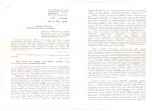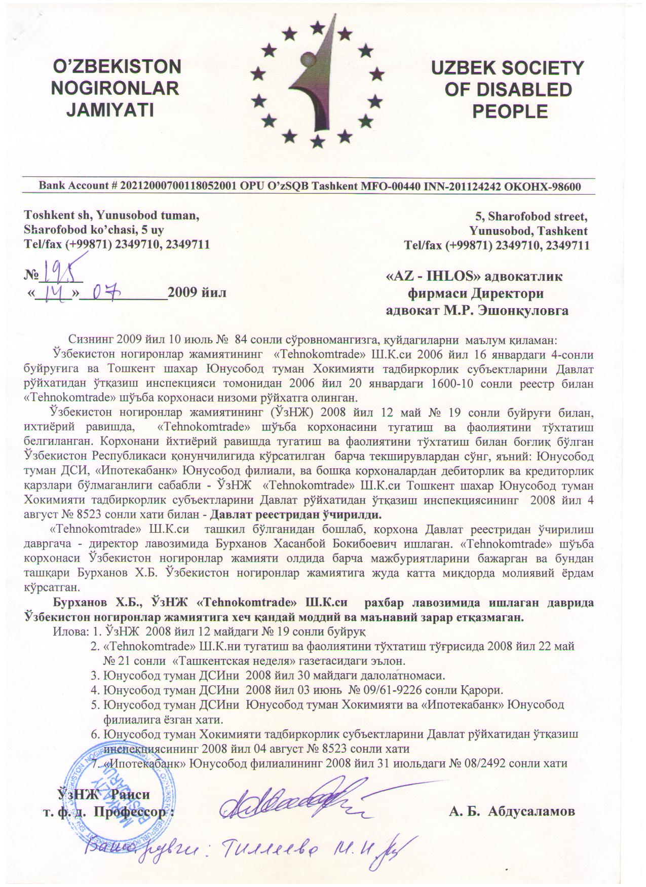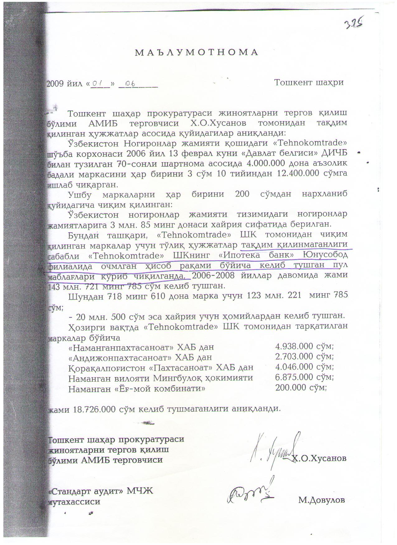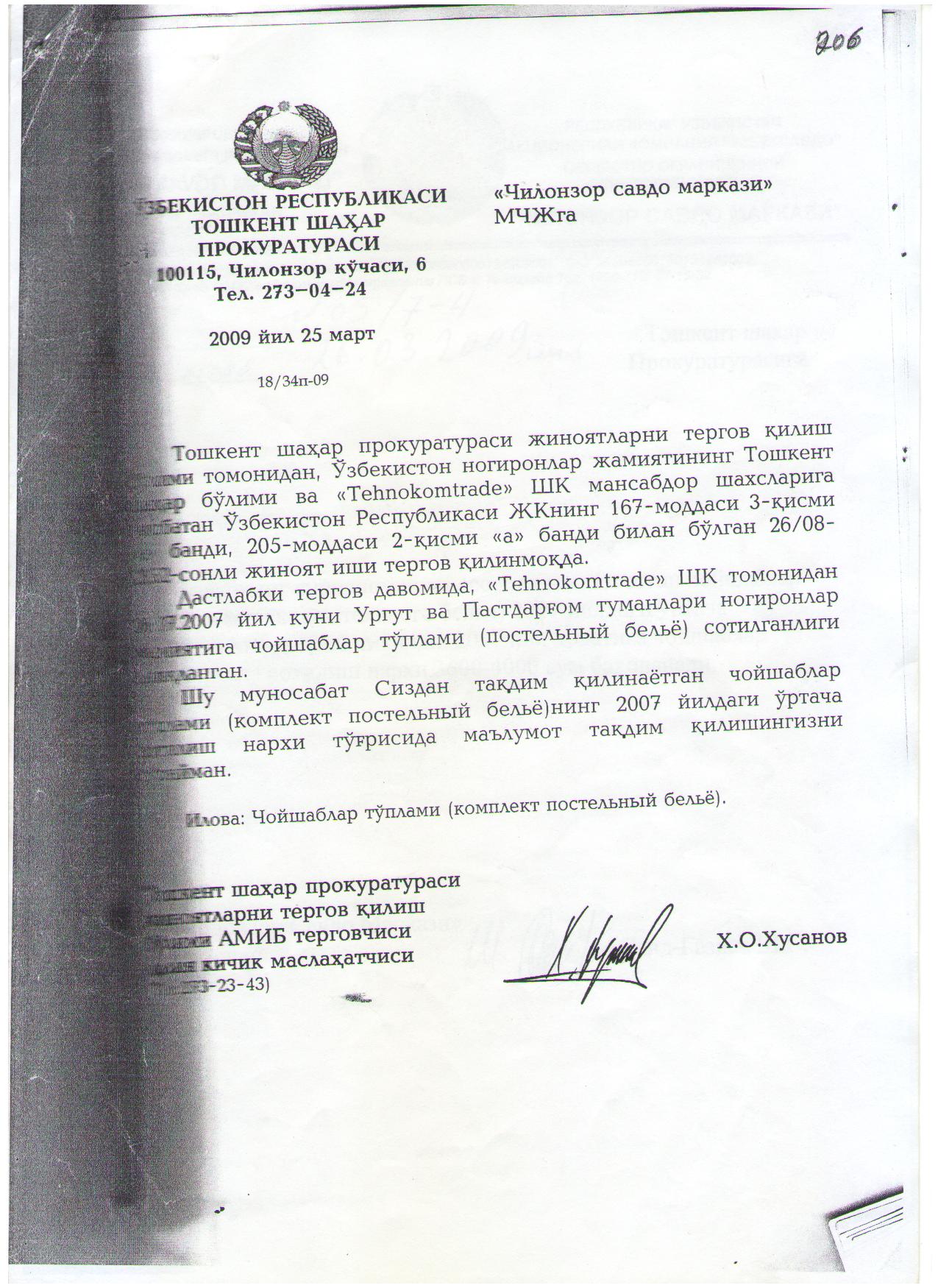 Чтобы подкрепить свое обвинение, 25.03.2009 года следователь Хусанов обратился с письмом к директору ООО “Чилонзор Савдо Маркази” Ш. Саид-Газиеву. В письме Хусанов указал следующее: “…против должностных лиц ДП “Tehnokomtrade” и Ташкентского городского отделения Узбекского общества инвалидов возбуждено уголовное дело по статьям УК РУз: 167 часть 3 пункт “а” и 205 часть 2 пункт “а”. Во время предварительного следствия установлено, что в период 2007 года ДП “Tehnokomtrade” продавало постельные комплекты общественным организациям инвалидов. В связи с этим, просим оценить представленный постельный комплект по ценам 2007 года…”