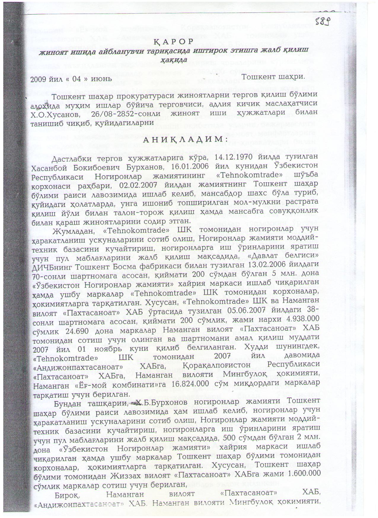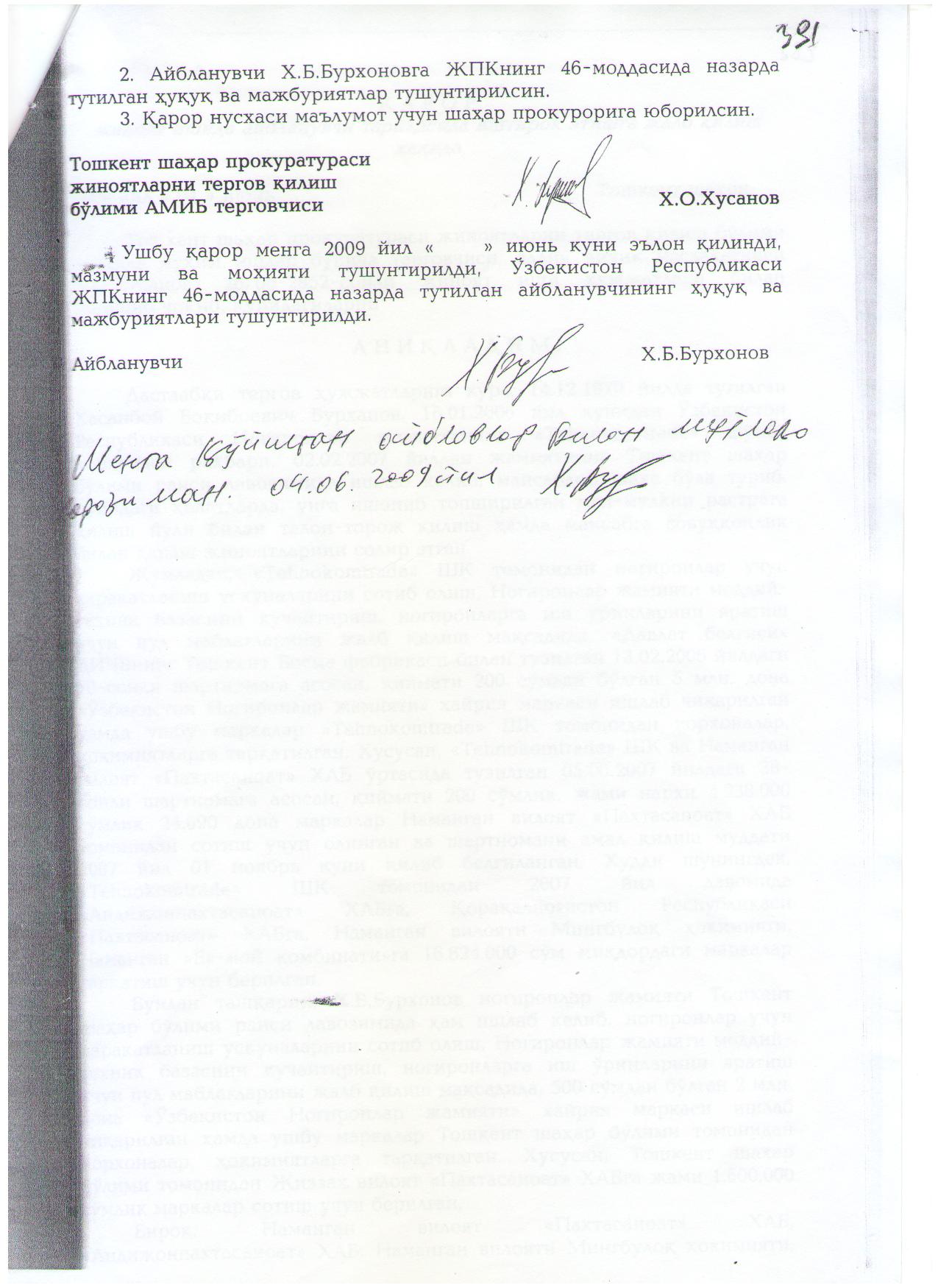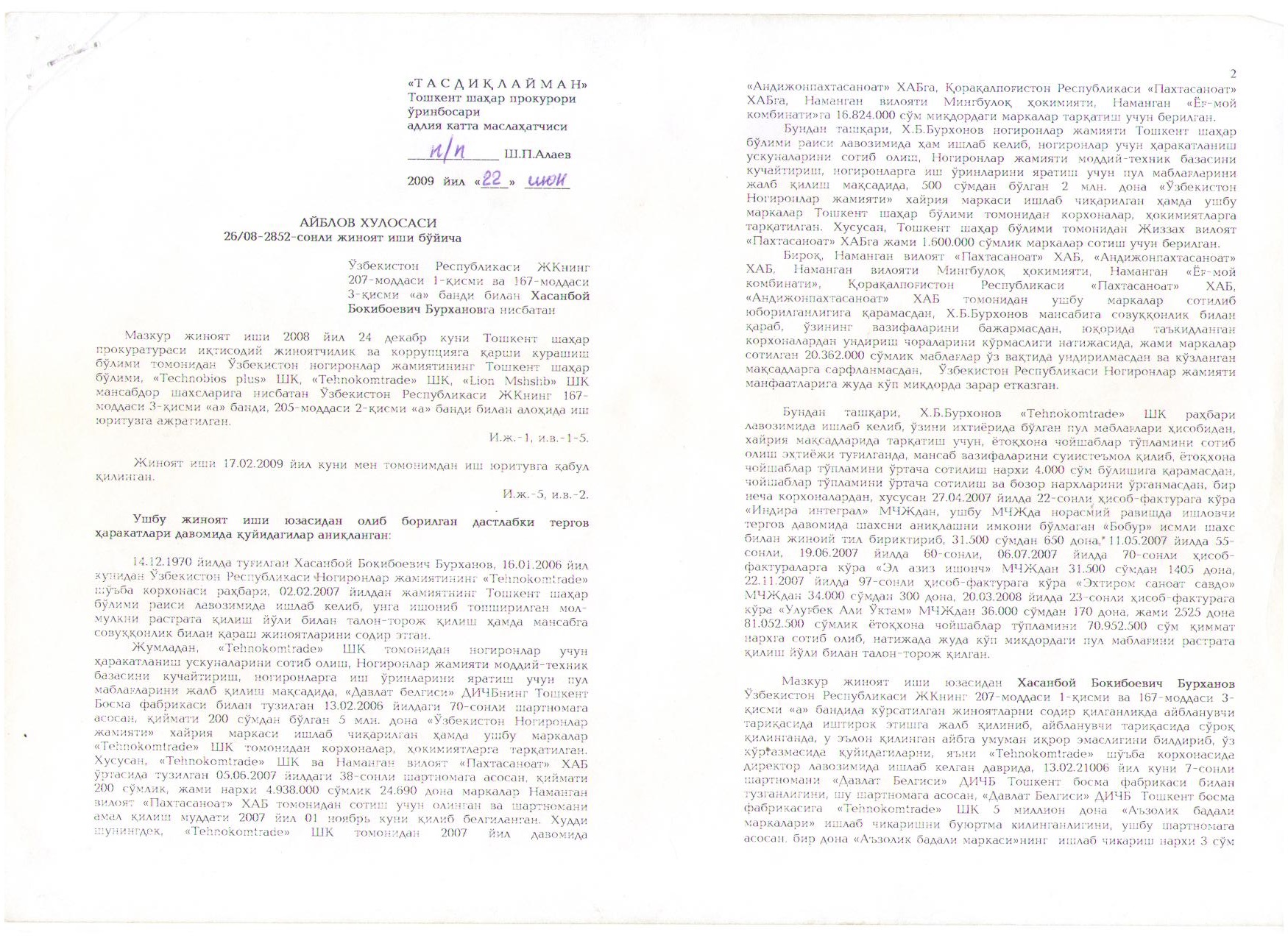 04.06.2009 года, следователь Хусанов вынес Решение о привлечении Бурханова в качестве обвиняемого по расследуемому уголовному делу по статьям УК РУз 207 часть 1 и 167 часть 3 пункт “а”. Подписывая данный документ, Бурханов от своей руки добавил надпись: “С предъявленными мне обвинениями – я абсолютно не согласен”.