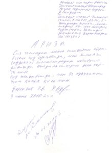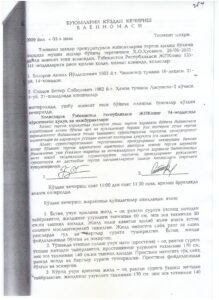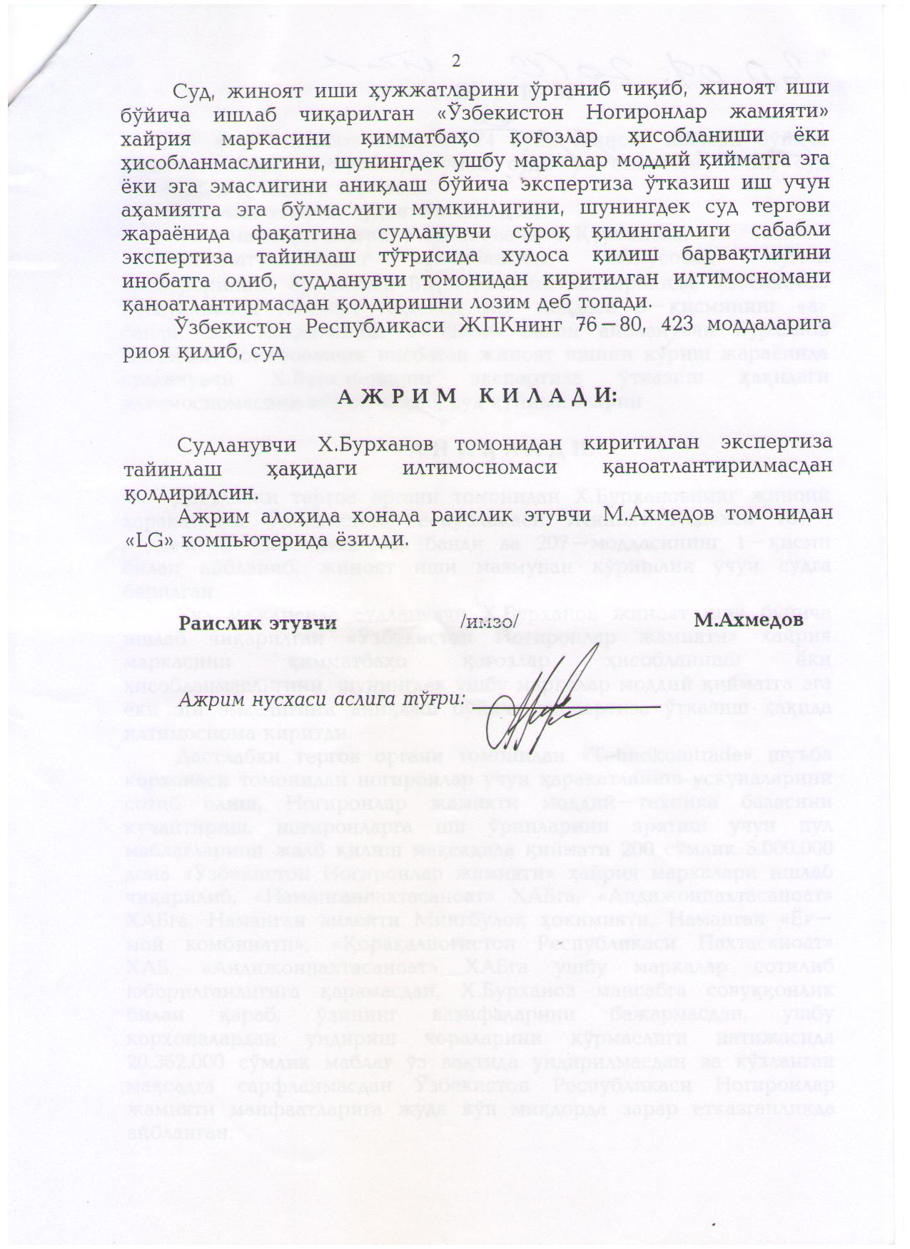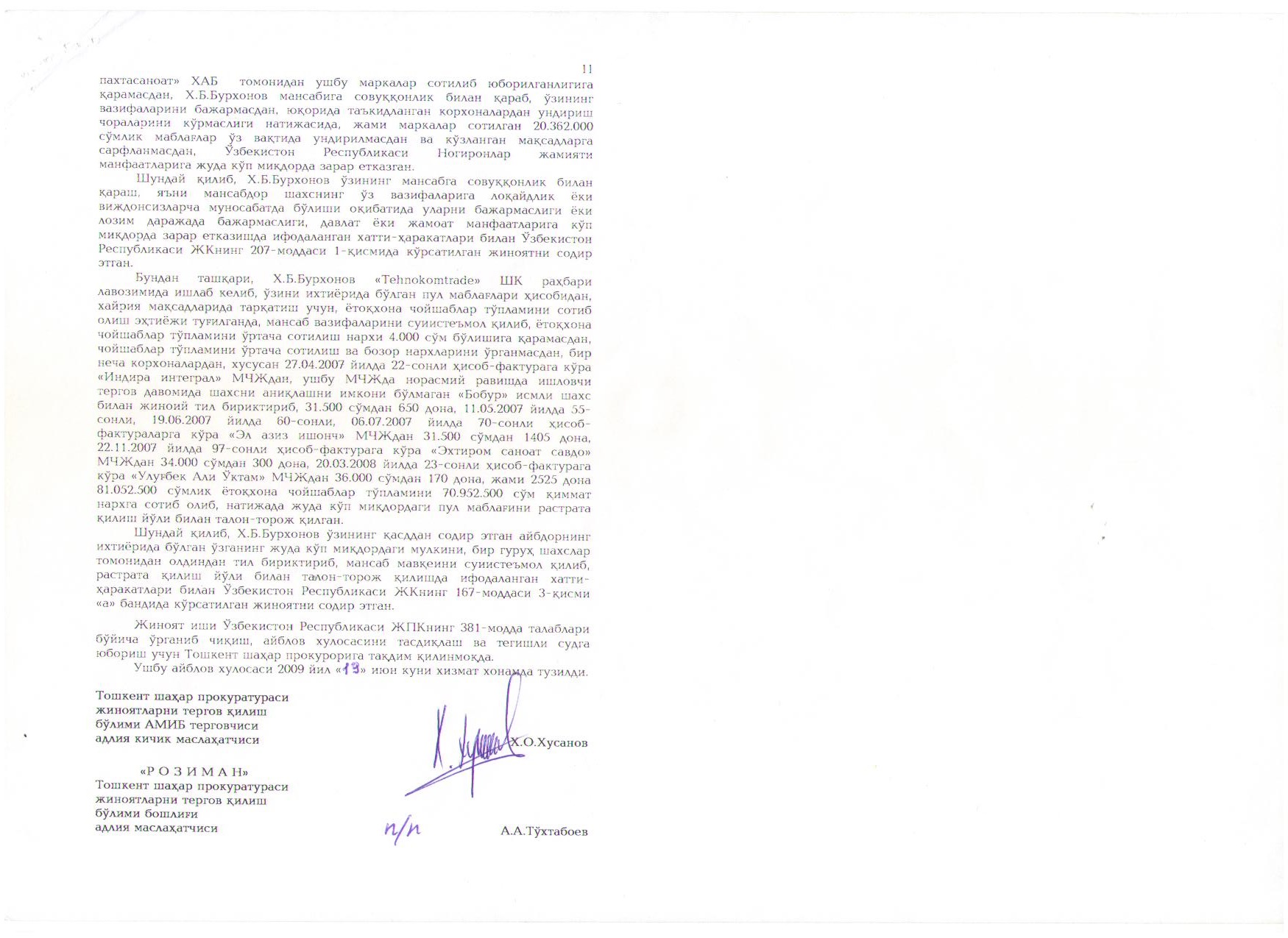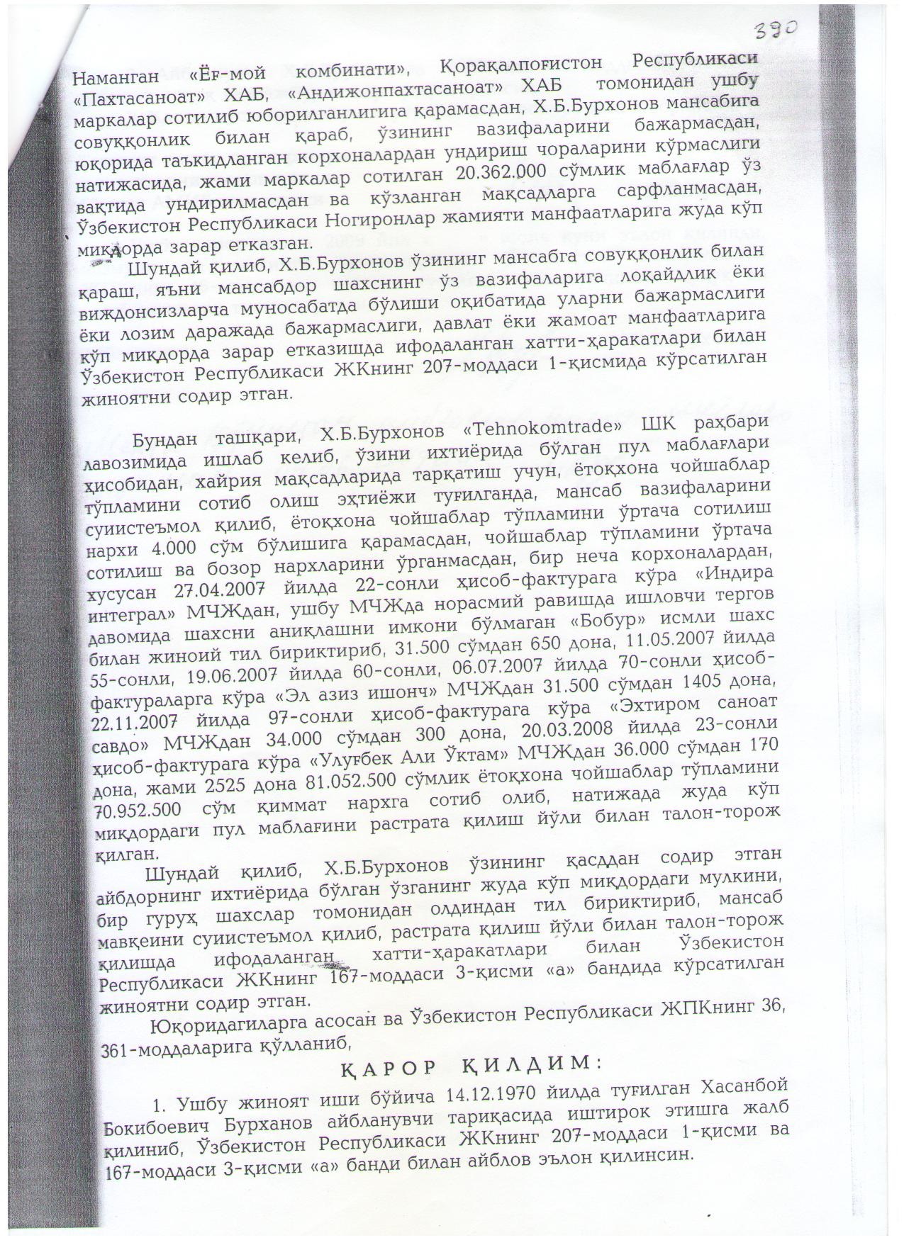 04.06.2009 года, следователь Хусанов вынес Решение о привлечении Бурханова в качестве обвиняемого по расследуемому уголовному делу по статьям УК РУз 207 часть 1 и 167 часть 3 пункт “а”. Подписывая данный документ, Бурханов от своей руки добавил надпись: “С предъявленными мне обвинениями – я абсолютно не согласен”.