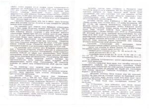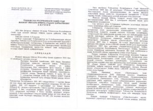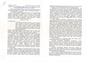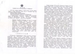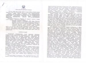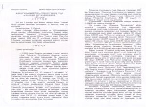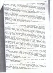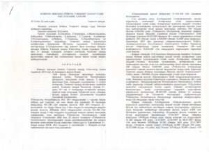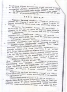Приписываемую Бурханову дебиторскую задолженность в размере 20 362 000 сум и “растраченную” Бурхановым сумму в размере 70 952 500 сум судья Р.Бакиева присудила государству. Какими аргументами руководствовалась судья при вынесении подобного решения, не известно, учитывая, что к моменту вынесения Приговора, 8 349 000 сум той самой “дебиторской задолженности” уже поступили на расчётный счёт общества инвалидов.