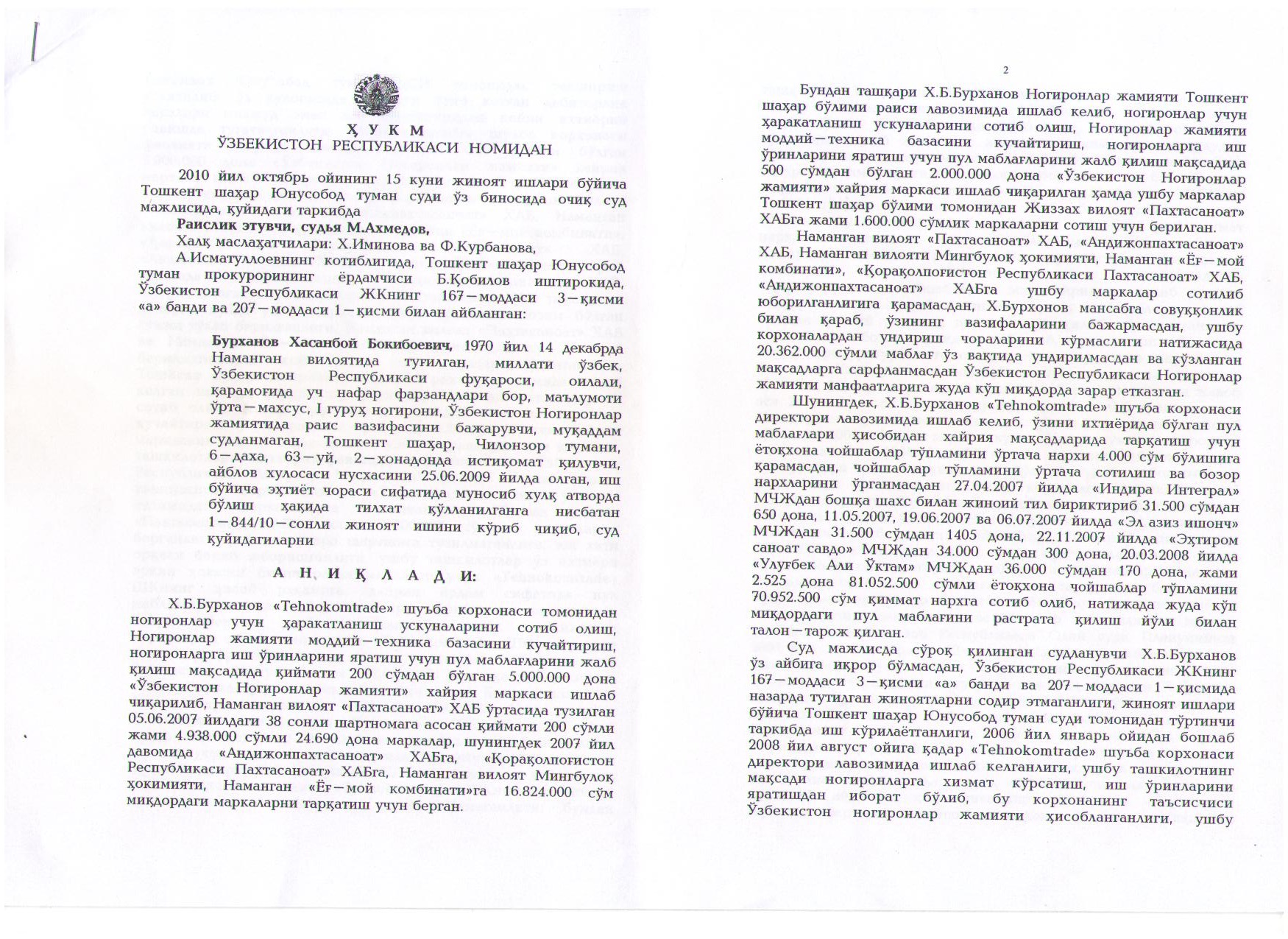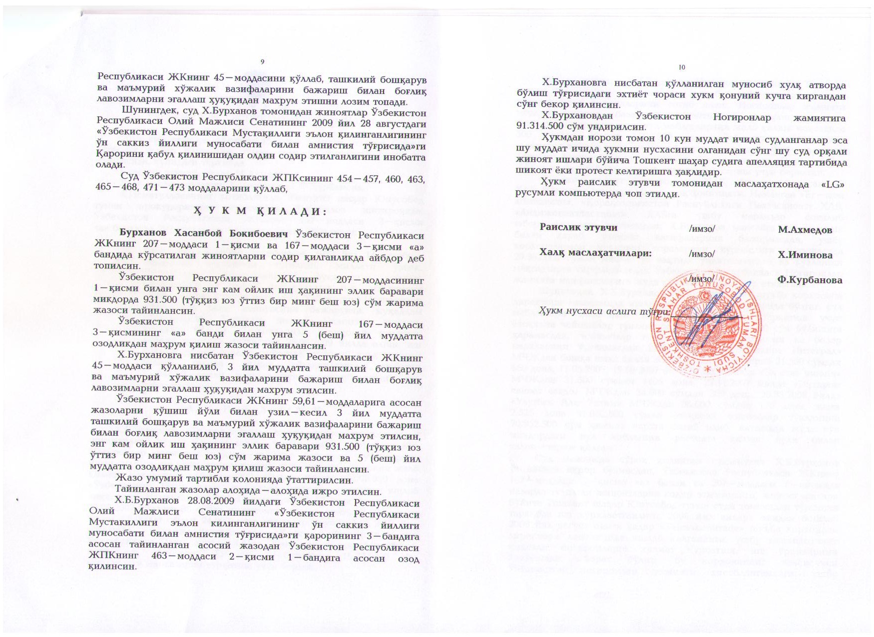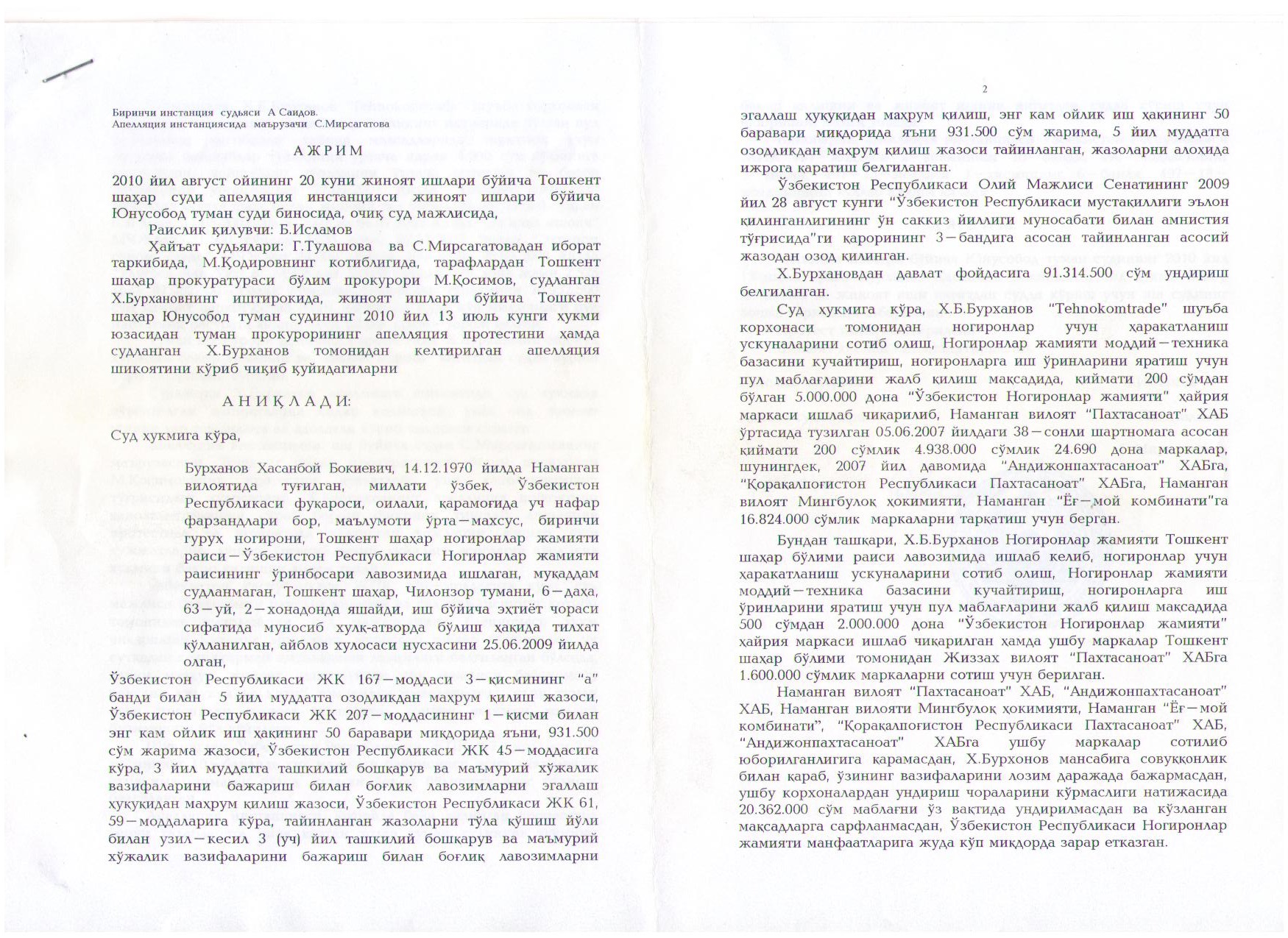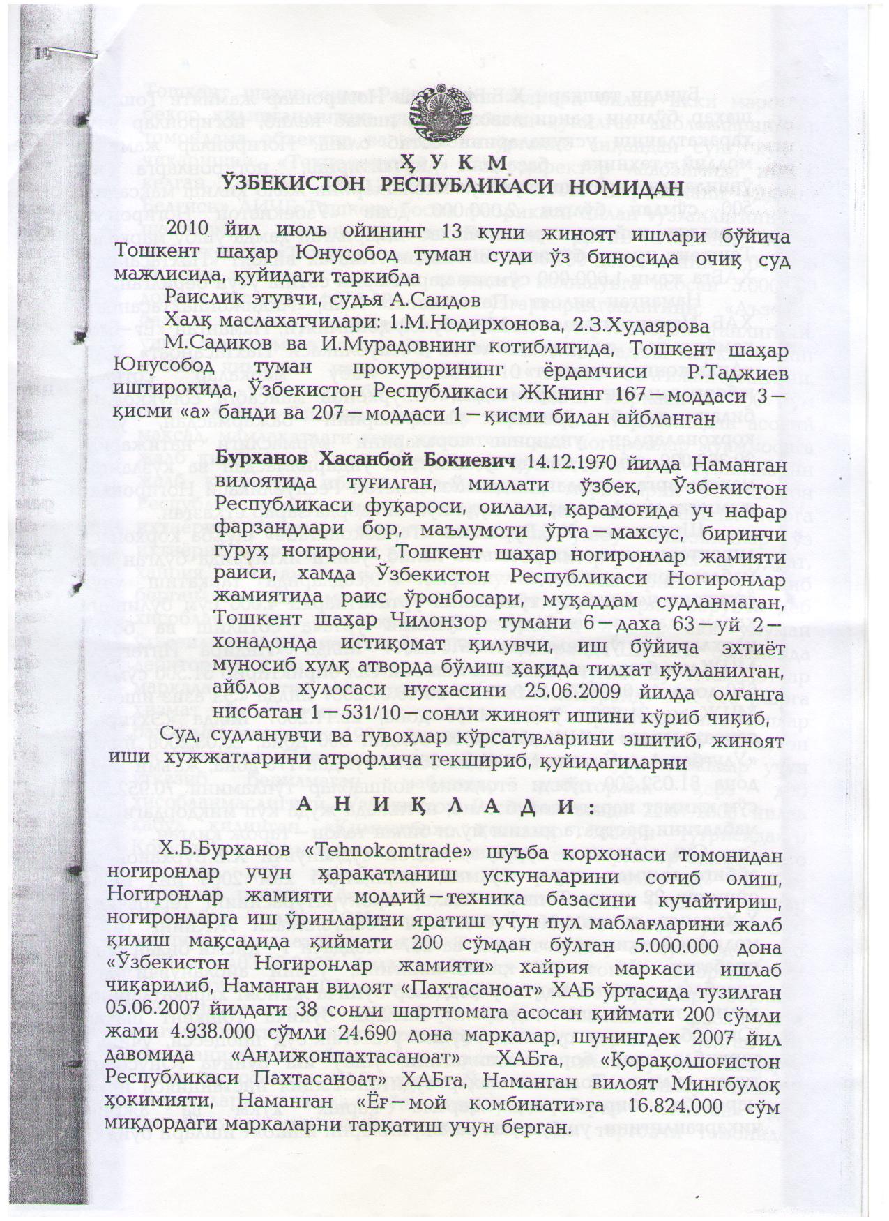 21.01.2010 года Суд по уголовным делам Юнусабадского района г. Ташкента под председательством Судьи Р. Бакиевой вынес Приговор о признании Бурханова виновным по статьям: 167 часть 3 пункт “а” и 207 часть 1 УК РУз., постановив взыскать с Бурханова 92 246 000 Сум пользу государства.