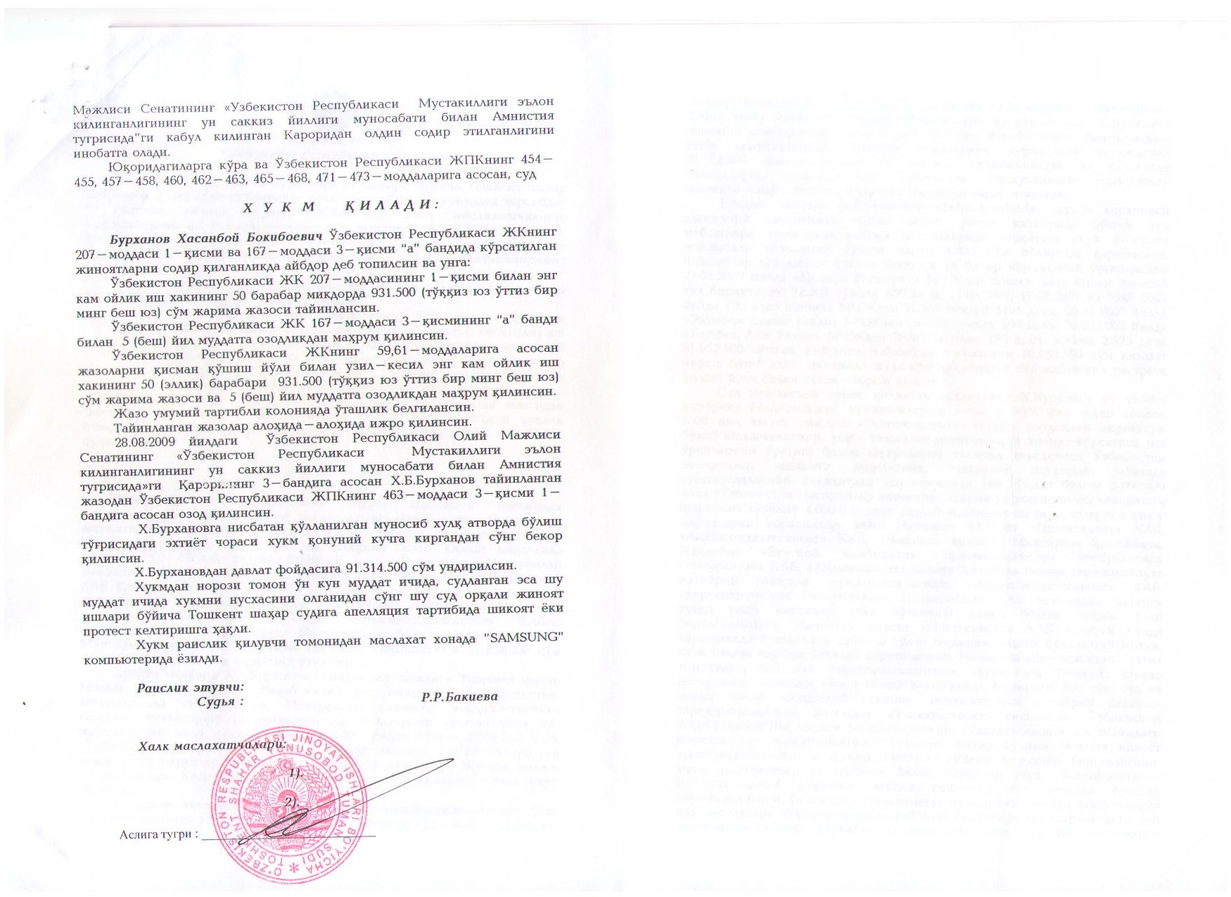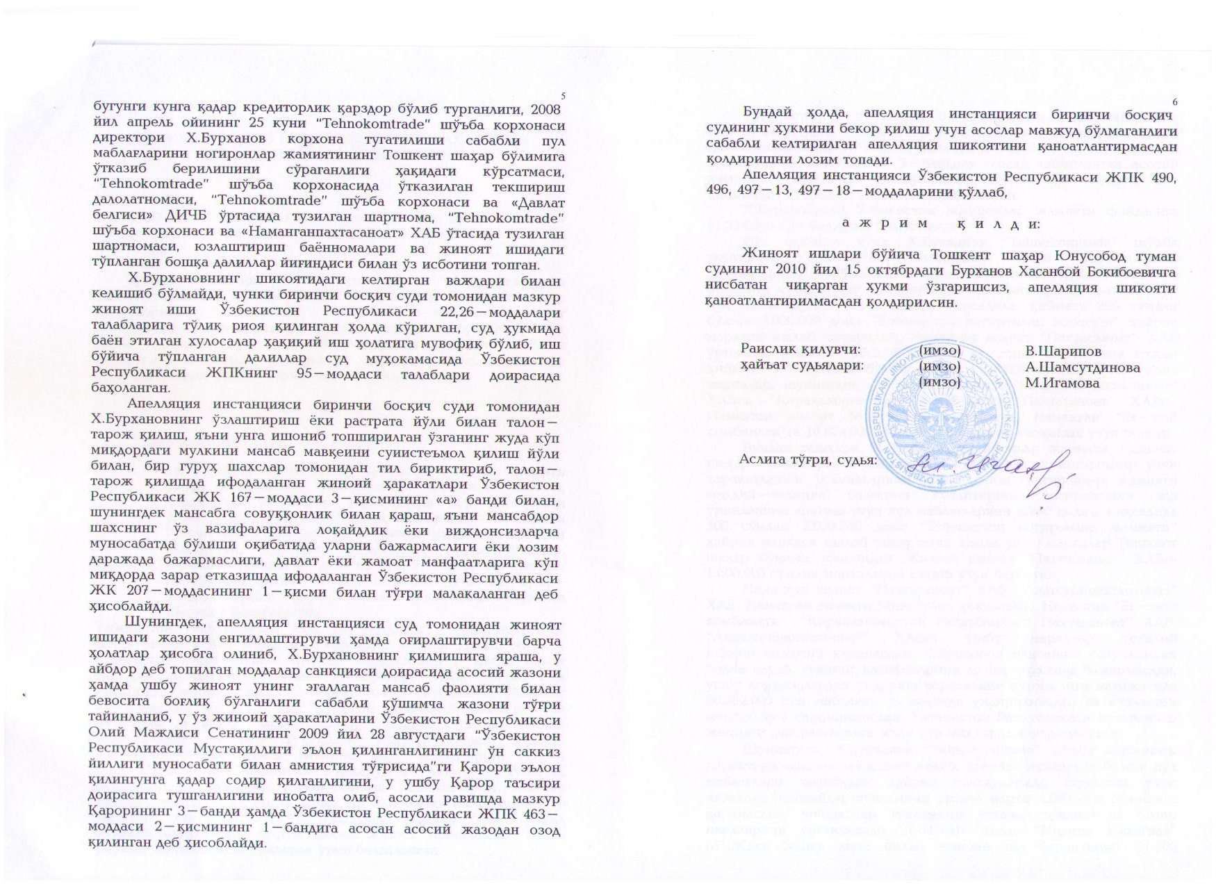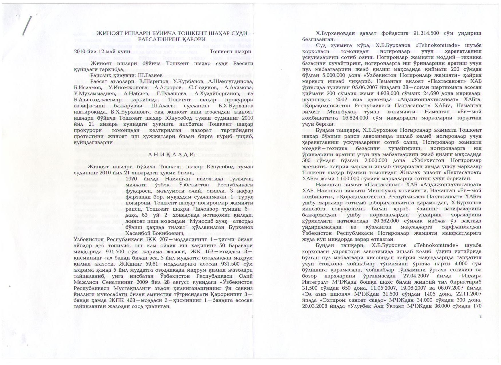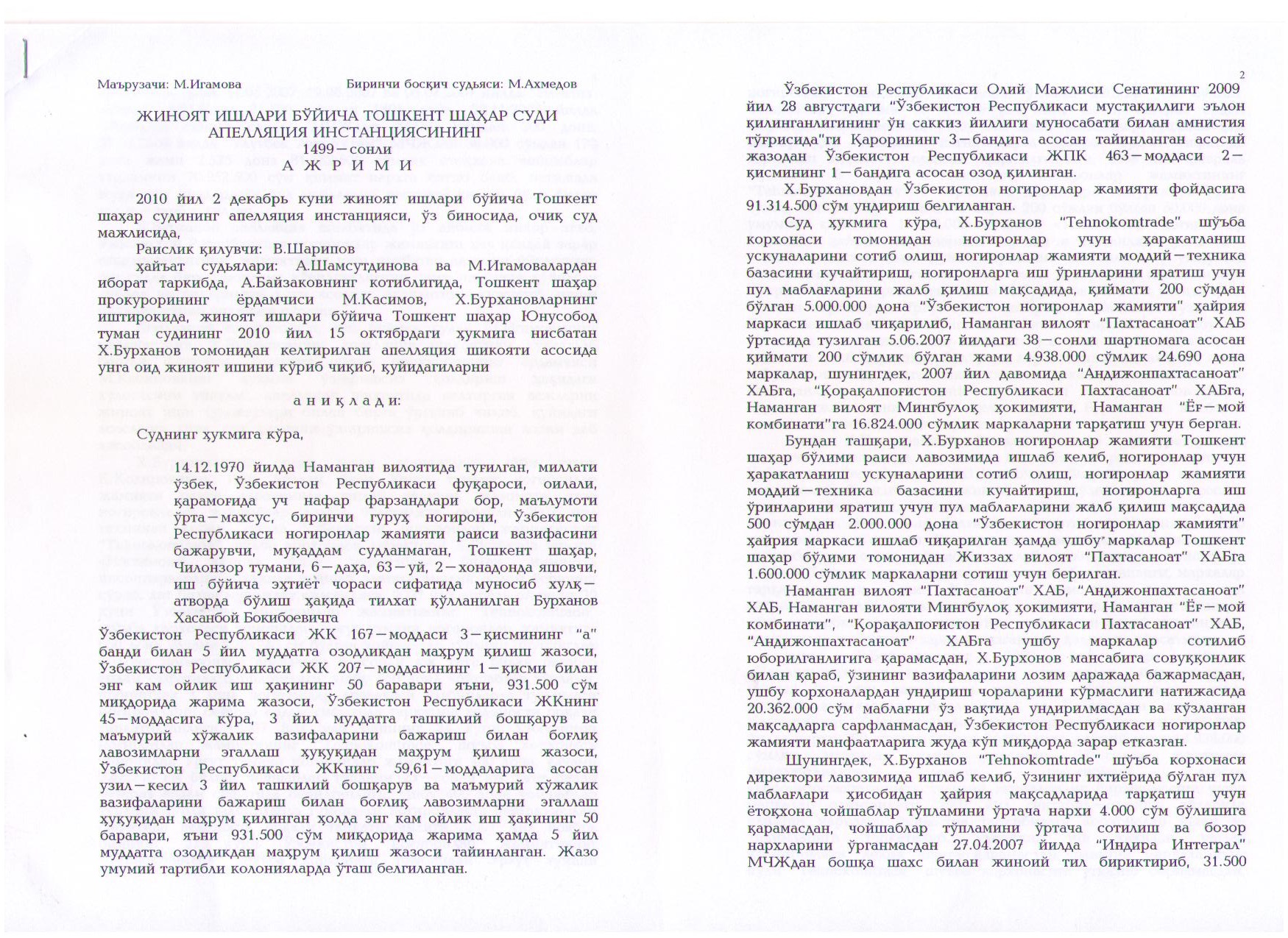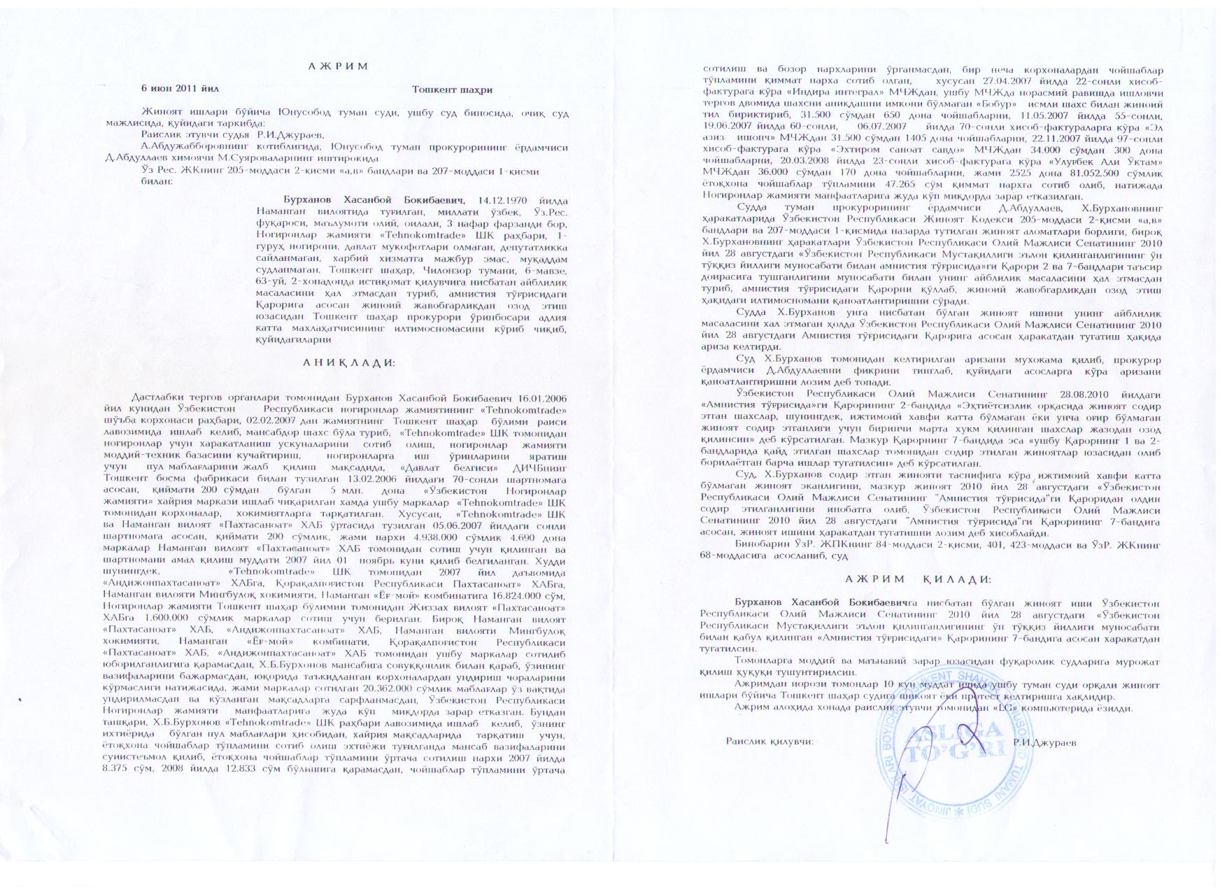 21.01.2010 года Суд по уголовным делам Юнусабадского района г. Ташкента под председательством Судьи Р. Бакиевой вынес Приговор о признании Бурханова виновным по статьям: 167 часть 3 пункт “а” и 207 часть 1 УК РУз., постановив взыскать с Бурханова 92 246 000 Сум пользу государства.