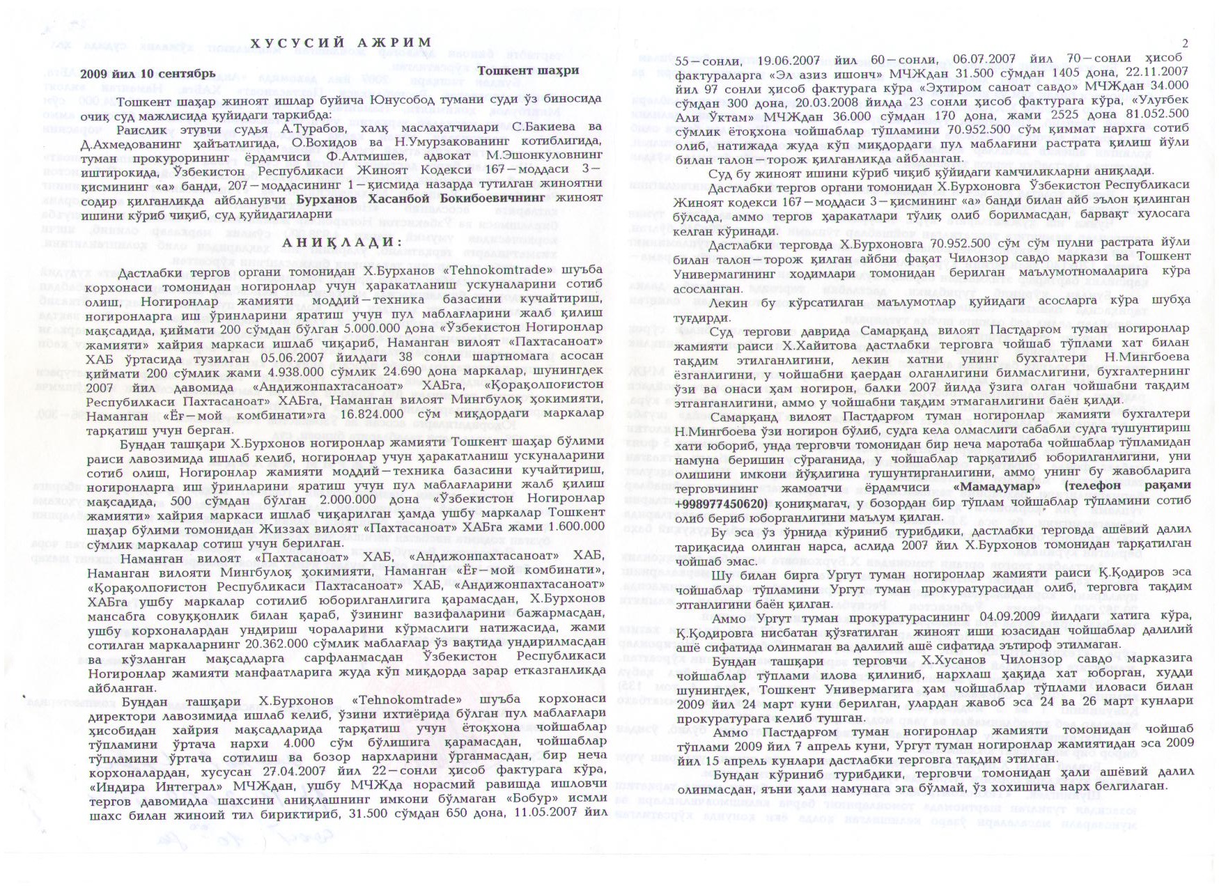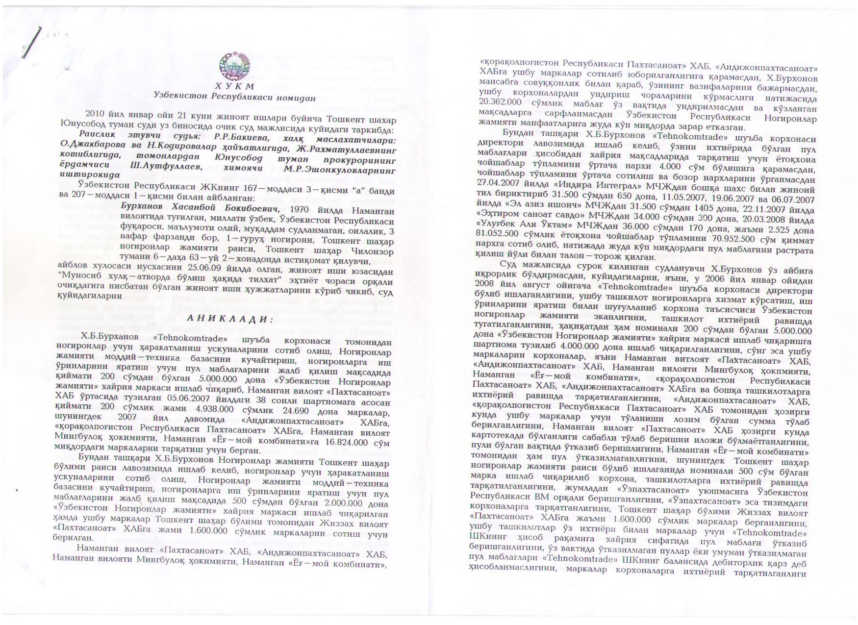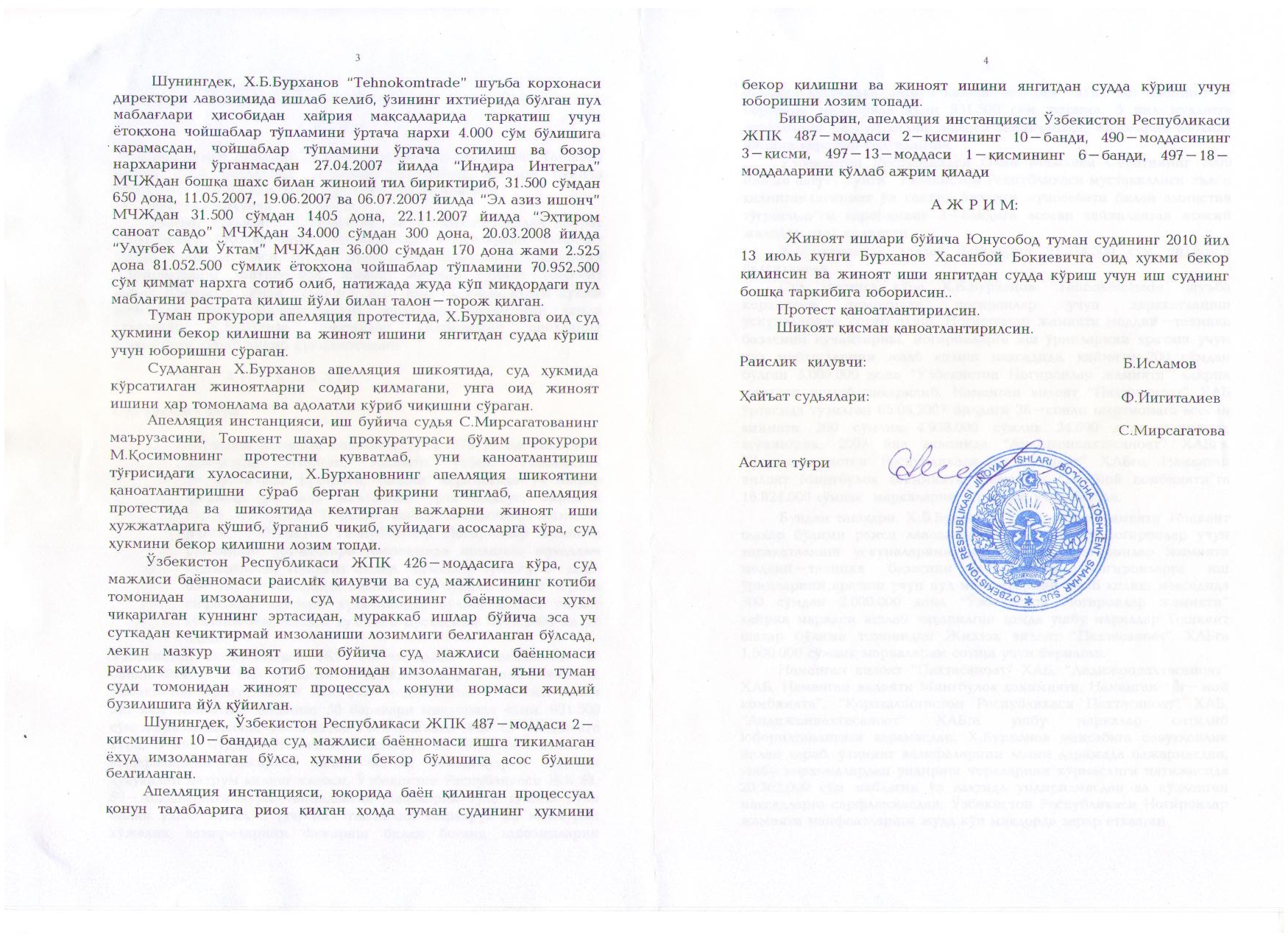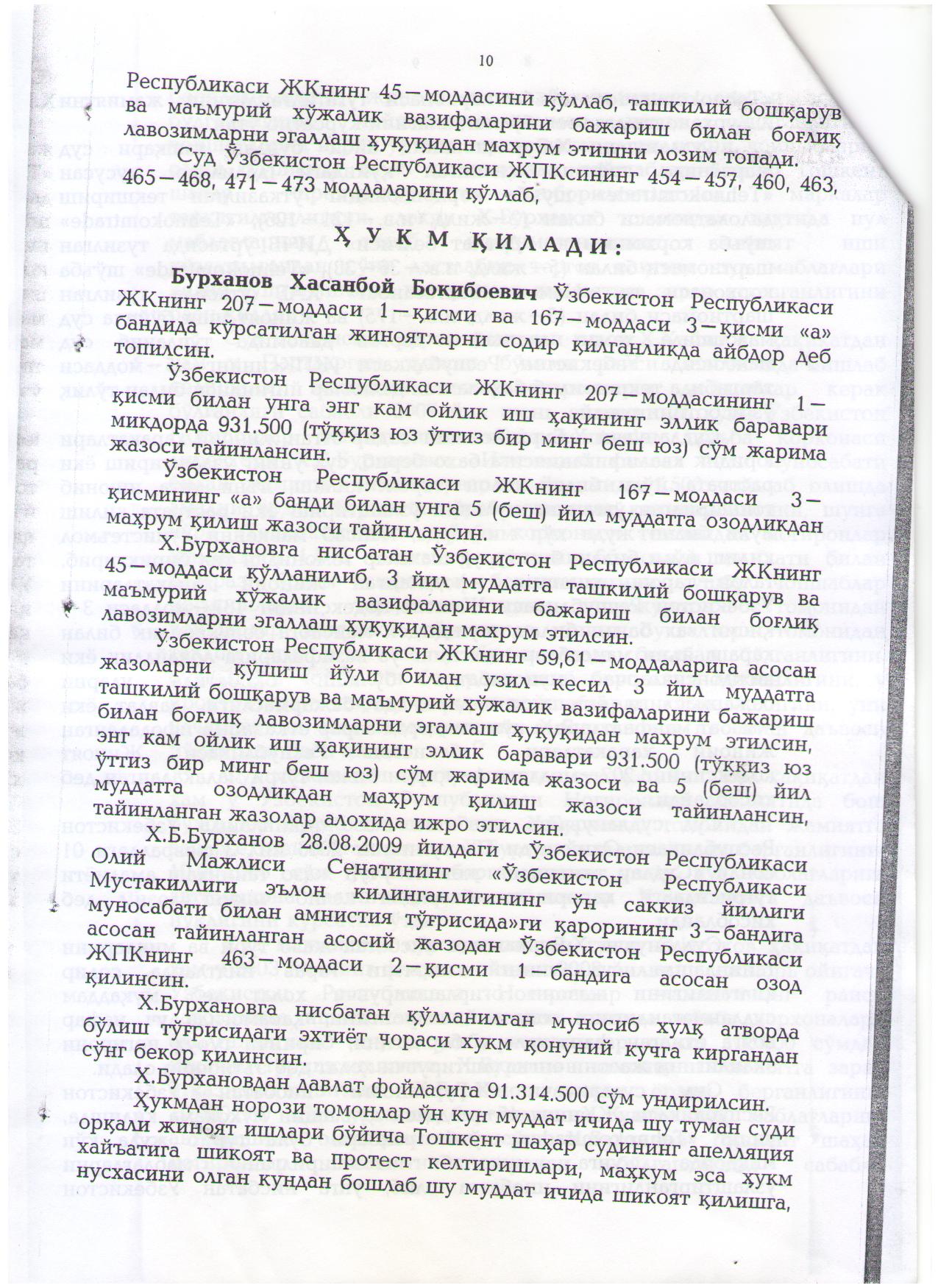 21.01.2010 года Суд по уголовным делам Юнусабадского района г. Ташкента под председательством Судьи Р. Бакиевой вынес Приговор о признании Бурханова виновным по статьям: 167 часть 3 пункт “а” и 207 часть 1 УК РУз., постановив взыскать с Бурханова 92 246 000 Сум пользу государства.