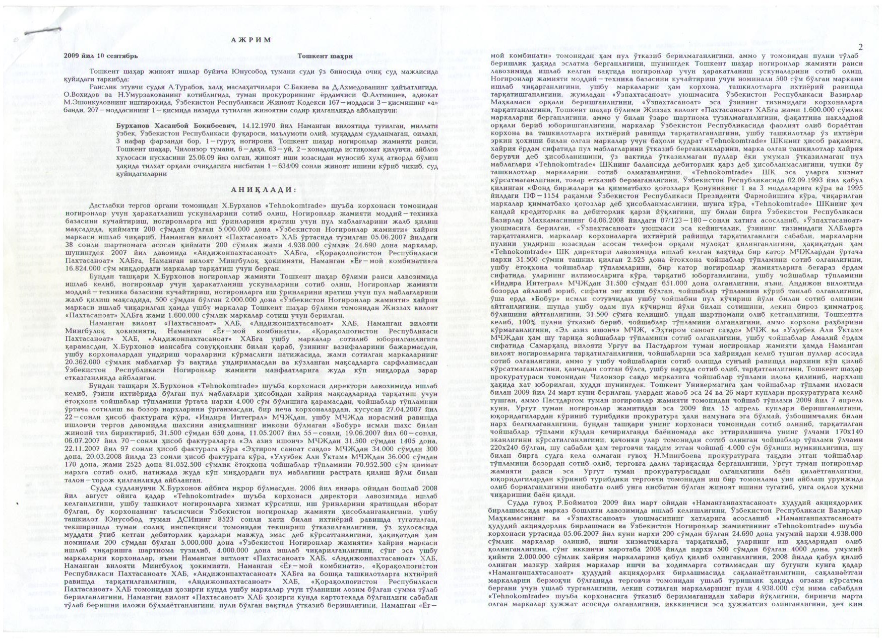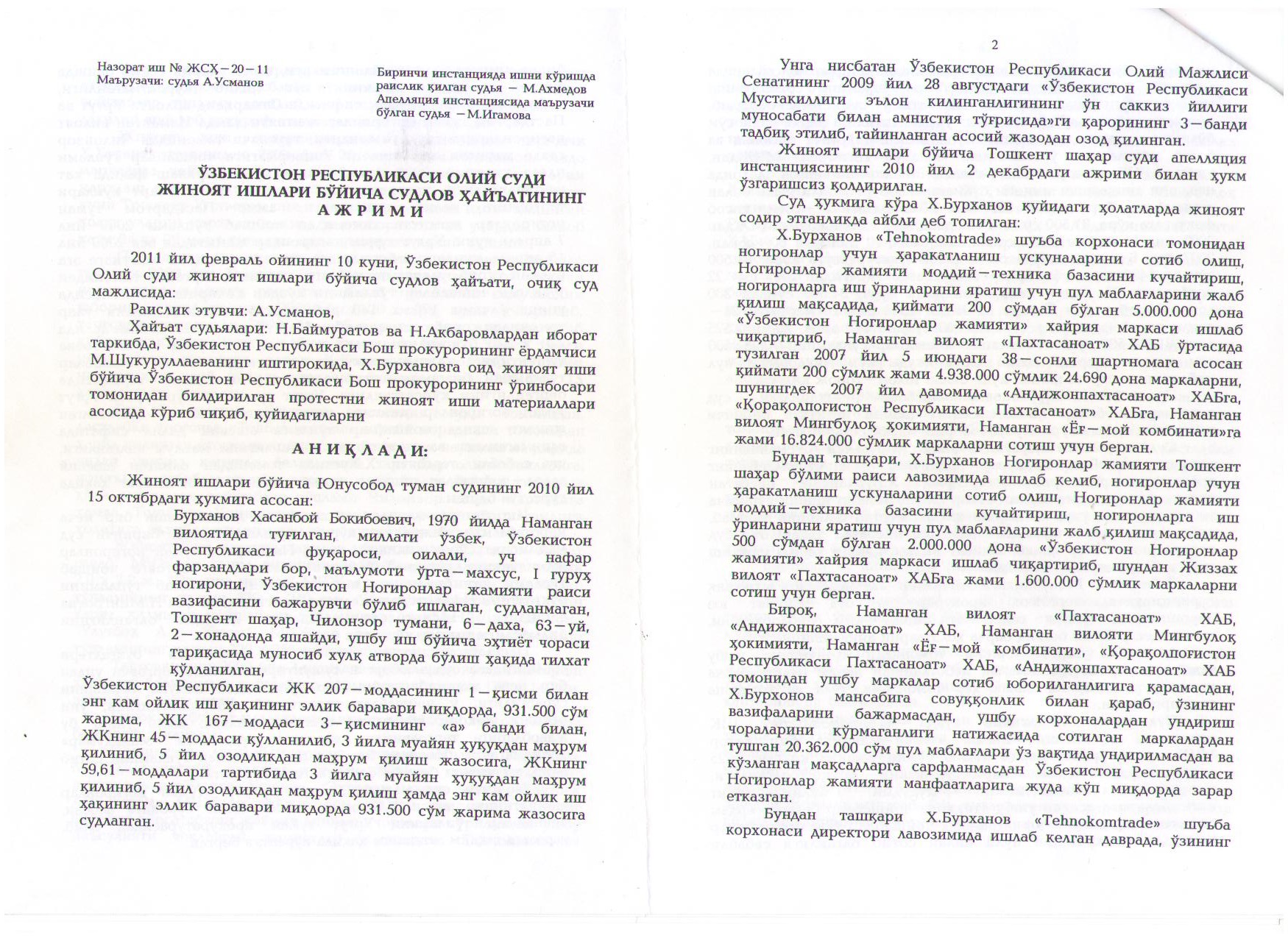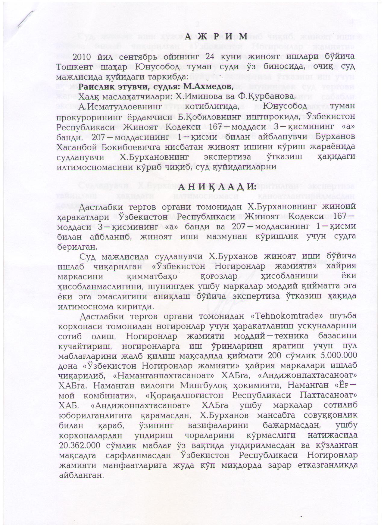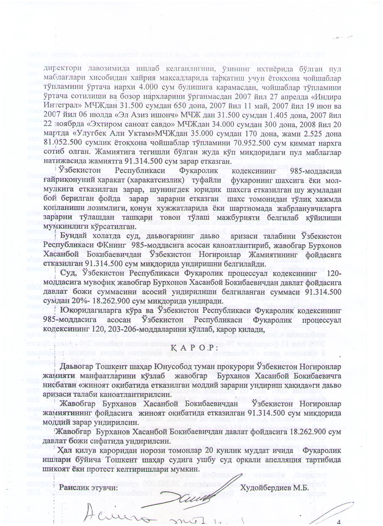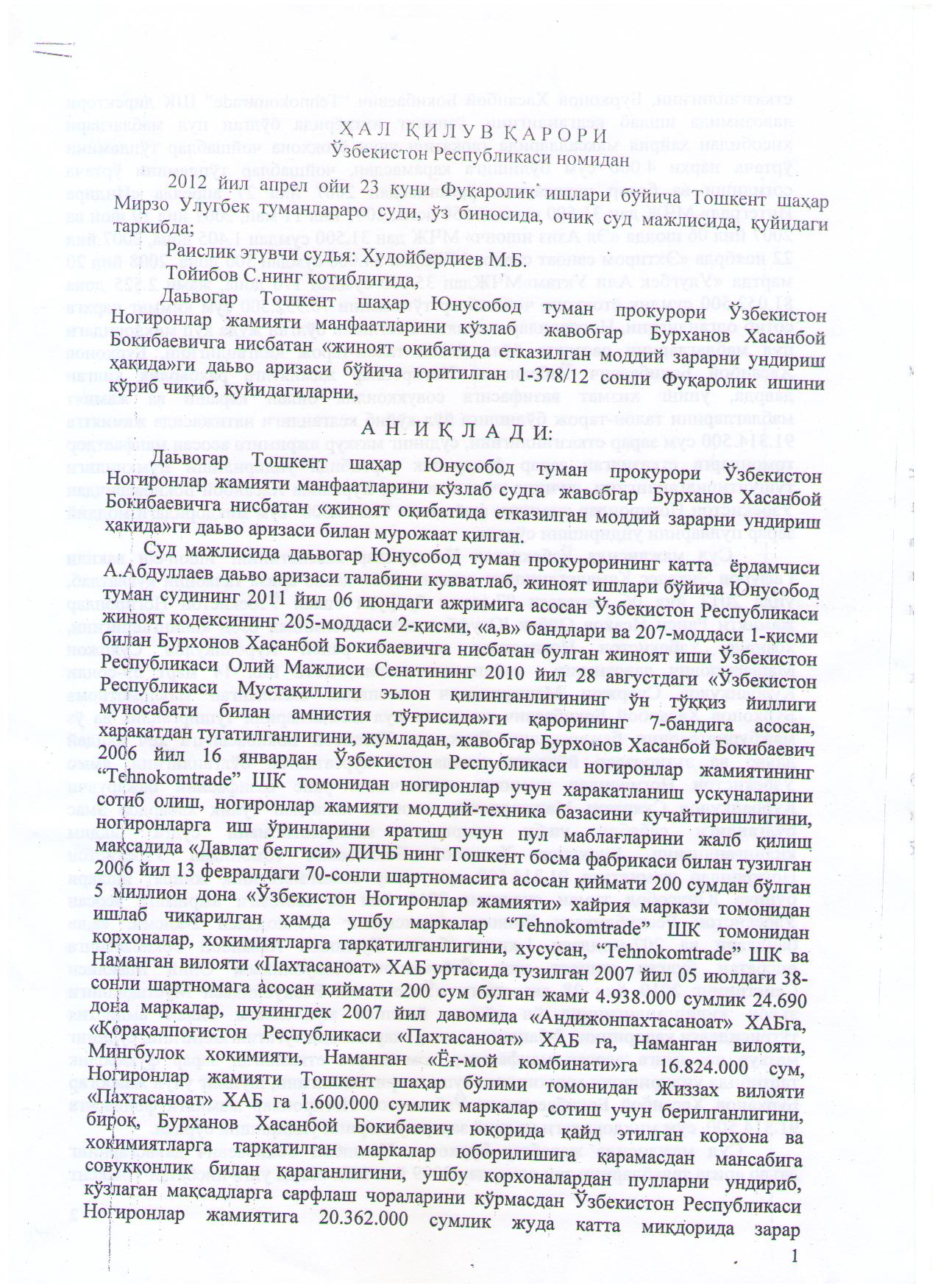 21.01.2010 года Суд по уголовным делам Юнусабадского района г. Ташкента под председательством Судьи Р. Бакиевой вынес Приговор о признании Бурханова виновным по статьям: 167 часть 3 пункт “а” и 207 часть 1 УК РУз., постановив взыскать с Бурханова 92 246 000 Сум пользу государства.