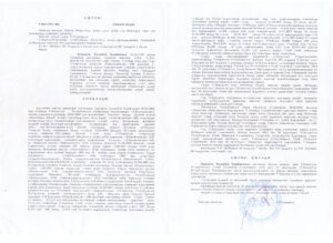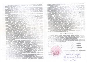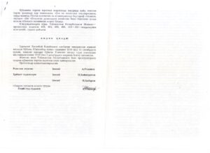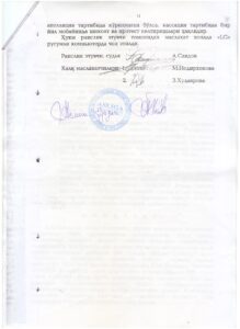 На основании этого документа следователь Таджибаев переквалифицировал статью 167 часть 3 пункт “а” на статью 205 часть 2 пункт “а” и “в” (Злоупотребление властью или должностными полномочиями), а статью 207 часть 1 (Должностная халатность) оставил без изменения. 06.06.2011 года пятый состав Суда по уголовным делам Юнусабадского района под председательством Судьи Р. Джураева вынес Определение, на основании статьи 7 Постановления Сената Олий Мажлиса Узбекистана “Об амнистии в связи с 19 годовщиной провозглашения независимости Республики Узбекистан”, прекратить производство по уголовному делу в отношении Бурханова.