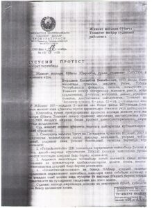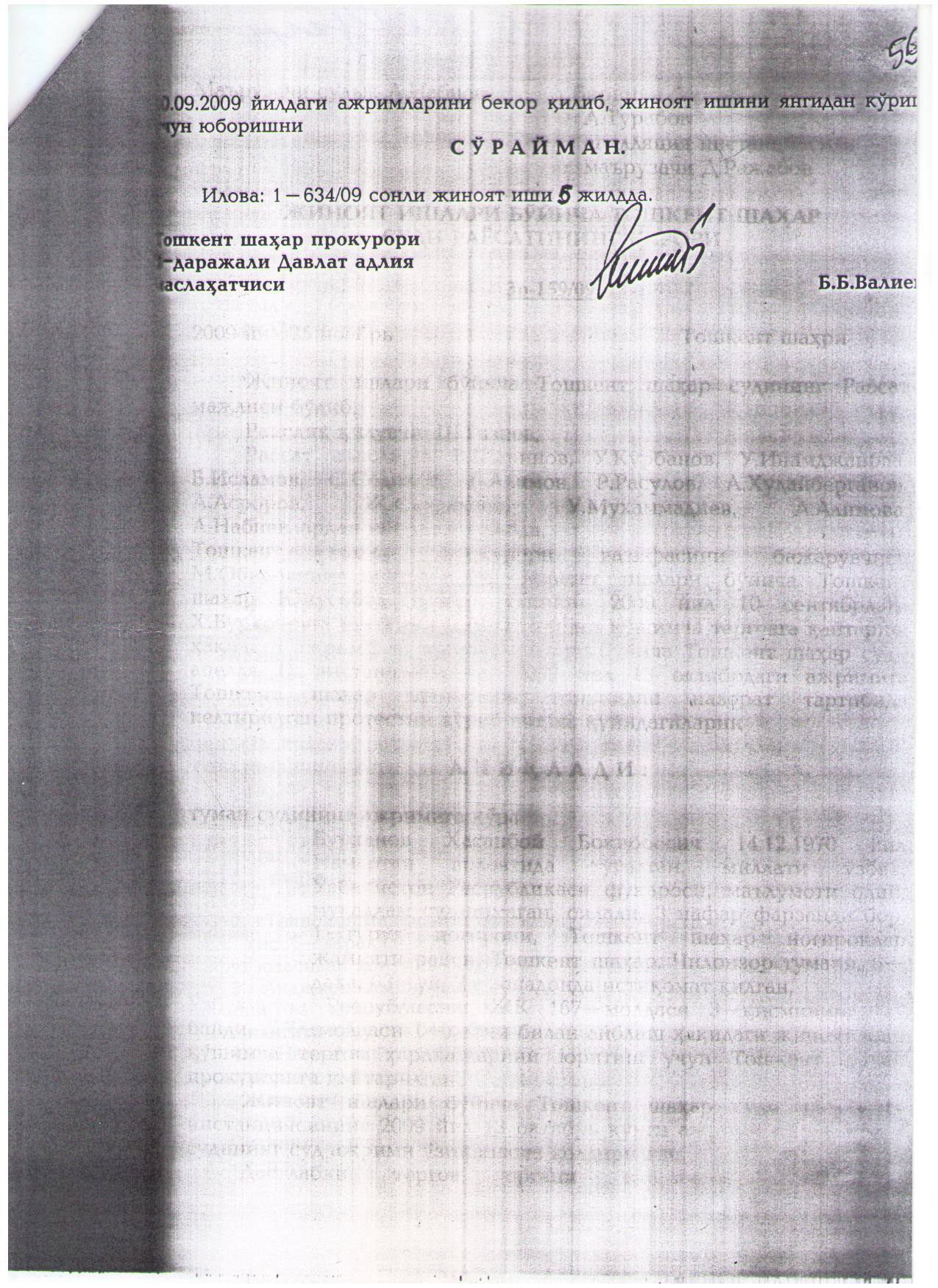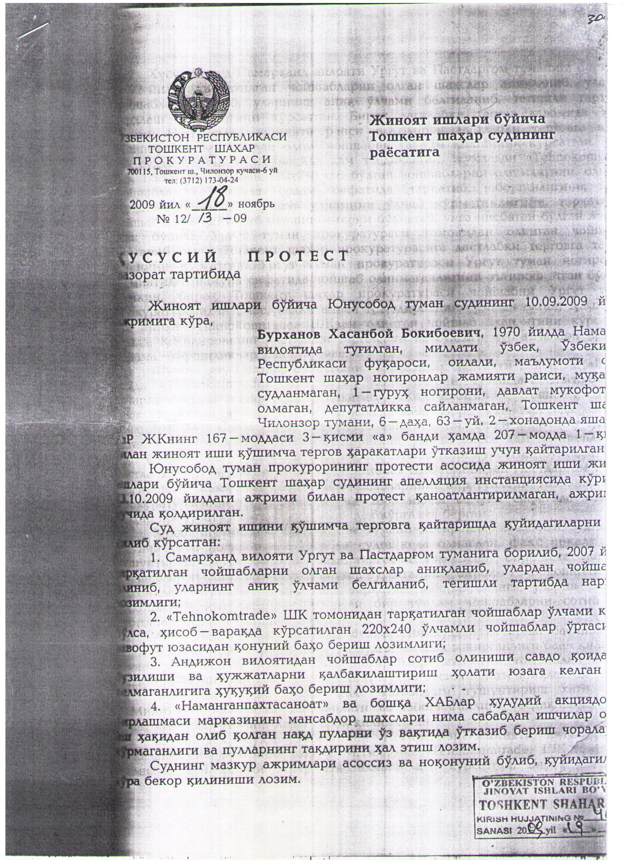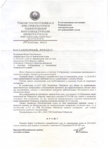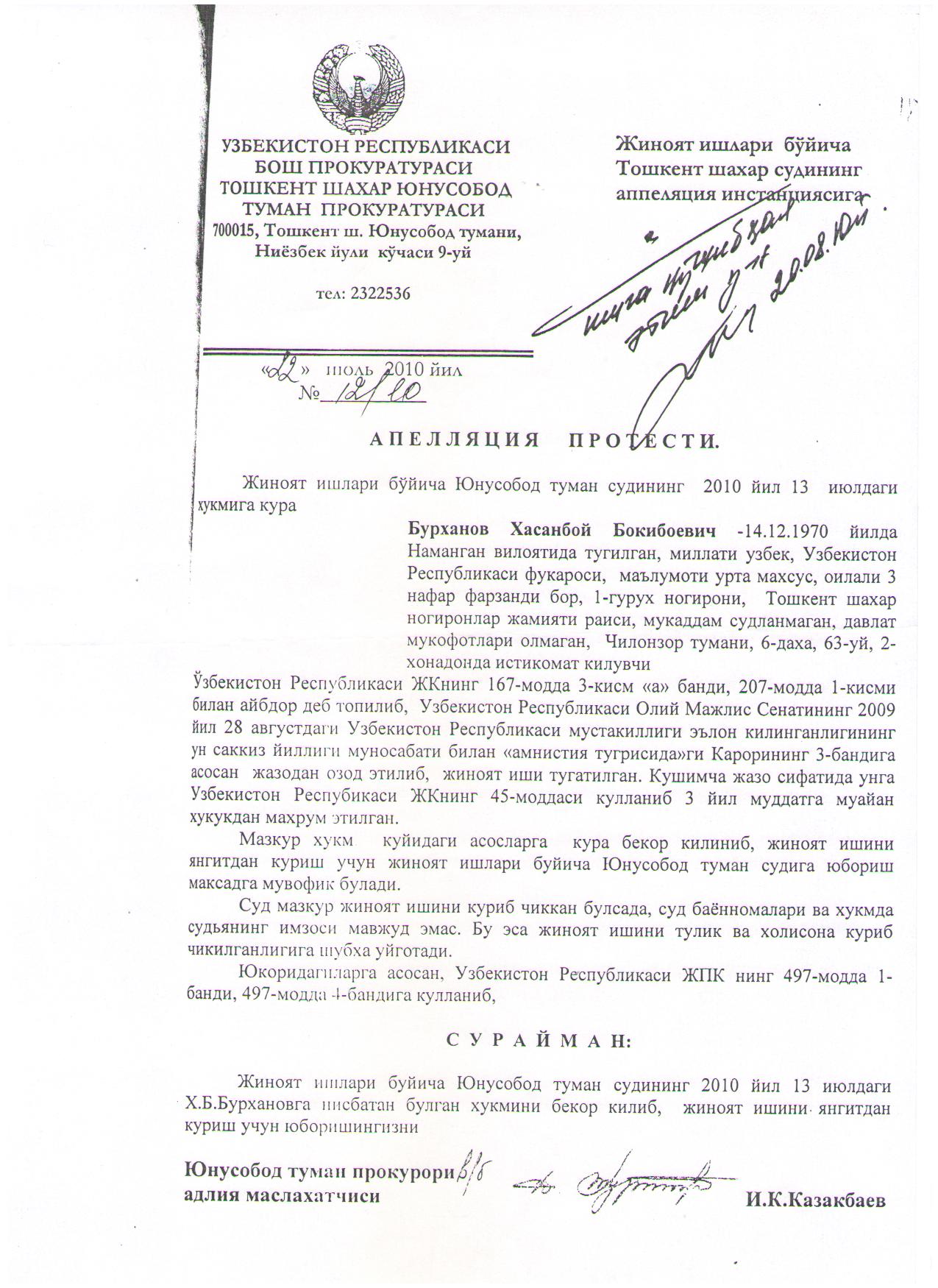 Аргументируя тем, что протокол судебного заседания и Приговор Судьи А. Саидова не был завизирован, 22.07.2010 г. прокурор Юнусабадского района И. Казакбаев внёс Протест в апелляционную инстанцию Ташкентского городского суда по уголовным делам.