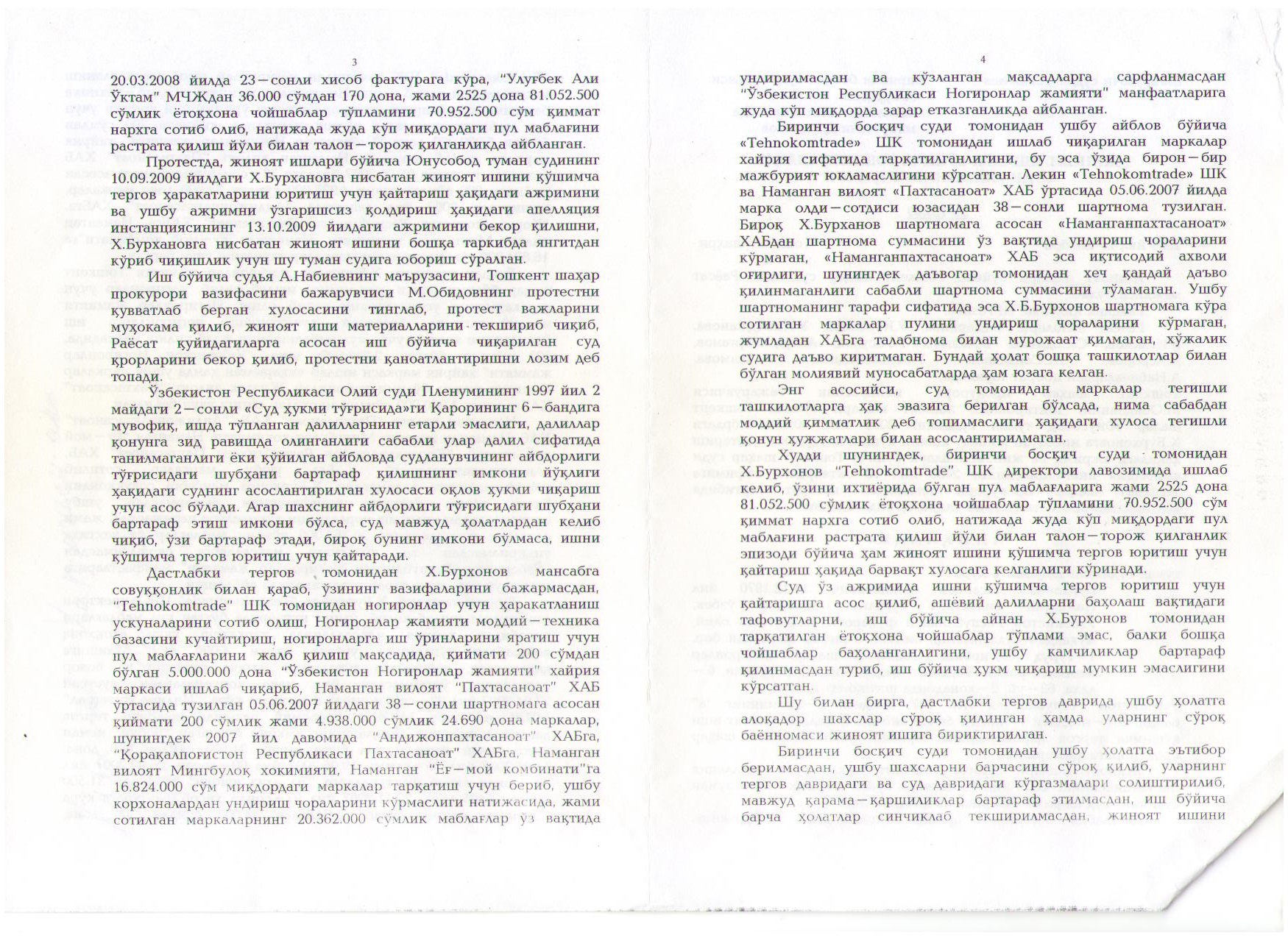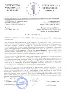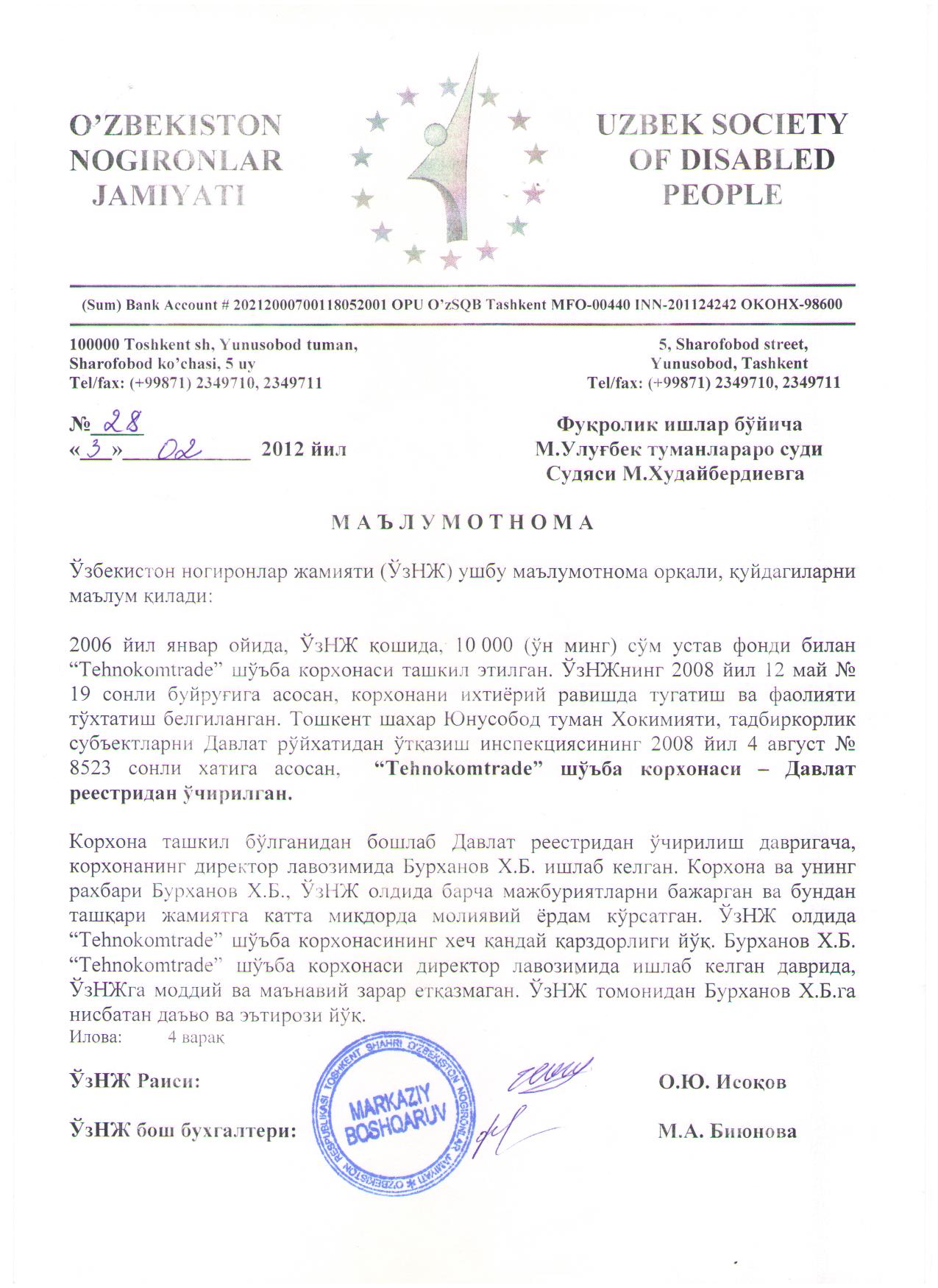 03.02.2012 и 14.03.2012 г. года Узбекское общество инвалидов в очередной раз в письменной форме проинформировало суд о невиновности Бурханова.