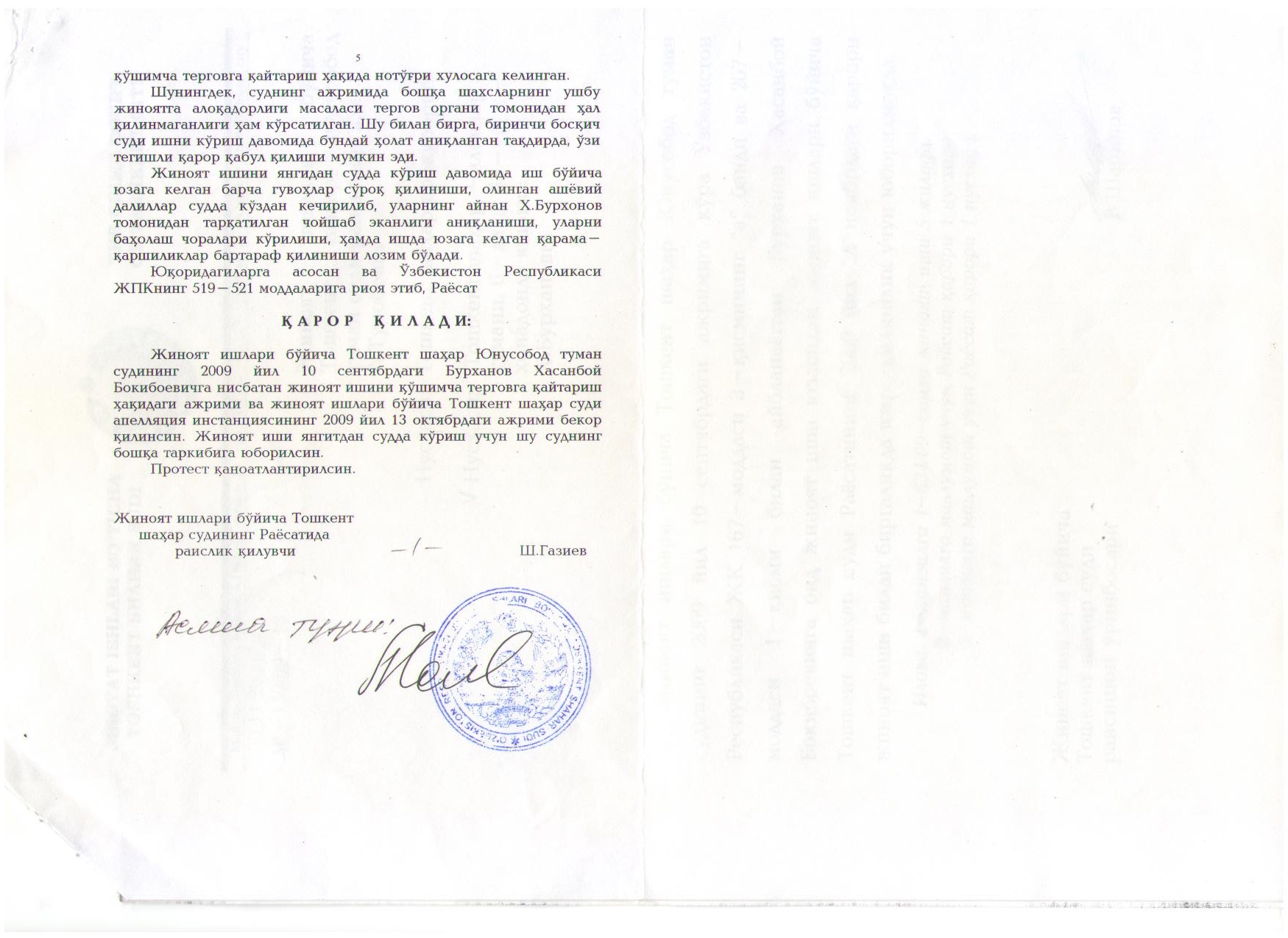12.05.2010 года Президиум Суда по уголовным делам г. Ташкента под Председательством Ш. Газиева в очередной раз принял Решение, в полном объёме удовлетворяющее протест столичного прокурора Валиева.