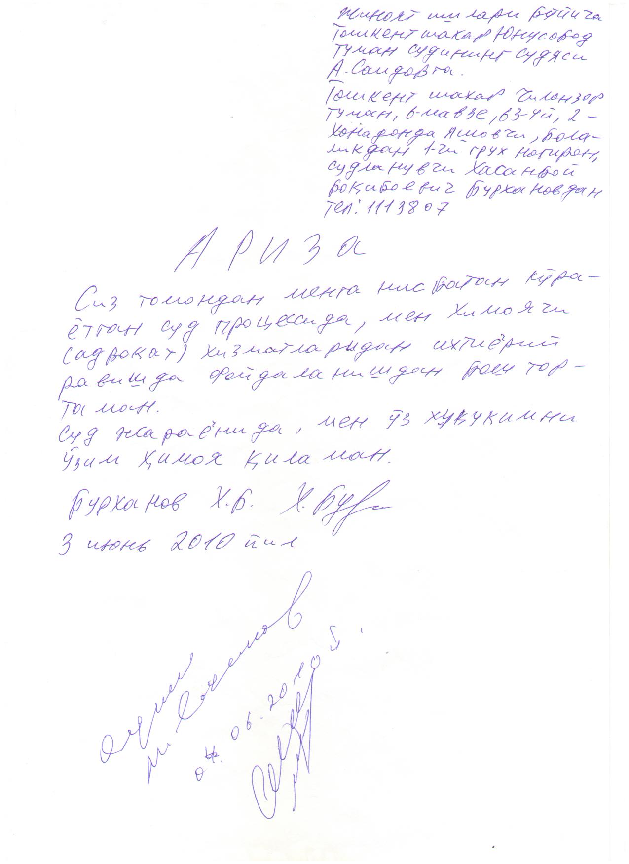 Устав от долгих унизительных процессов, Бурханов написал заявление Судье А. Саидову об отказе от услуг адвоката и намерении самостоятельно защищать свои права.