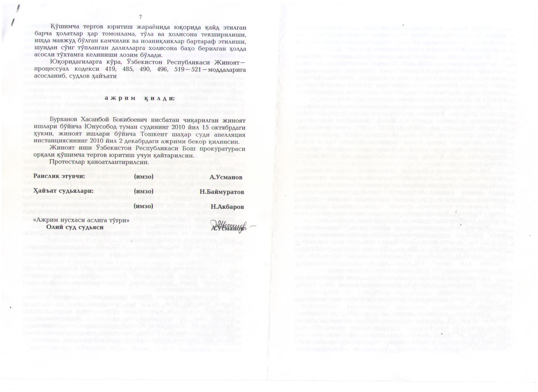 На основании протеста заместителя Генерального прокурора Узбекистана, 10.02.2011 г. судебная коллегия Верховного Суда по уголовным делам Республики Узбекистан постановила аннулировать Приговора Судьи Ахмедова от 15.10.2010 г. и Определение апелляционной инстанции за номером № 1499 в отношении Бурханова.