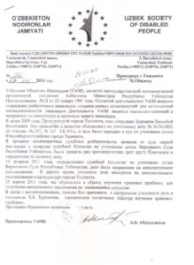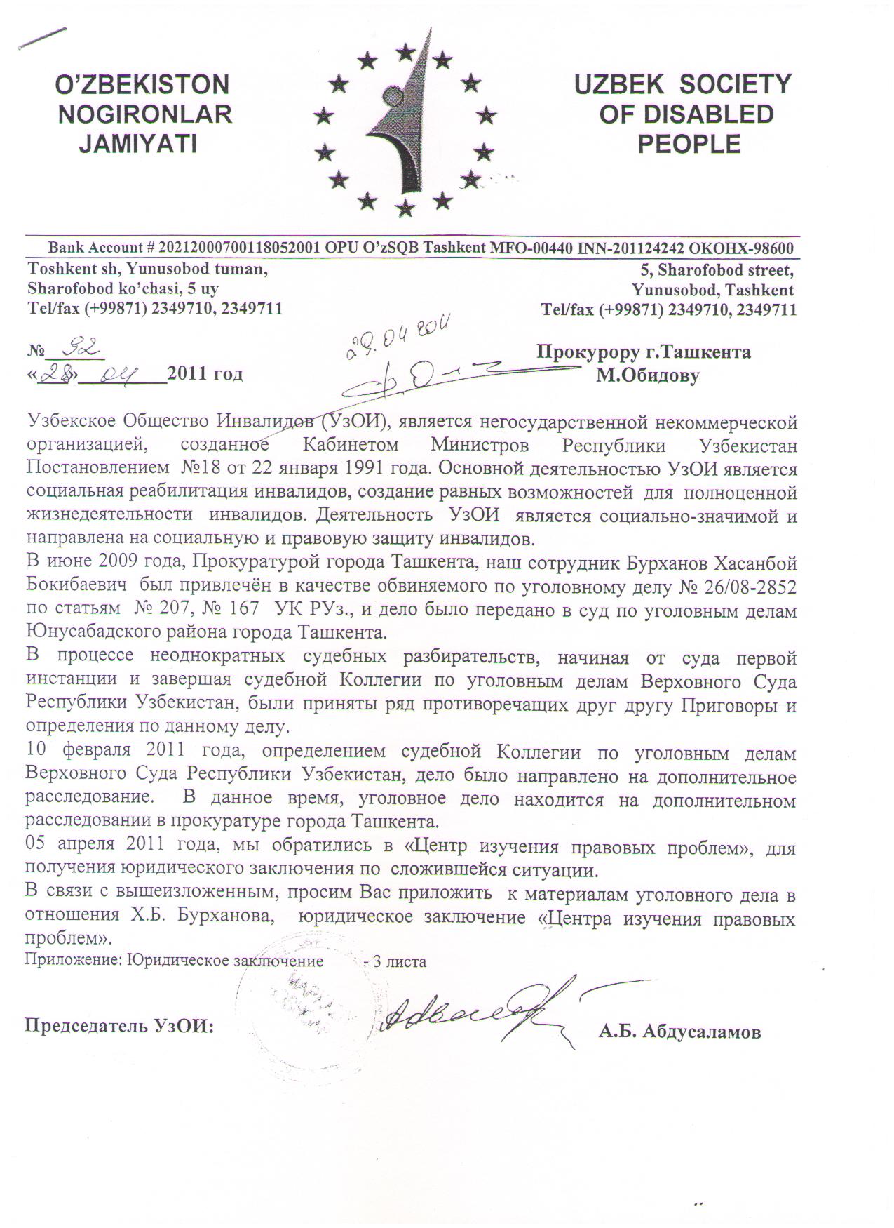 В апреле 2011 года Узбекское общество инвалидов направило два документа в прокуратуру г. Ташкента. В первом документе общество детально информировало прокуратуру об отсутствии ущерба для организации, в котором был обвинен Бурханов.
