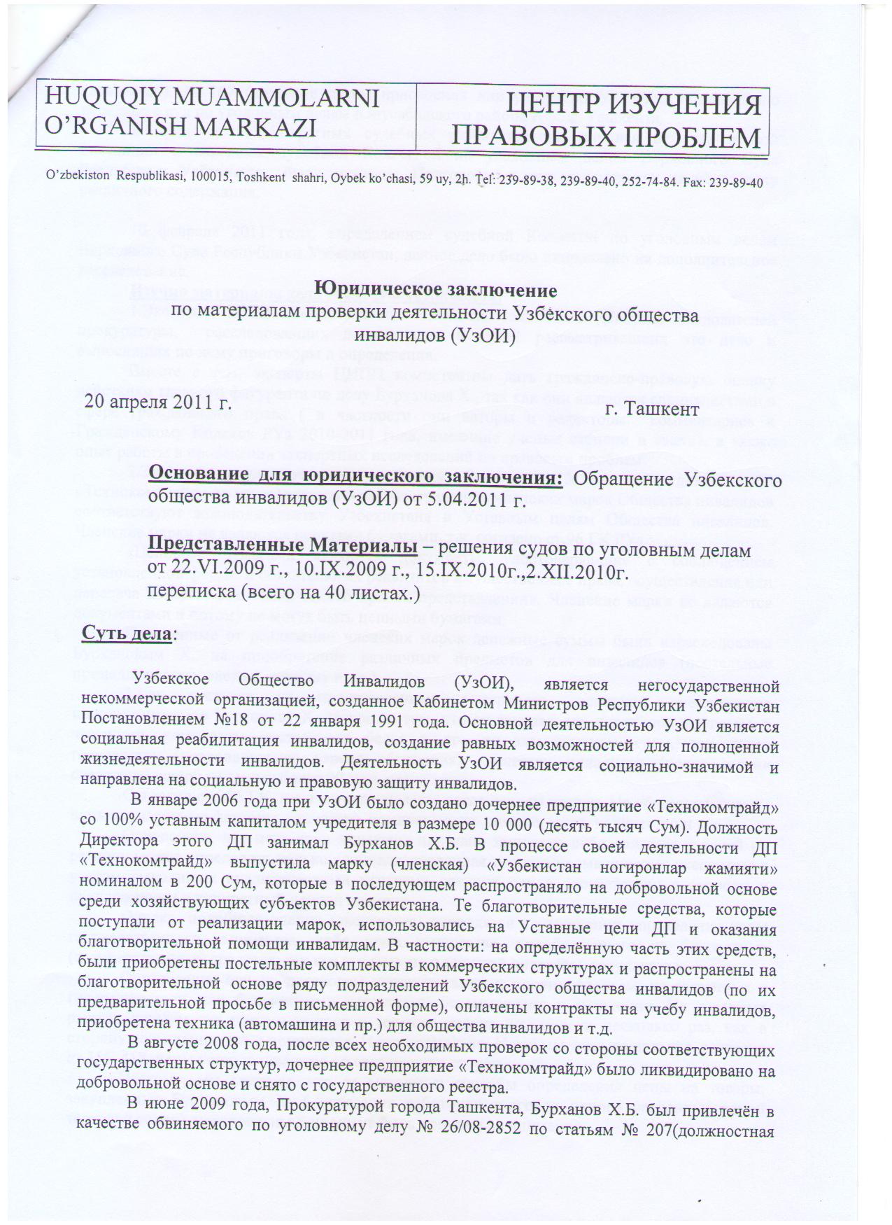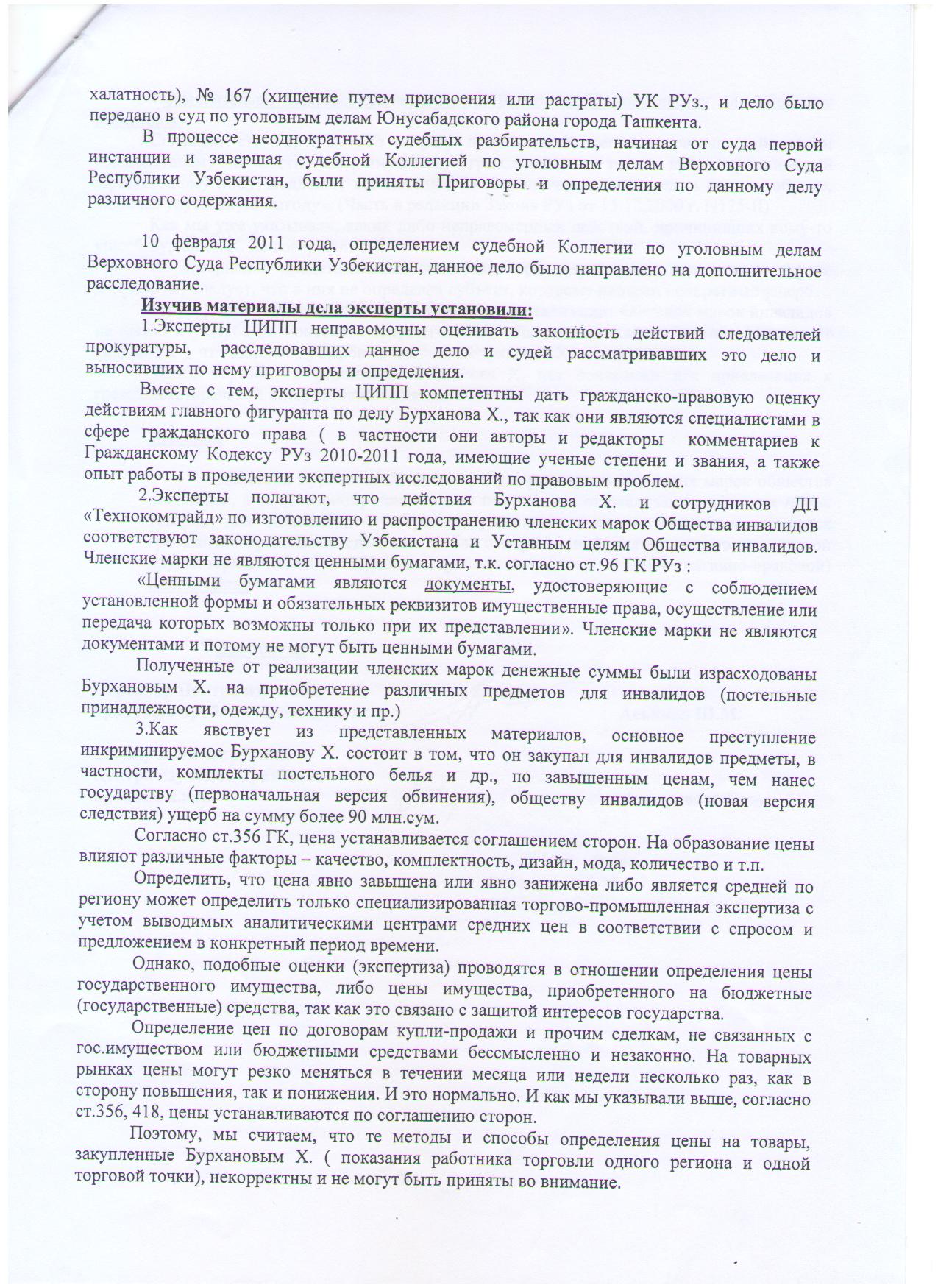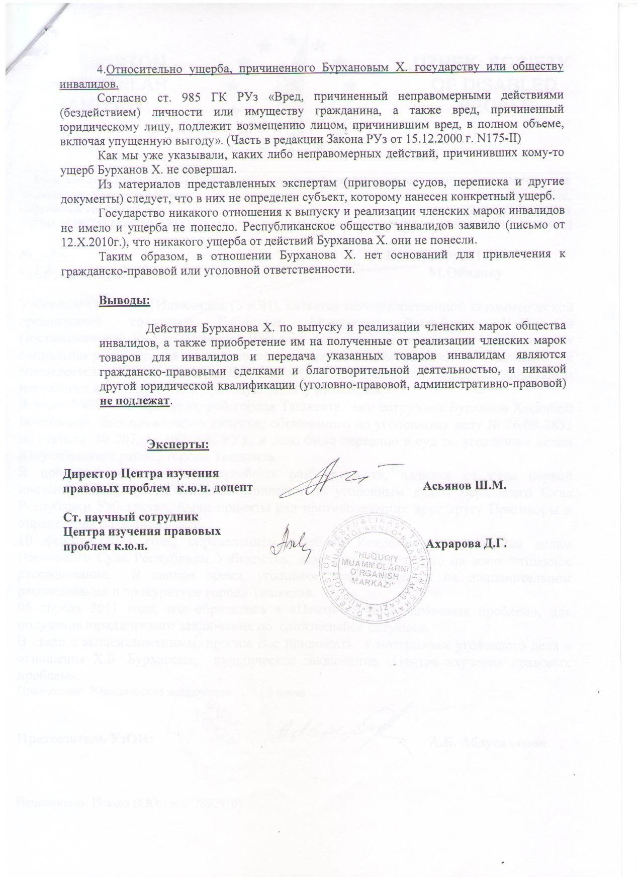 Вторым документом было юридическое заключение по делу Бурханова, подготовленное Центром изучения правовых проблем города Ташкента.