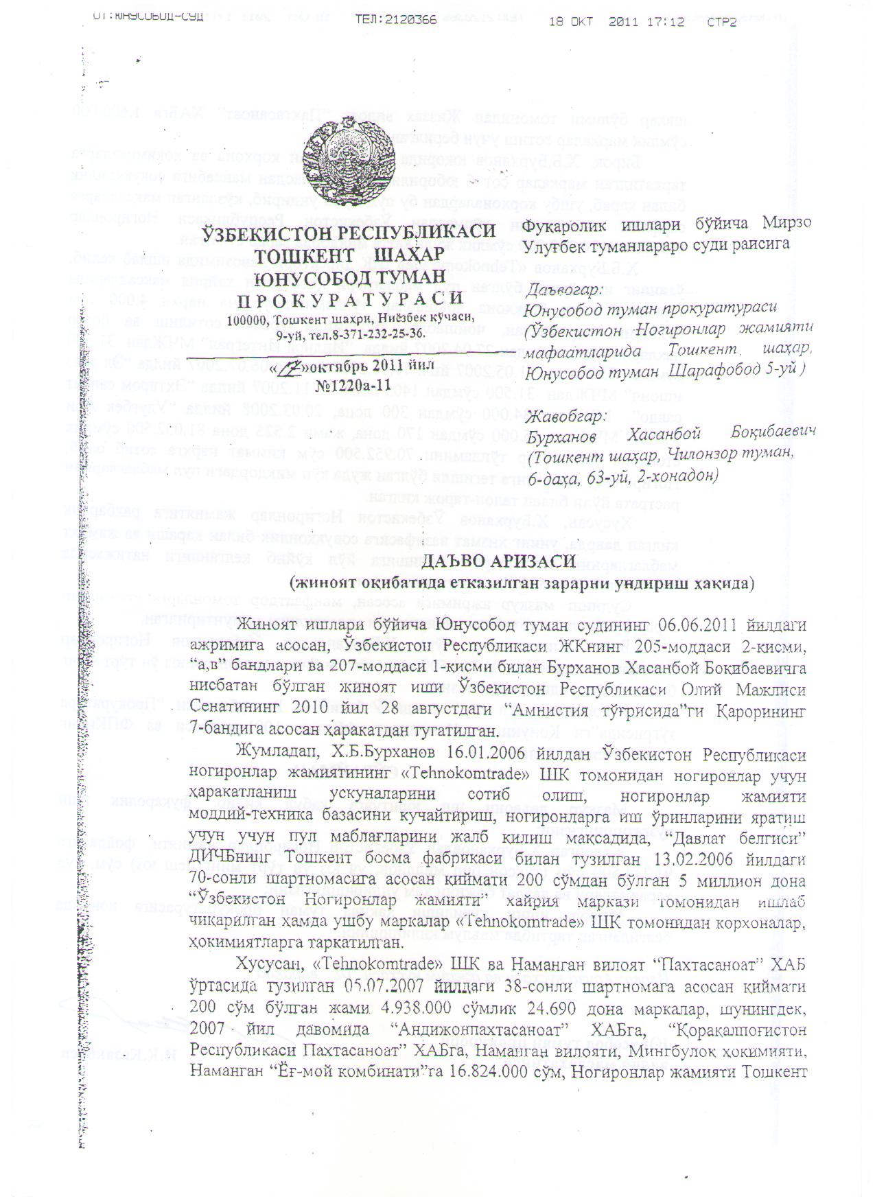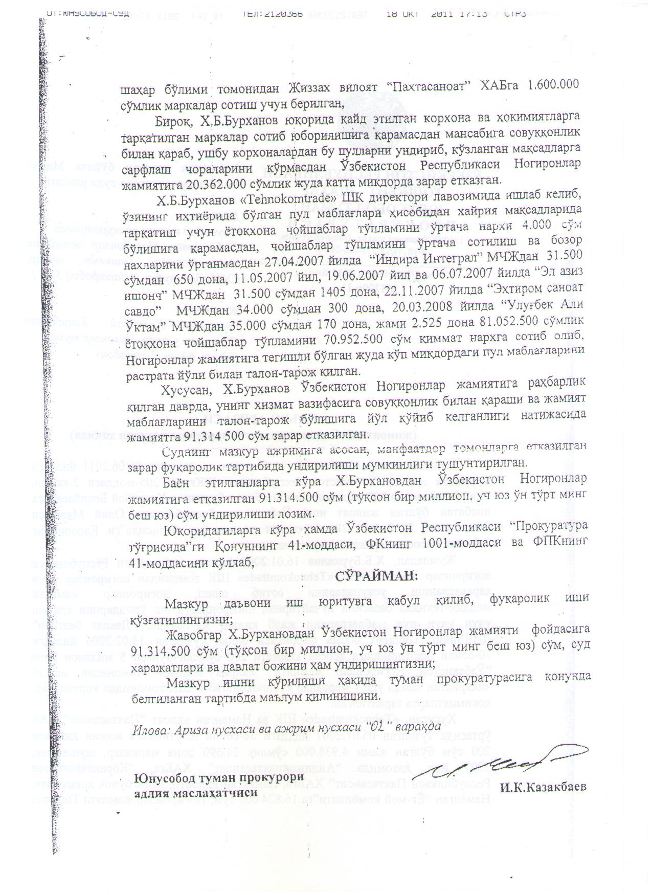 17.10.2011 года Прокурор Юнусабадского района И. Казакбаев внёс в Мирзо-Улугбекский межрайонный суд по гражданским делам Исковое заявление № 1220а-11 о возмещении причиненного ущерба от преступления. В исковом заявлении Прокурор И. Казакбаев просил суд взыскать с Бурханова в пользу Узбекского общества инвалидов сумму в размере 91 314 500 Сум, а так же расходы суда и государственную пошлину.