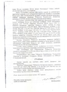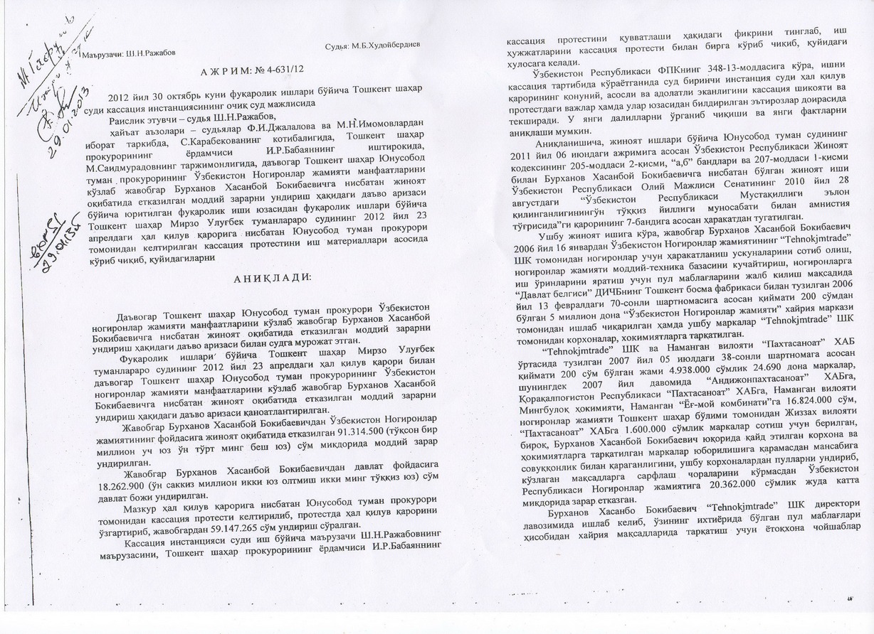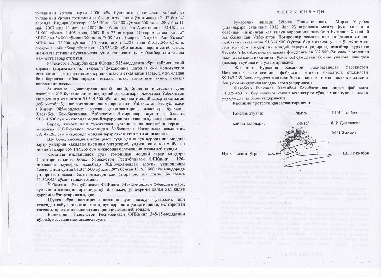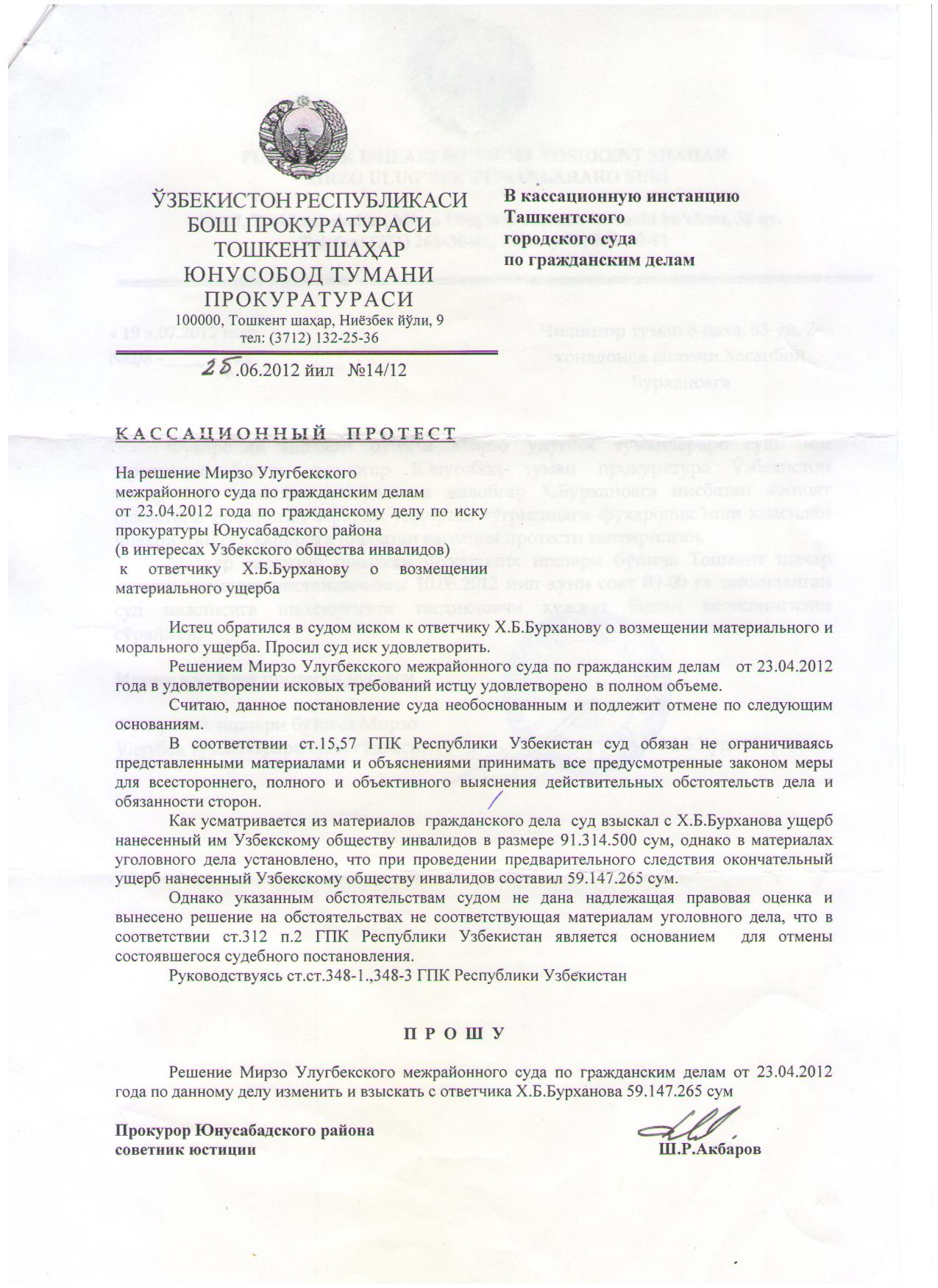 25.06.2012 новый Прокурор Юнусабадского района Ш.Акбаров внёс Касационный Протест 14/12 в кассационную инстанцию Ташкентского городского суда по гражданским делам, в котором просил суд изменить Решение Судьи М. Худайбердыева и взыскать с ответчика Бурханова 59 147 265 Сум.