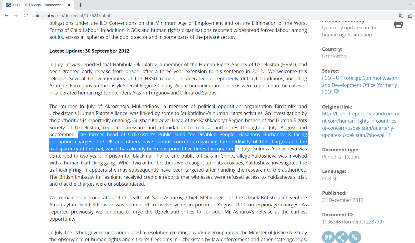 В Докладе о правах человека и демократии за 2012 год Министерства иностранных дел и по делам Содружества Великобритании о деле Бурханова написано следующее: “Бывший руководитель Общественного фонда инвалидов Узбекистана Хасанбой Бурханов обвиняется в коррупции. У Великобритании и других стран есть серьезные опасения относительно достоверности обвинений и прозрачности судебного процесса, который уже пять раз откладывался в этом квартале”.