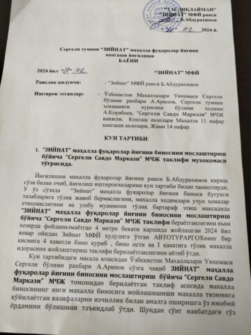 Mahalla institutidan qonuniy himoya sifatida foydalanib, Toshkent shahar hokimi Shavkat Umurzoqov 2024-yilda Sirg’ali tumanidagi avtoturargohni “Ziynat” mahallasiga o’tkazish to’g’risida qaror chiqargan edi. 2024-yil 10-fevral kuni, “Ziynat” mahalla fuqarolar yig’ini raisi Bekmirza Abdurahimov yig’ilish o’tkazib, to’rt qavatli bino qurish sharti bilan, avtoturargohning yer maydoni bir qismini – “Sergeli Savdo Markazi” mas’uliyati cheklangan jamiyatiga o’tkazib berish to’g’risida kengash qarorini chiqargan edi.