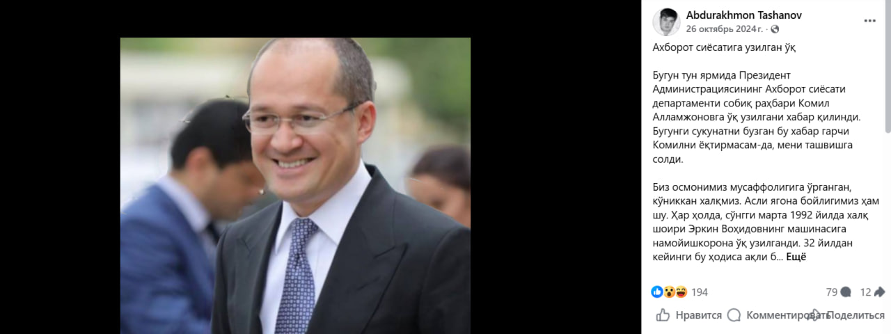 Biroq, ertasi, 27-oktabr kuni “suiqasddan omon qolgan” Komil Allamjonov, go’yo hech narsa bo’lmagandek, ijtimoiy tarmoqlarda saylov uchastkasidan olingan fotosuratni joylashtirdi va u tirik va sog’-salomat ekanligini ko’rsatdi.