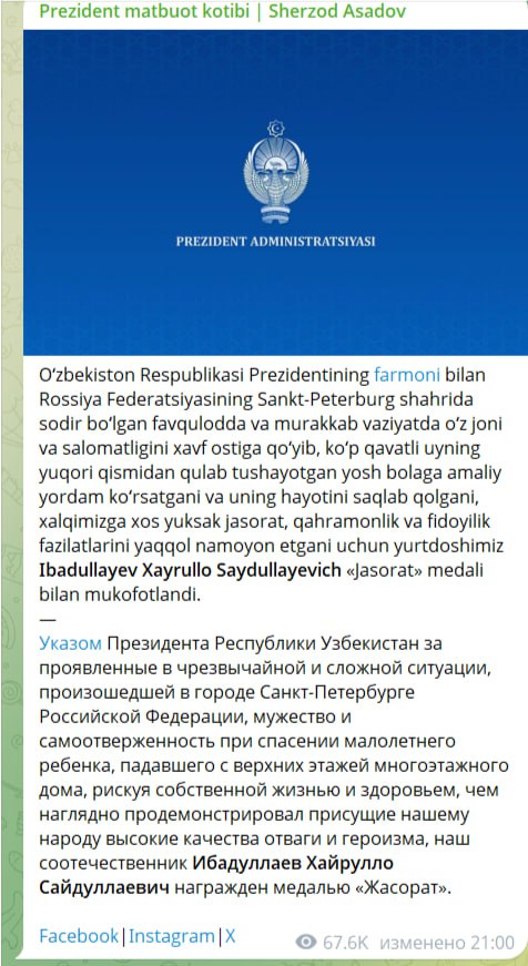 Oʻzbek hokimiyatining kechikkan reaksiyasi (23-fevral kuni soat 21:00 da, Toshkent vaqti bilan), shoshilinch ravishda davlat mukofotini topshirish va rejimning targʻibot mashinasi orqali namoyishkorona qahramonlashtirish bilan birga, gʻamxoʻrlik emas, balki jamoatchilik kun tartibini oʻz qoʻliga olishga urinish boʻldi.